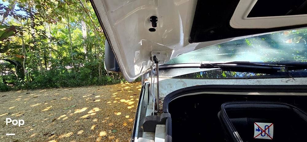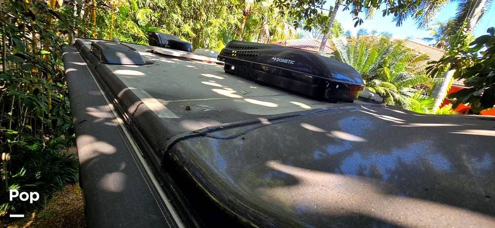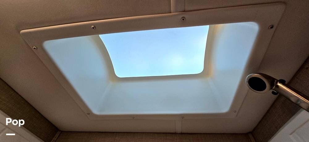 Above the cab, a large bunk area provides room for guests or extra storage, and a privacy curtain hides a built-in skylight.