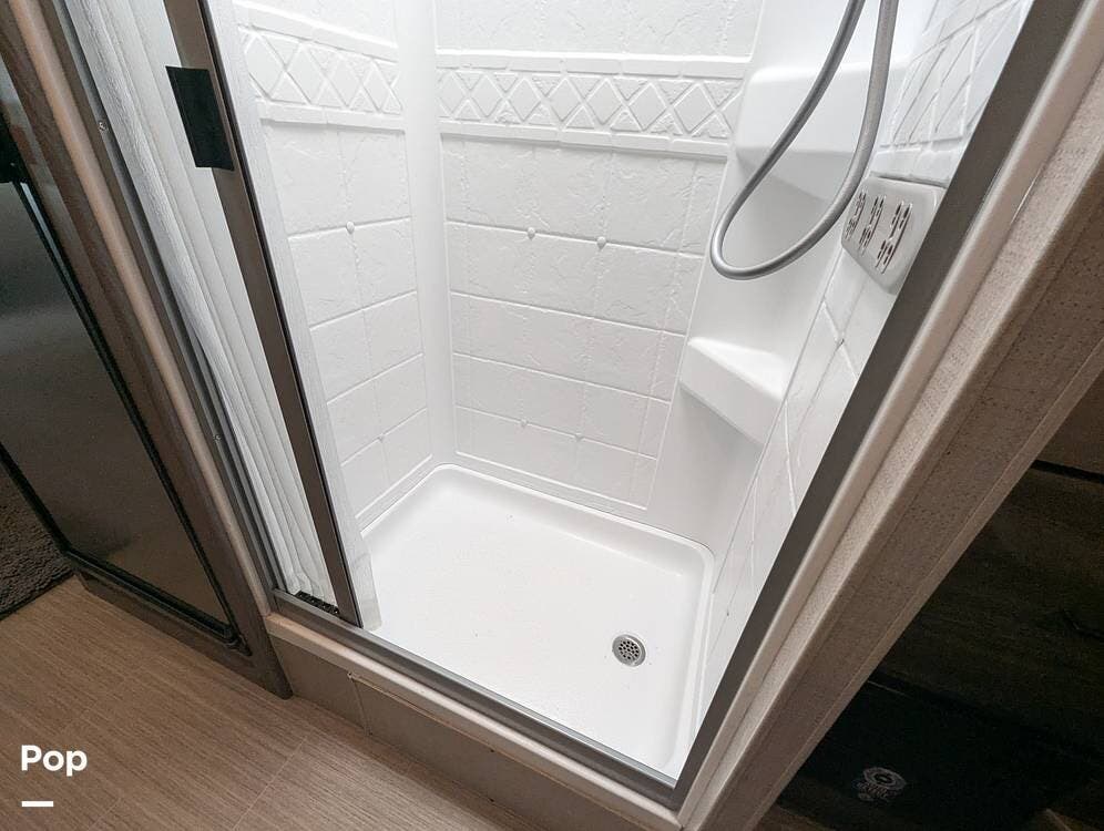 The 24RW is easy to drive and park. It can tow up to 5,000 pounds, and while on the road, you can access most amenities. This Delano sleeps 4-5 comfortably. The rear slide features a queen bed with a small walk-around area on each side. There is a nice wardrobe with storage and drawers for your clothing. This model has a split bathroom with privacy doors.