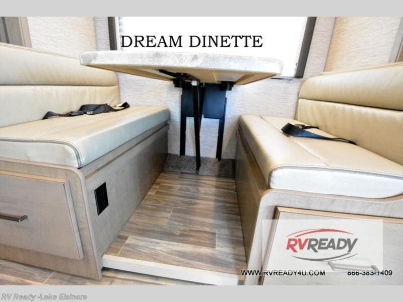 When you are ready to travel with your family or friends, this coach can be the perfect traveling companion! From the rear twin beds with a king conversion and a privacy curtain to the slide out dream dinette and cab over bunk offering more floor space, you can be cozy with one more person or even a few more! The mid-coach full bathroom will keep you clean after a hike, and the kitchen amenities will keep everyone fed with warm meals and the ability to store leftovers in the double door refrigerator. There is a 40" TV on swivel over the cab area to watch your shows or games, yet you might like to add the optional bedroom and/or exterior 32" TV.