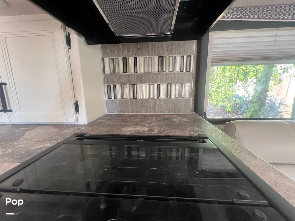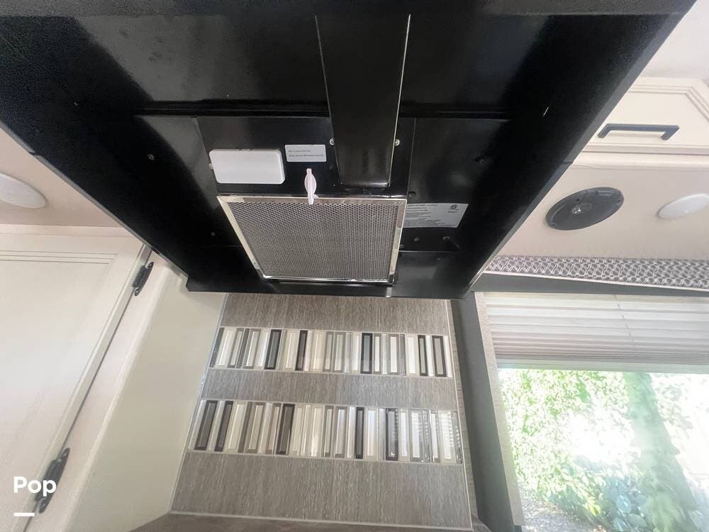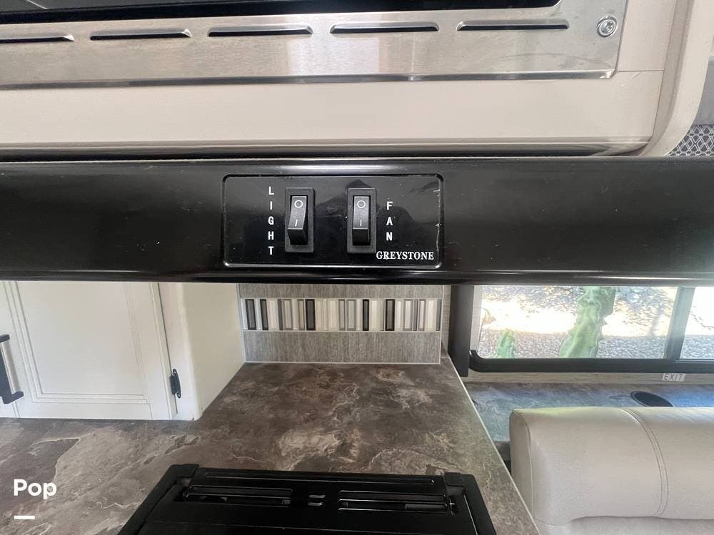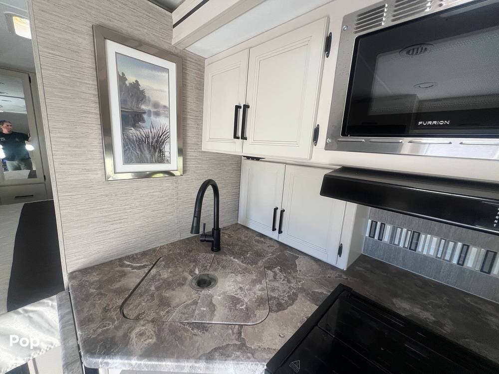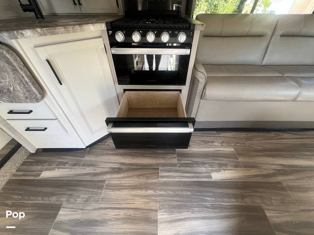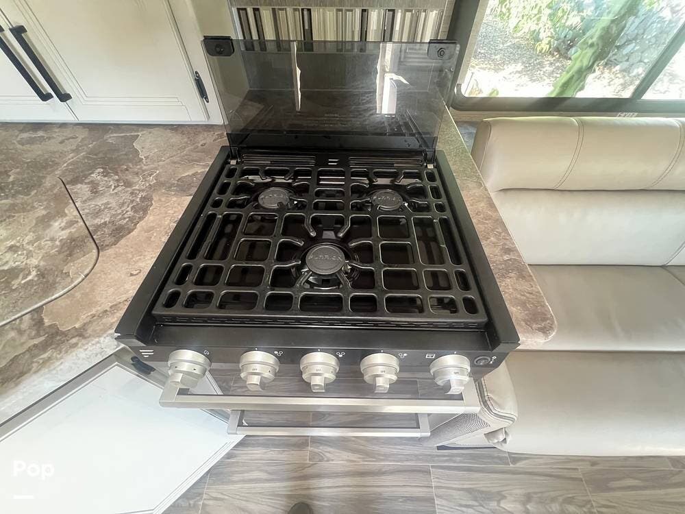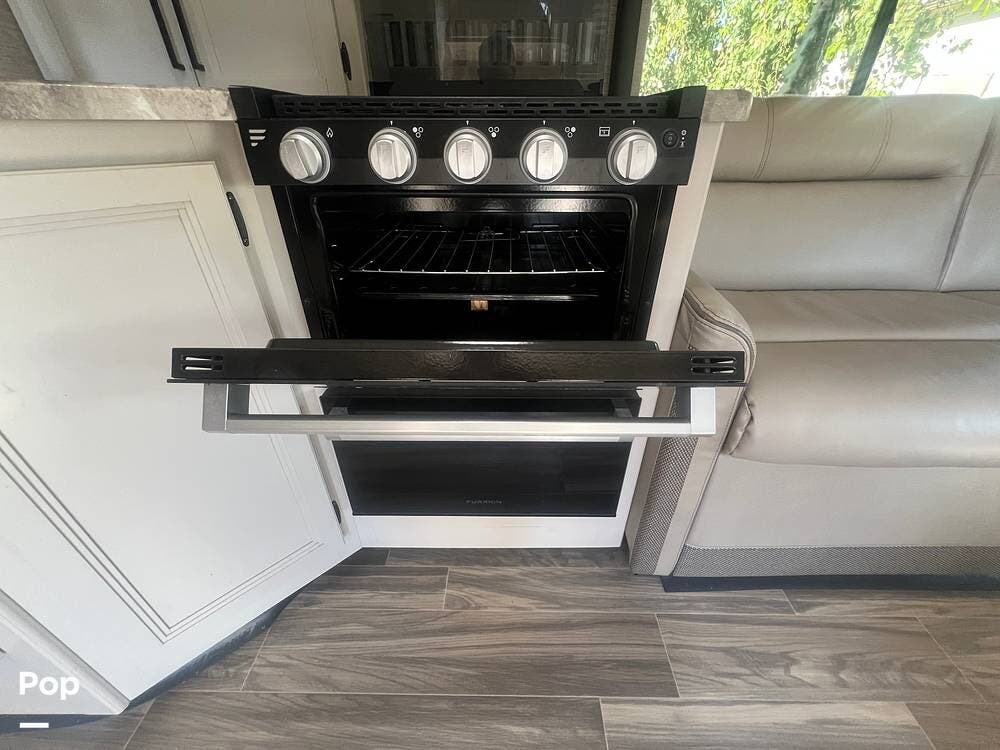 The kitchen area is designed for convenience, with everything needed to prepare meals on the go. The stove, equipped with three burners, and the oven right underneath it make cooking a breeze. The power vent over the stove top ensures a fresh cooking environment.