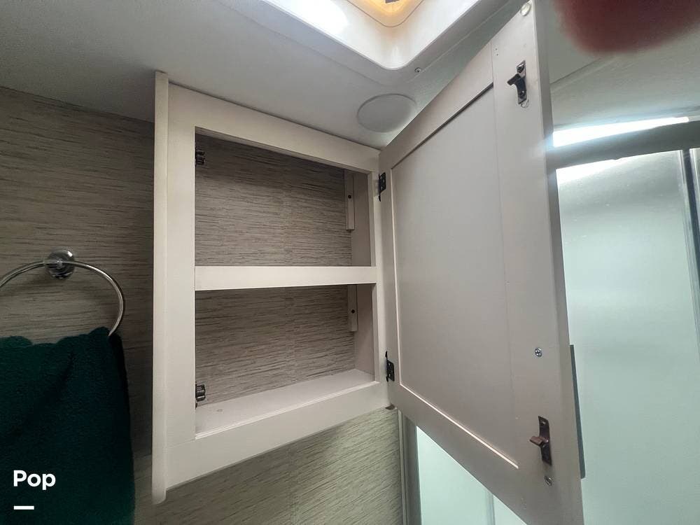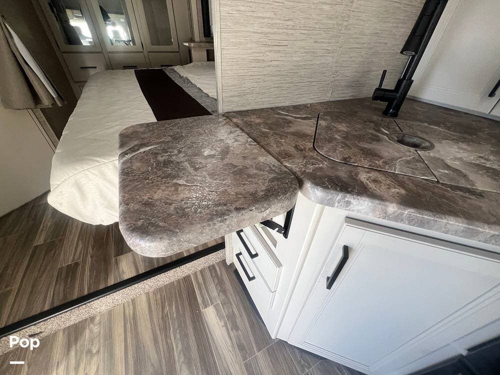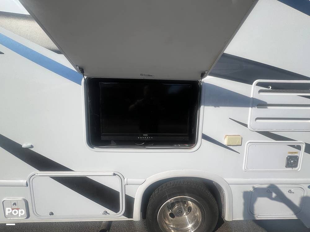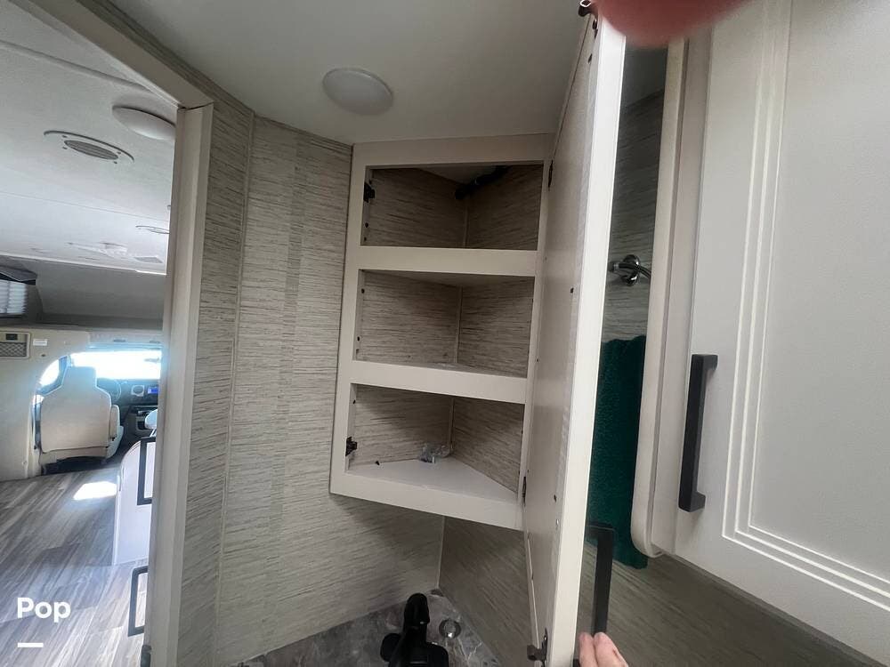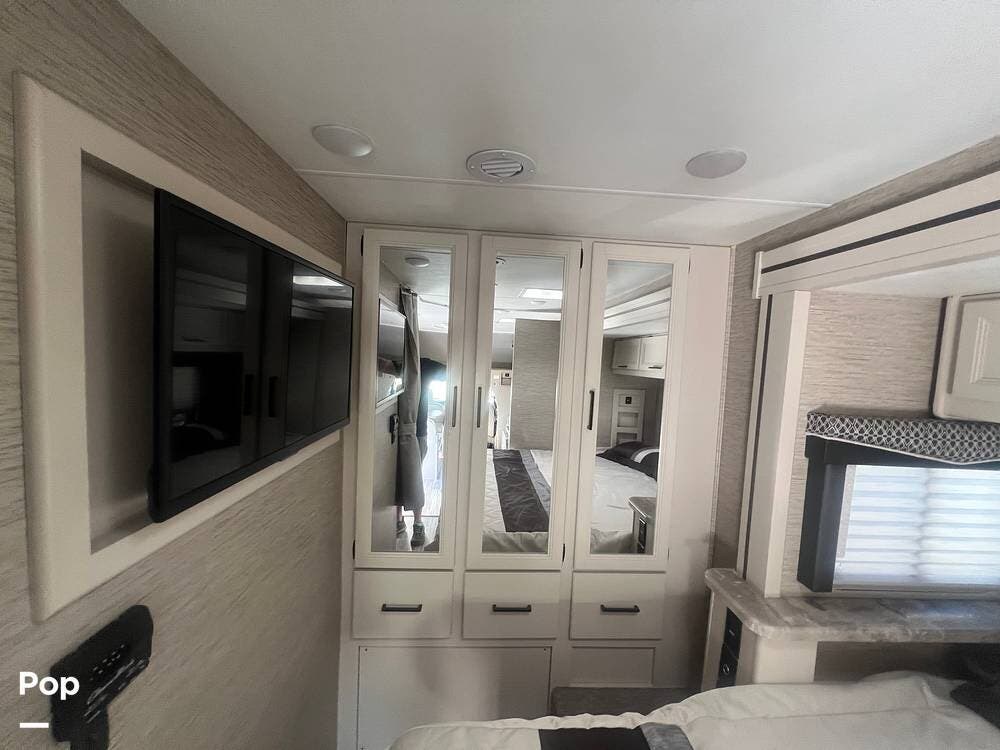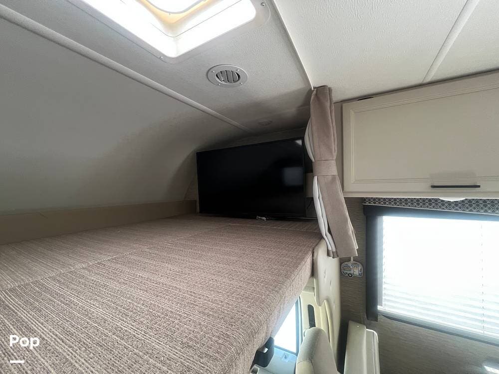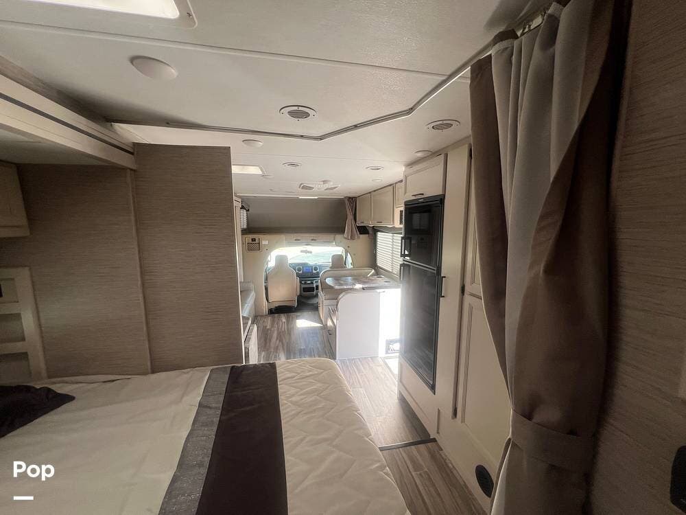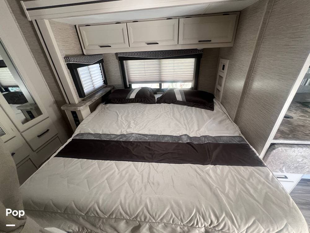 One of the standout features of this Class C RV is the king-size bed. The TV is recessed into the wall, and the bedroom also has a nice-sized closet.