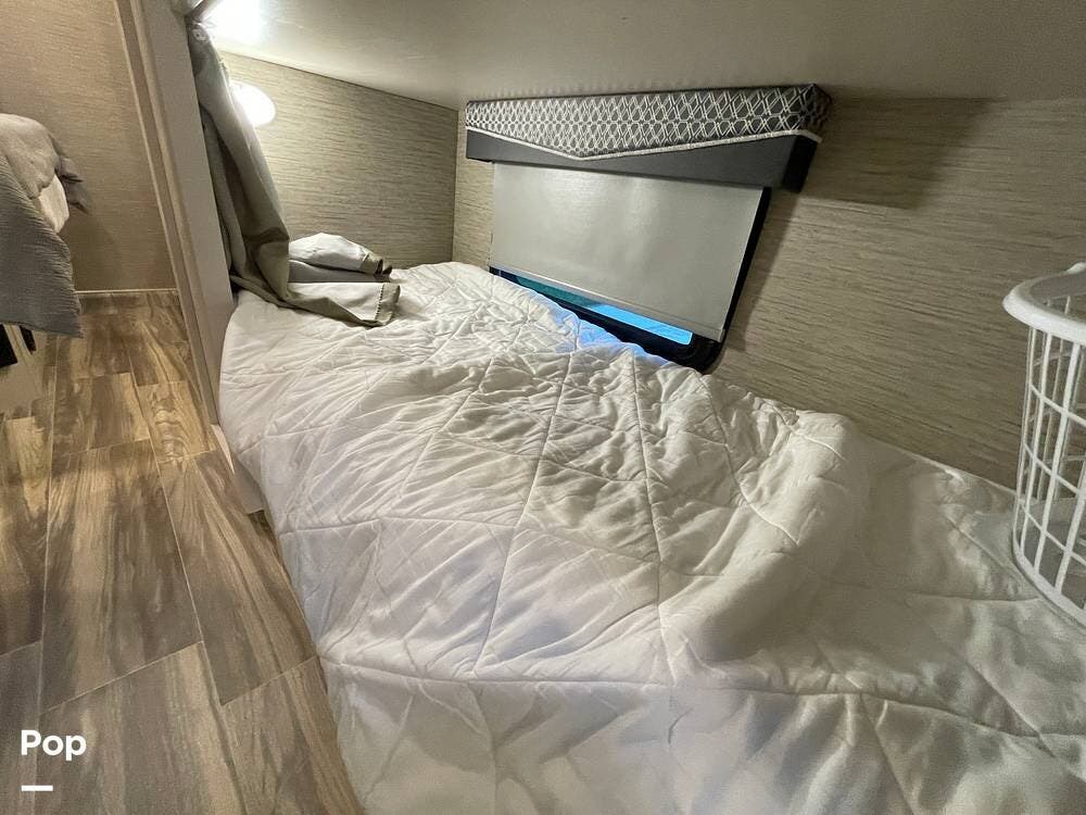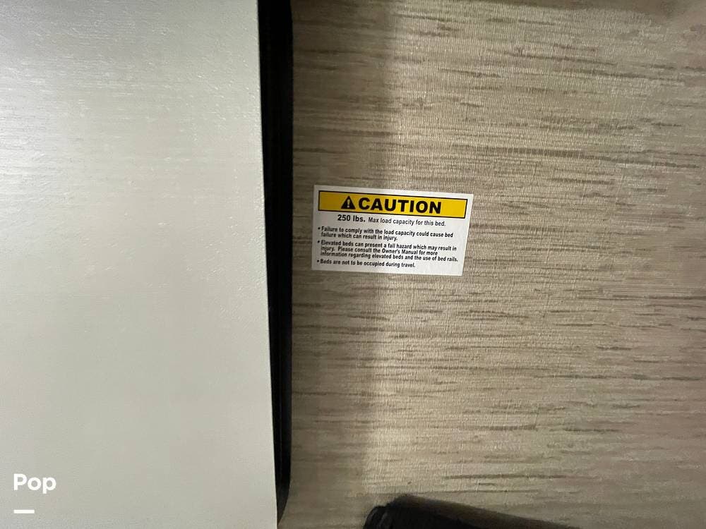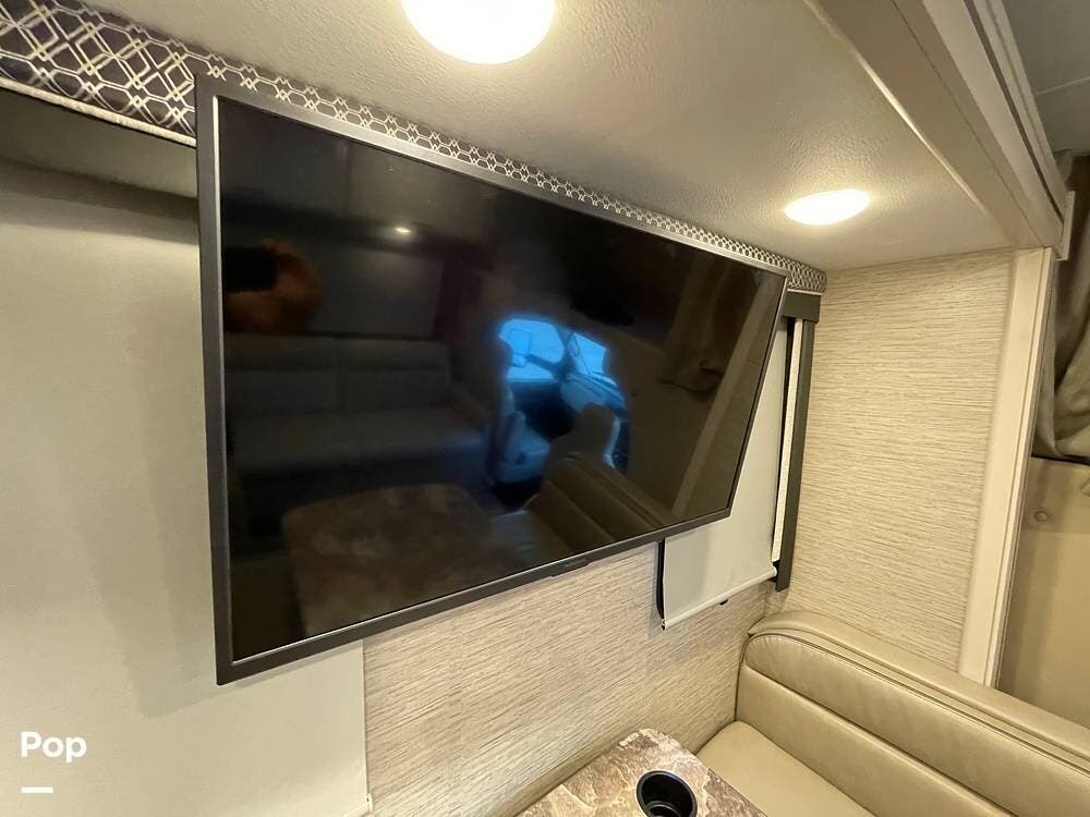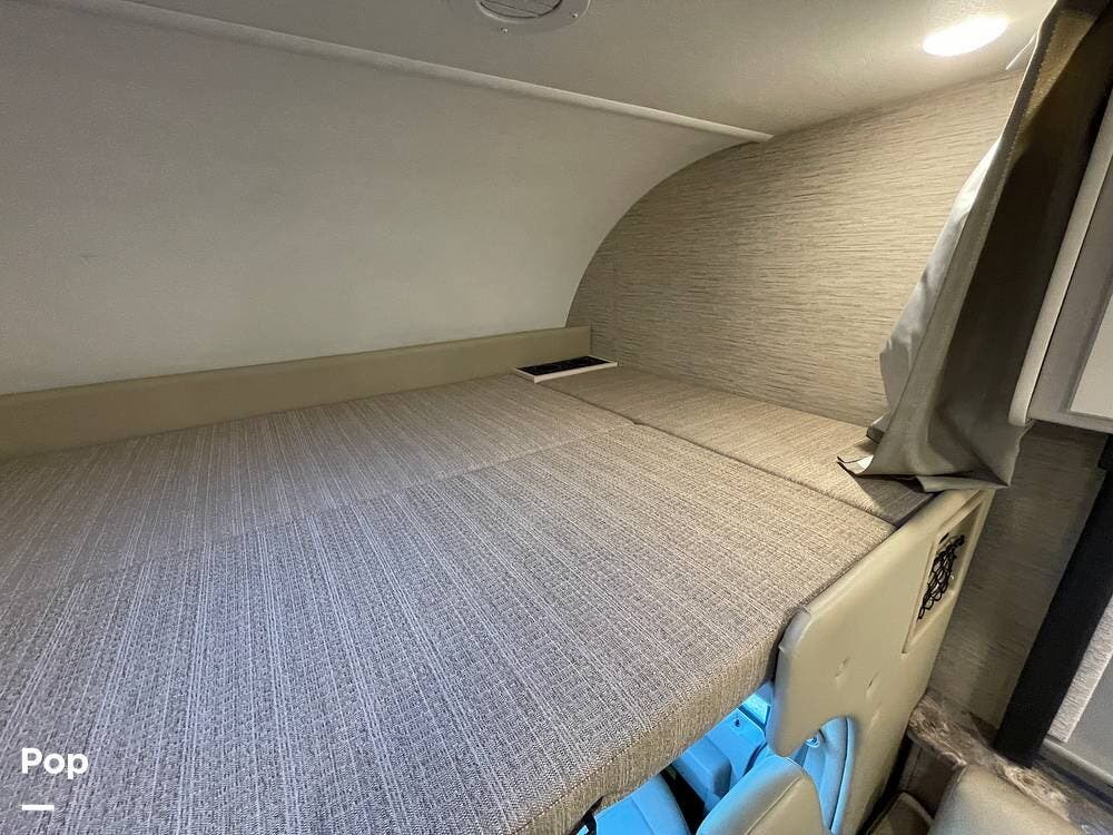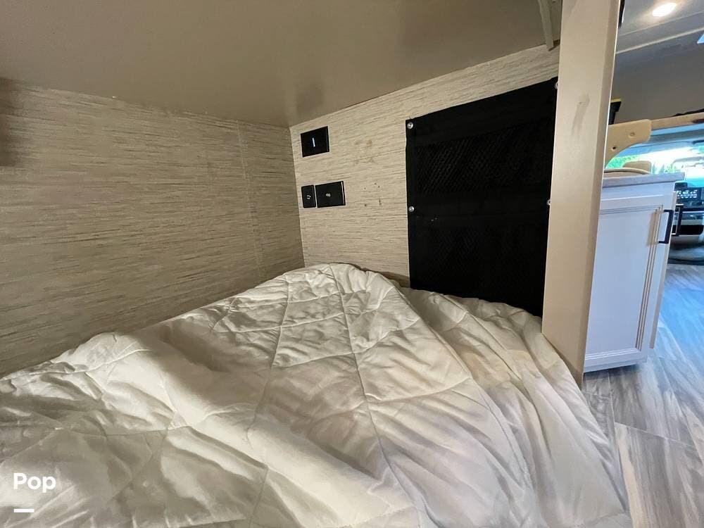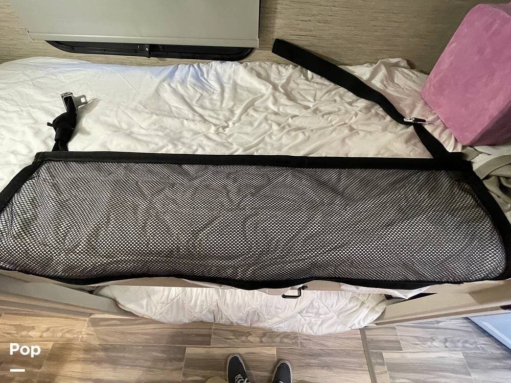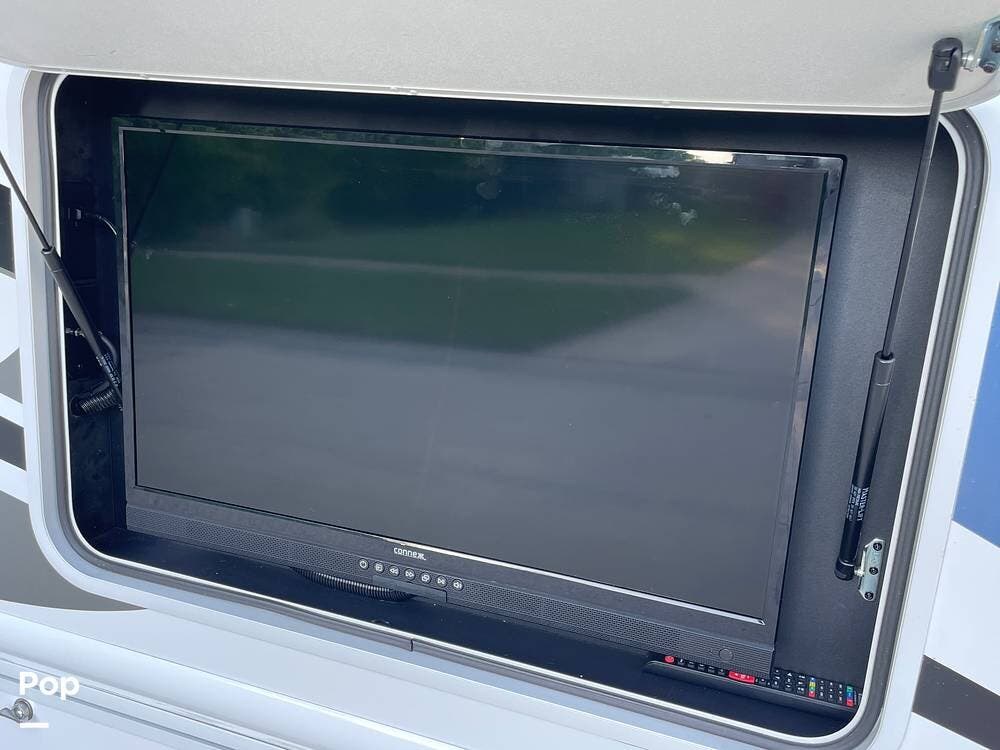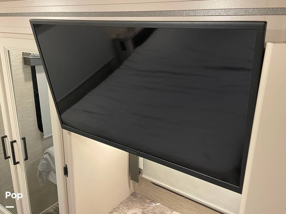 The cab-over bed has a ladder for access and is rated for up to 500 lbs. A window with a blind on the passenger side allows light in when the blind is up. A 40" LED TV on a swivel mount can be positioned to view from within the living space.