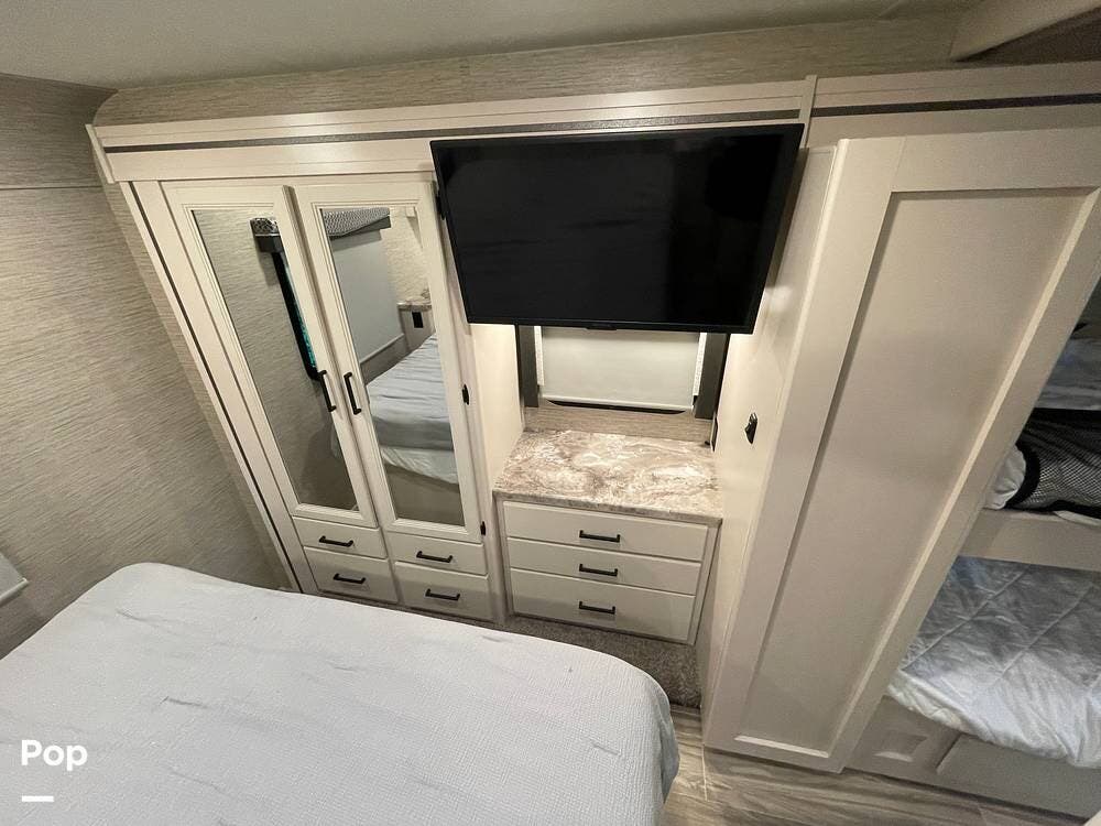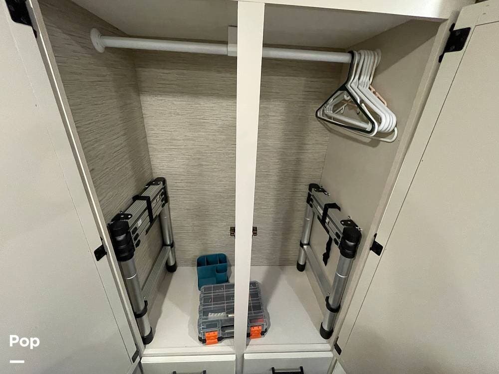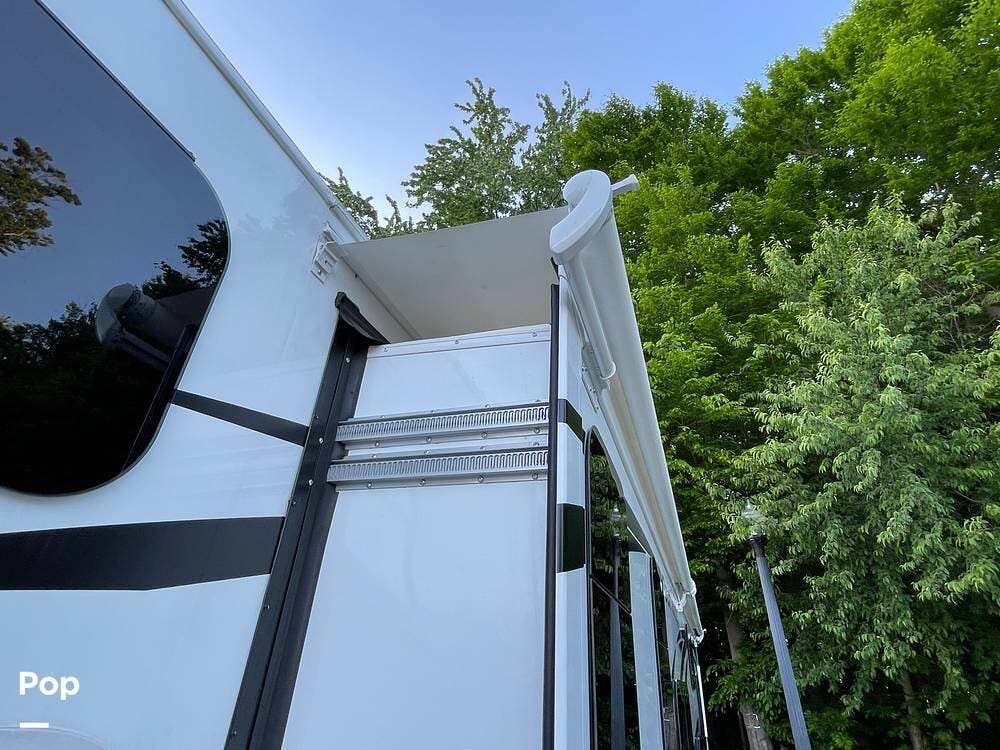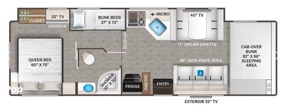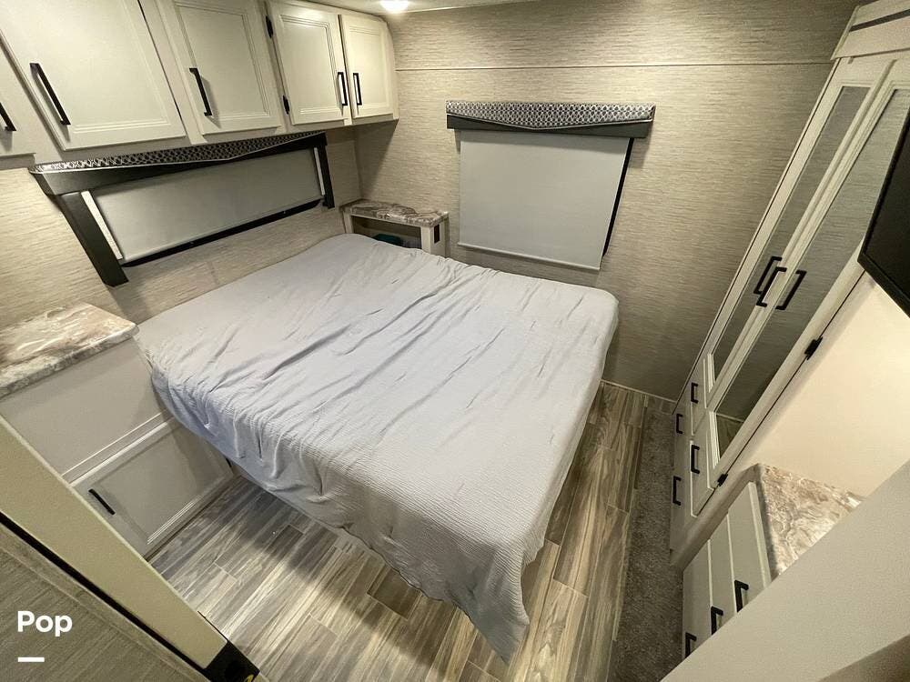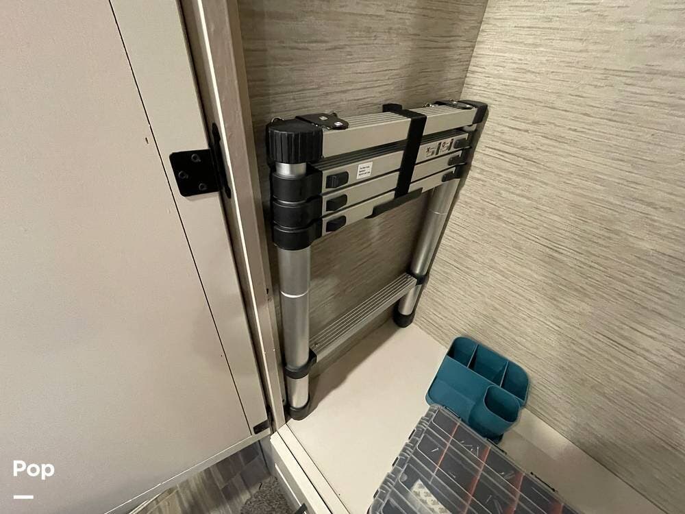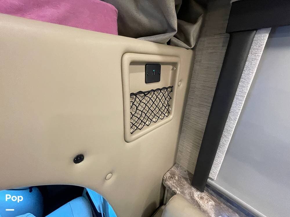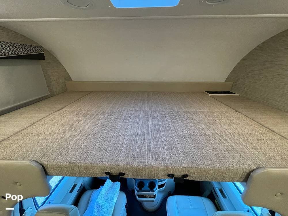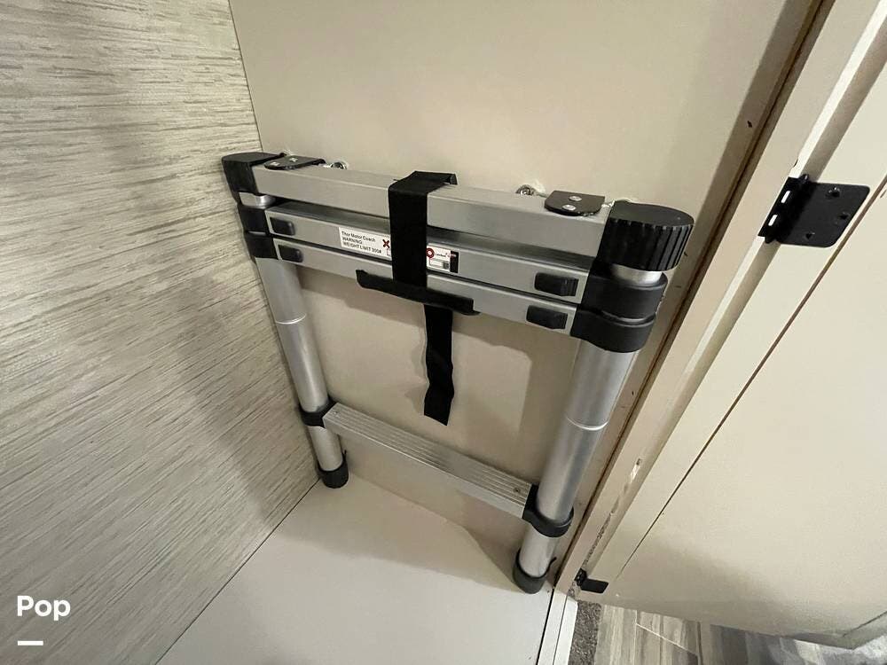 The cab-over bed has a ladder for access and is rated for up to 500 lbs. A window with a blind on the passenger side allows light in when the blind is up. A 40" LED TV on a swivel mount can be positioned to view from within the living space.