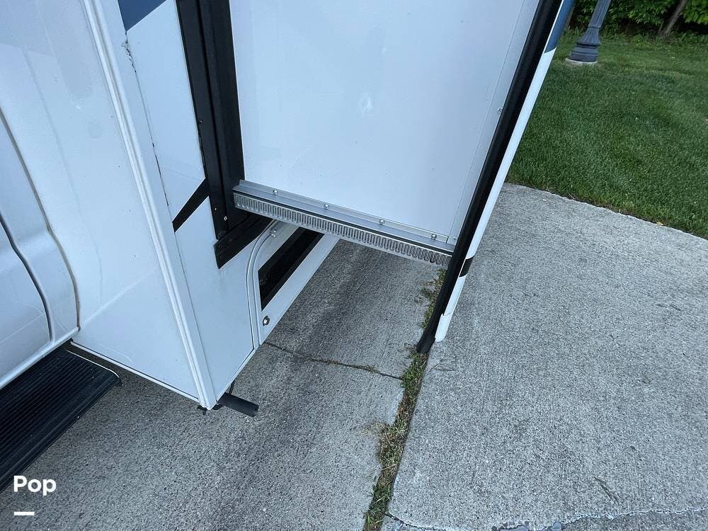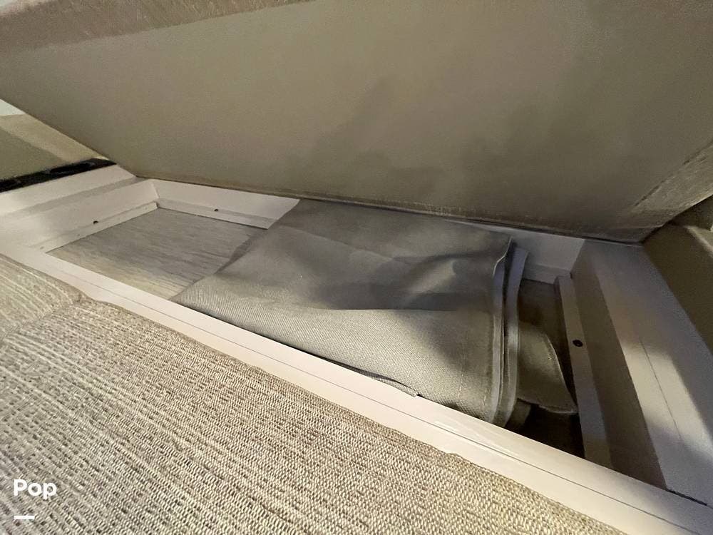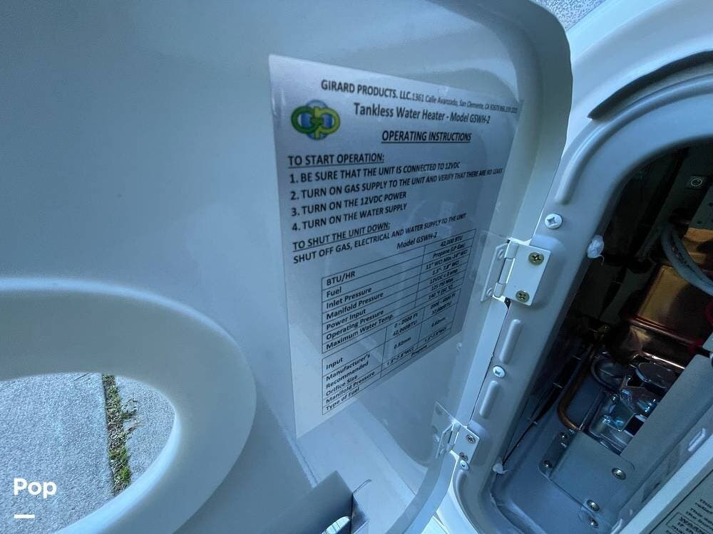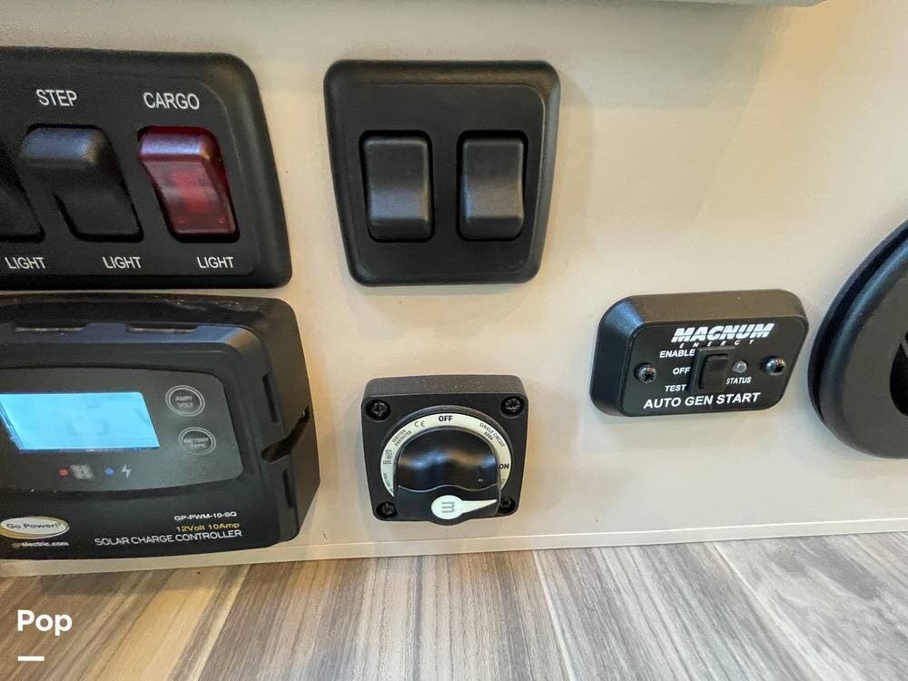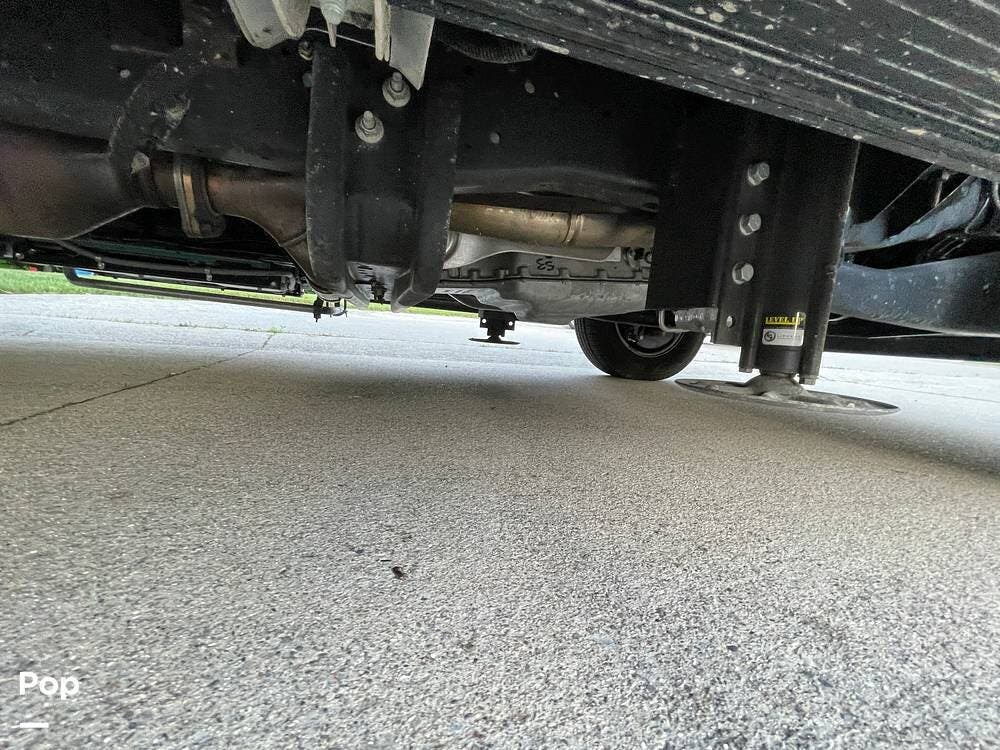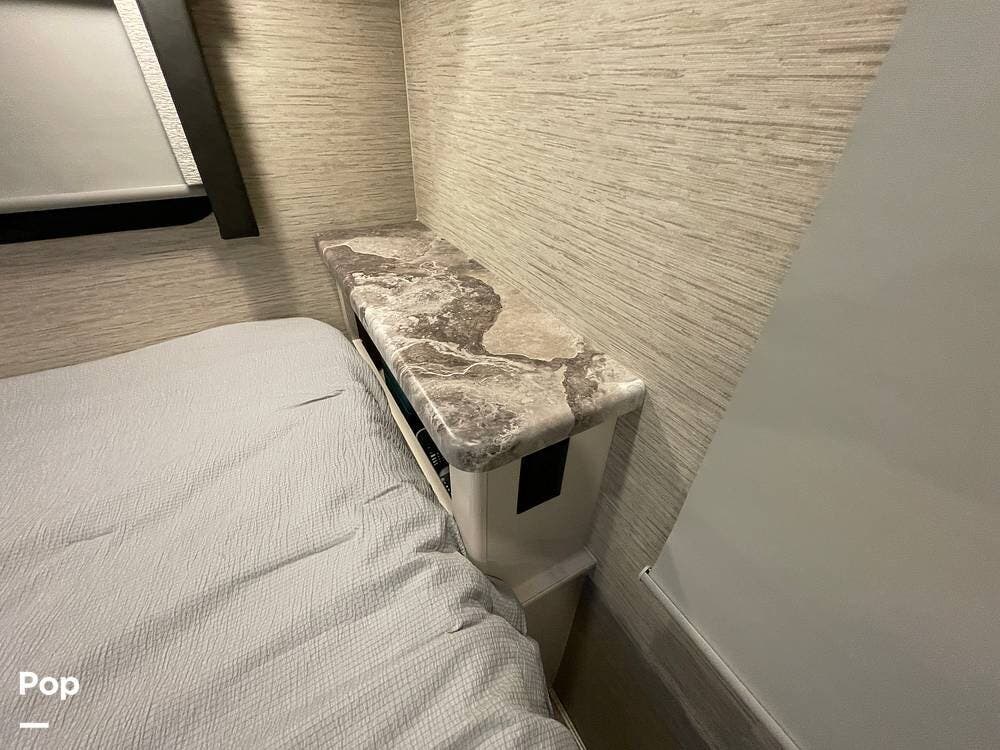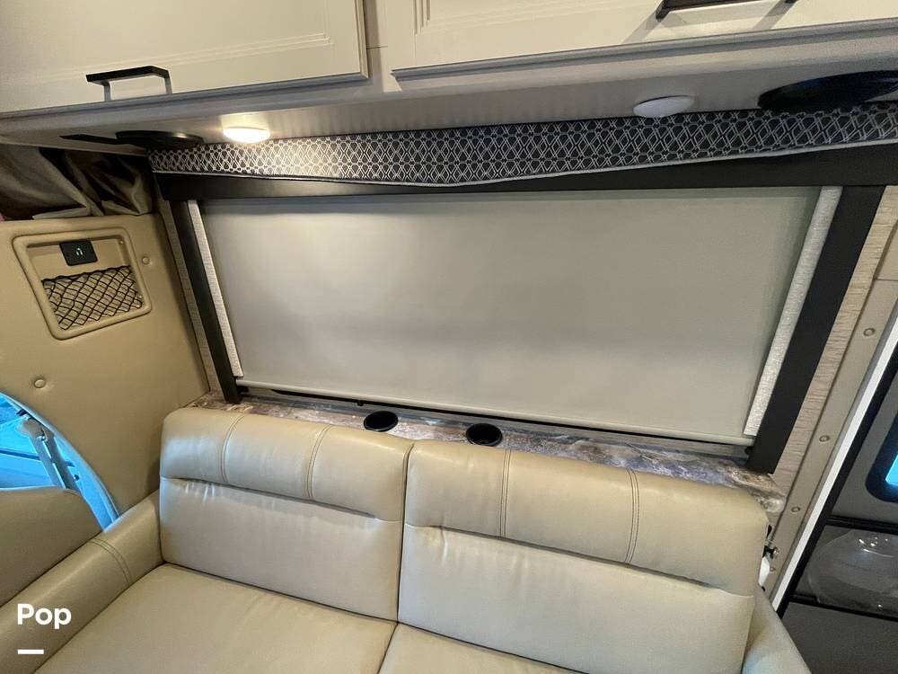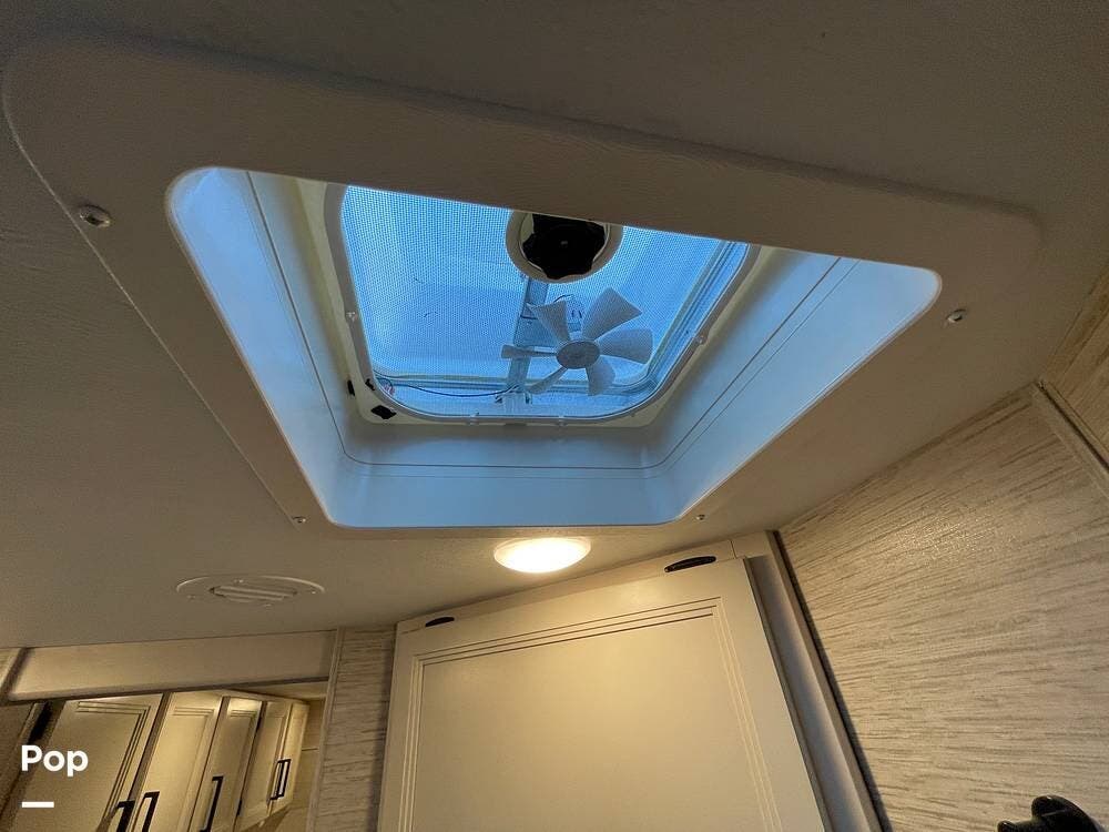 The cab-over bed has a ladder for access and is rated for up to 500 lbs. A window with a blind on the passenger side allows light in when the blind is up. A 40" LED TV on a swivel mount can be positioned to view from within the living space.