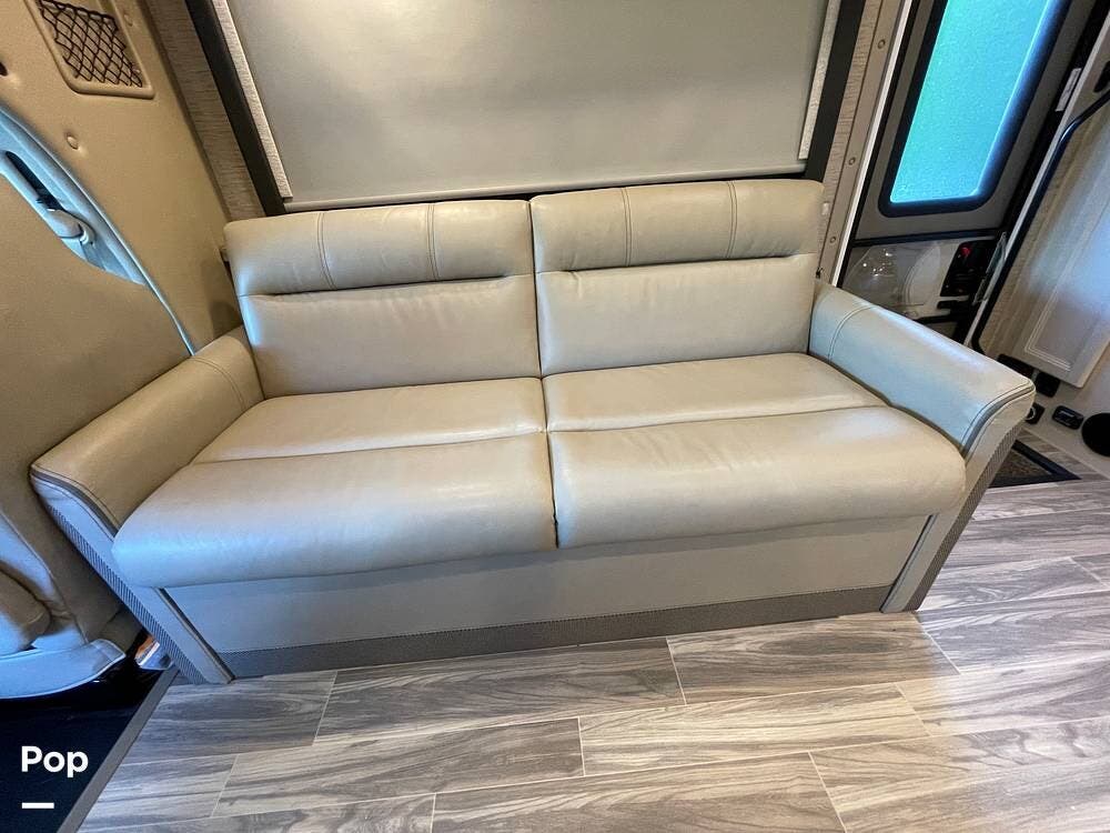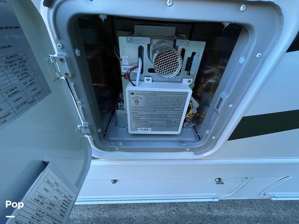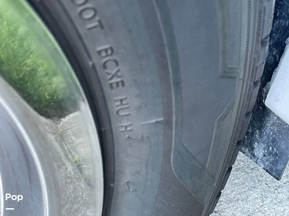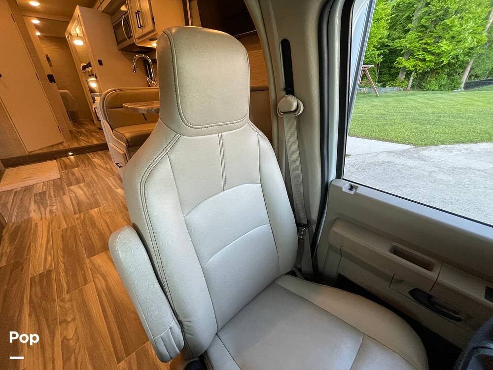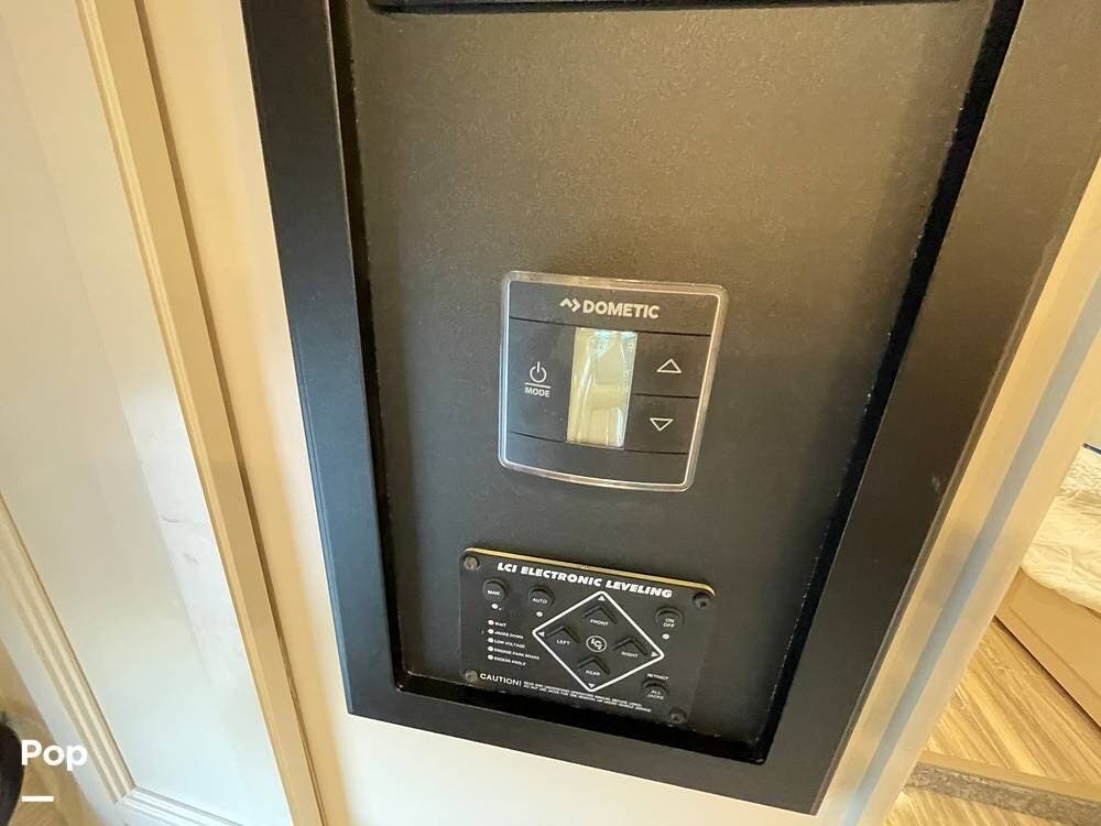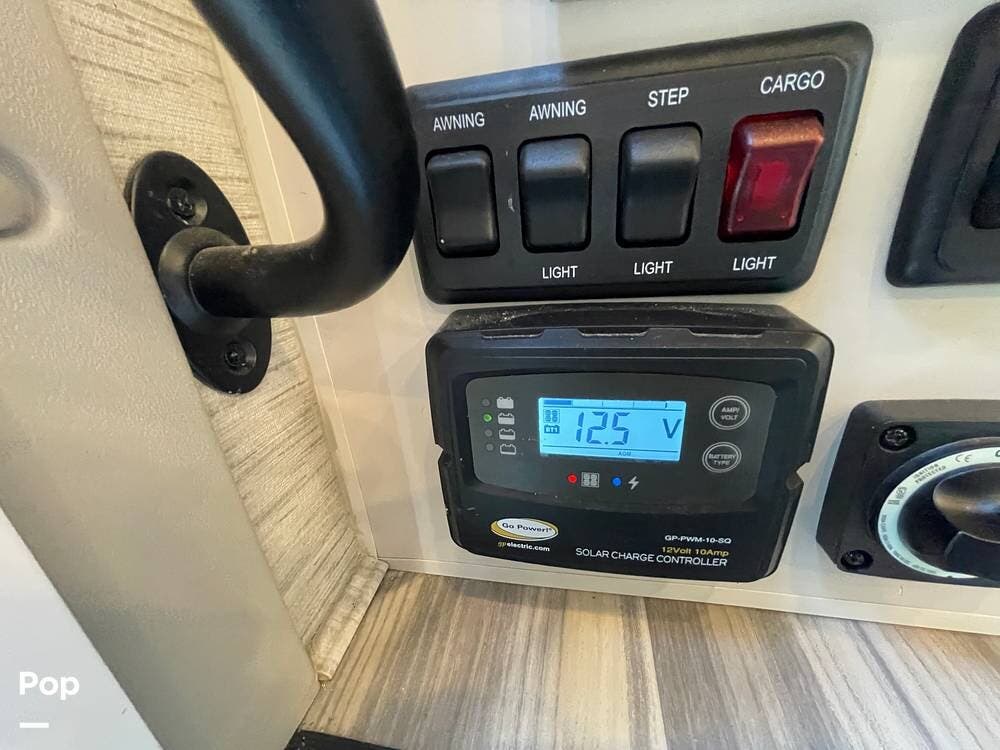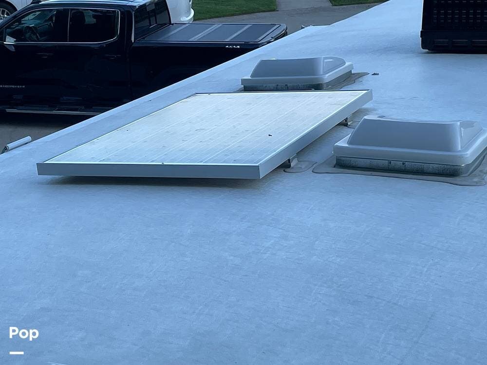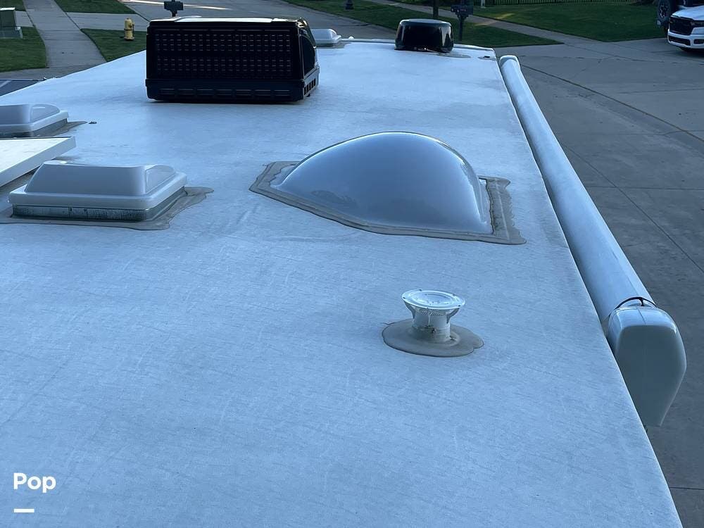 The cab-over bed has a ladder for access and is rated for up to 500 lbs. A window with a blind on the passenger side allows light in when the blind is up. A 40" LED TV on a swivel mount can be positioned to view from within the living space.