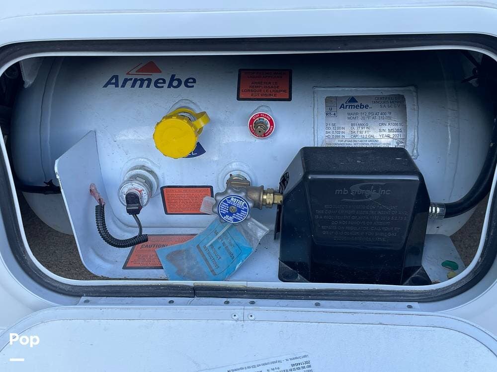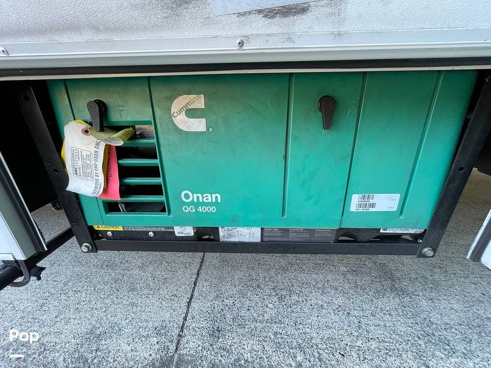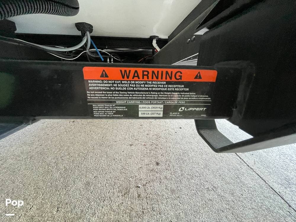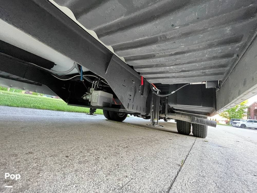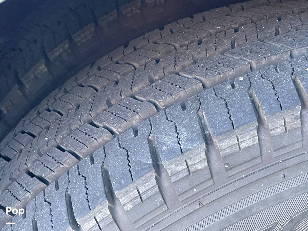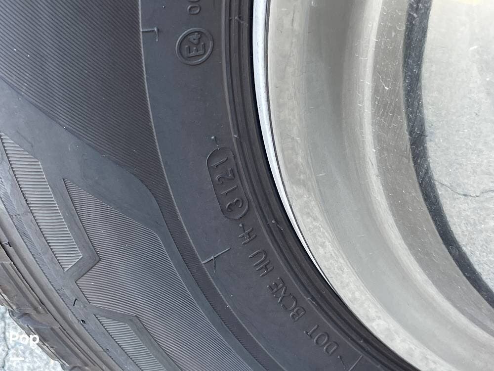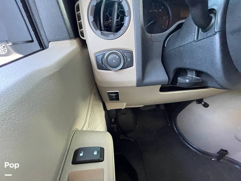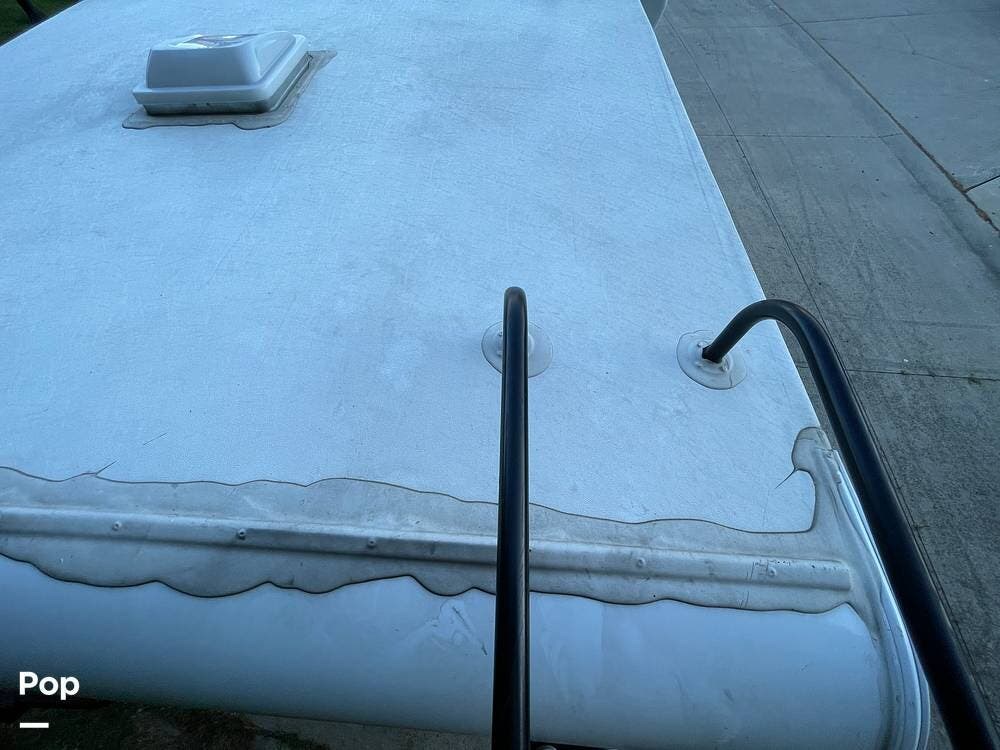 The cab-over bed has a ladder for access and is rated for up to 500 lbs. A window with a blind on the passenger side allows light in when the blind is up. A 40" LED TV on a swivel mount can be positioned to view from within the living space.