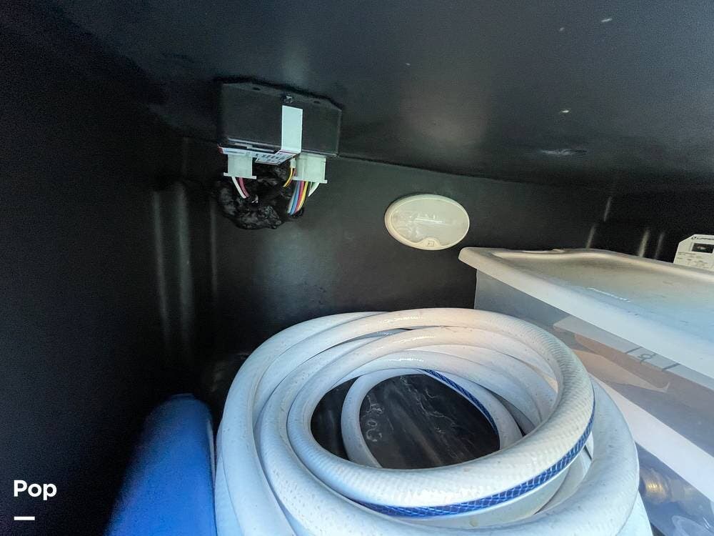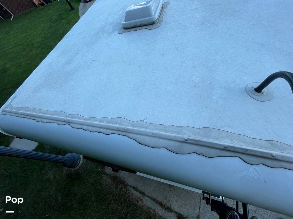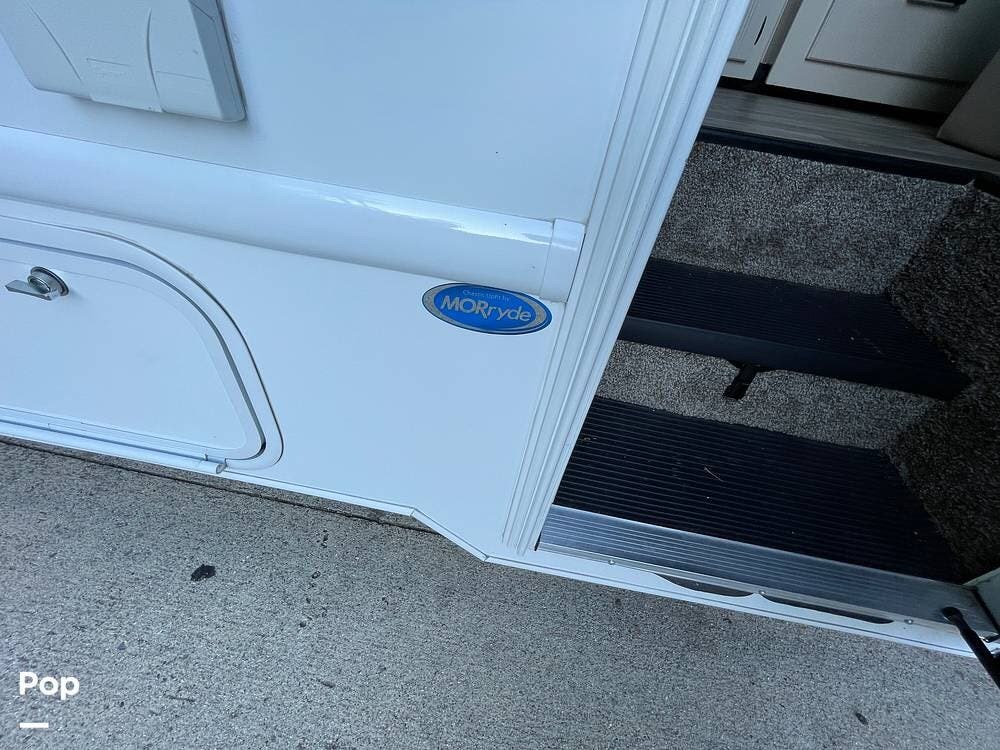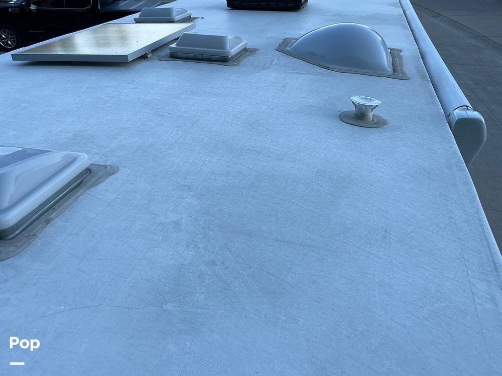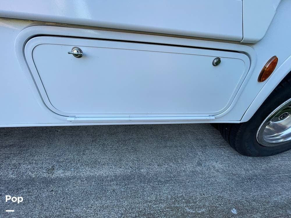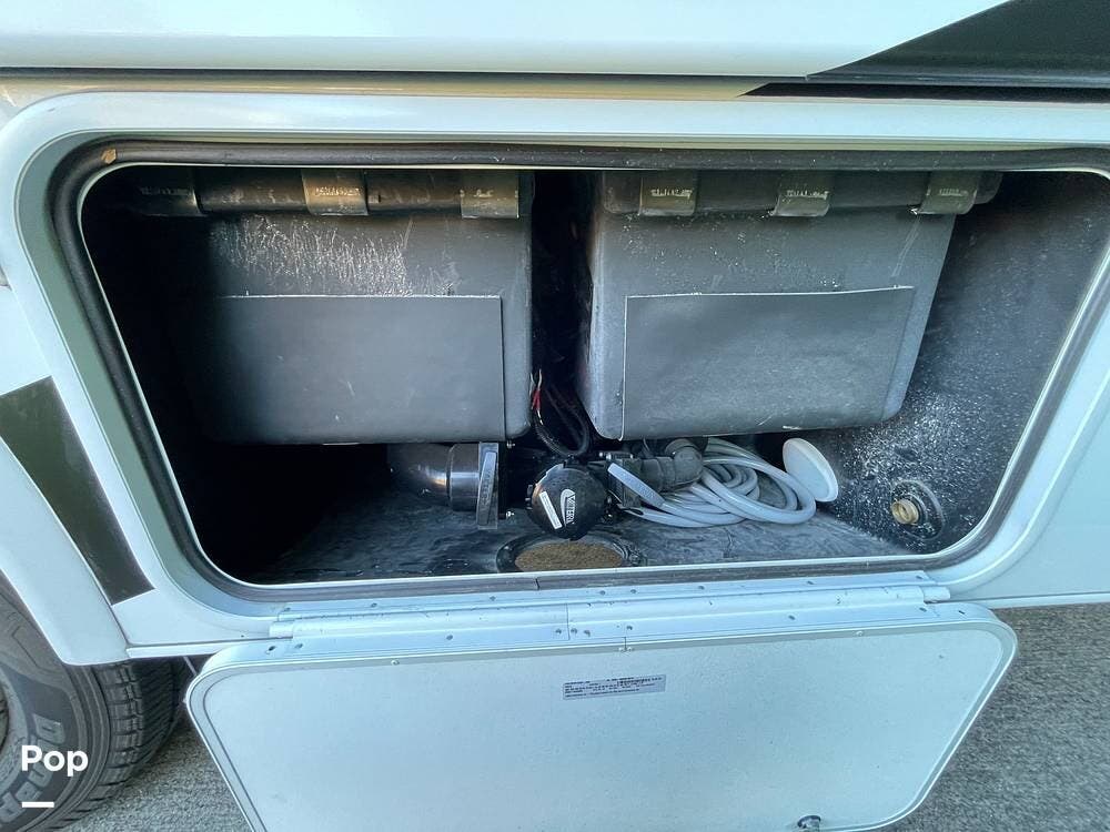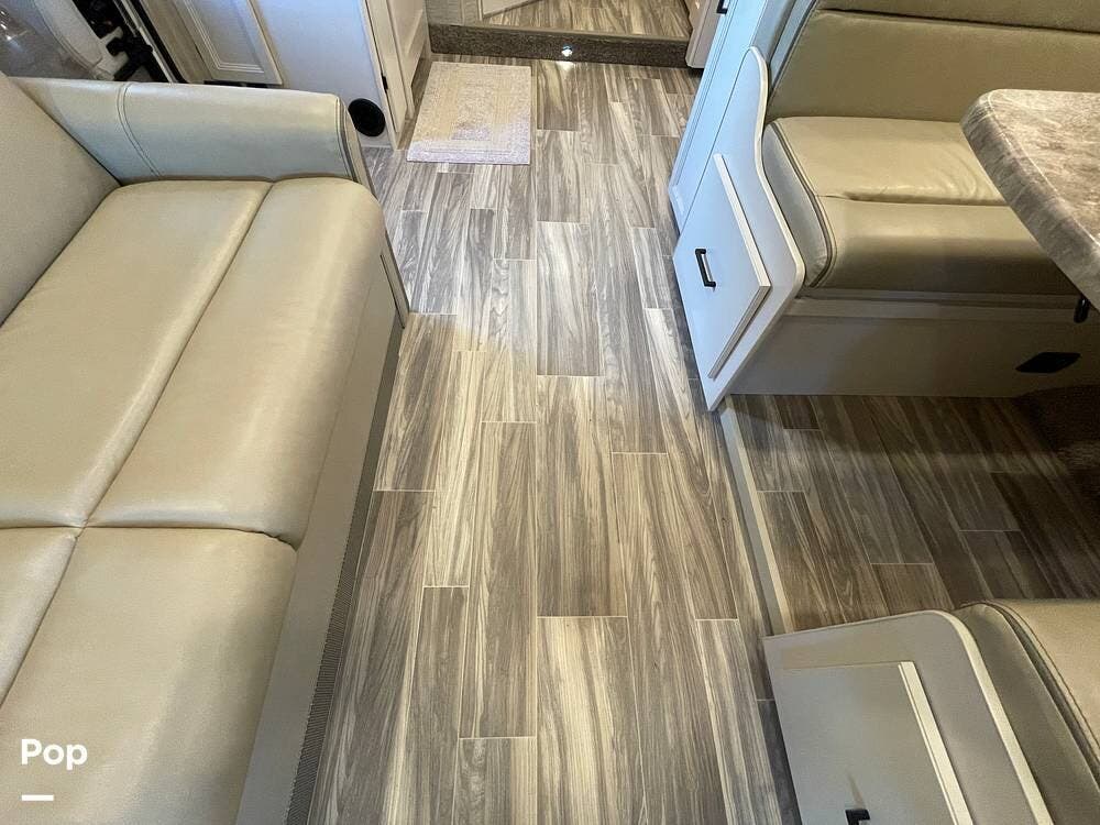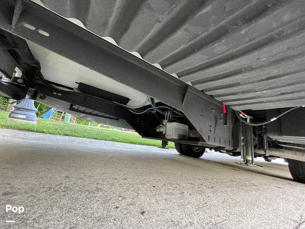 The cab-over bed has a ladder for access and is rated for up to 500 lbs. A window with a blind on the passenger side allows light in when the blind is up. A 40" LED TV on a swivel mount can be positioned to view from within the living space.