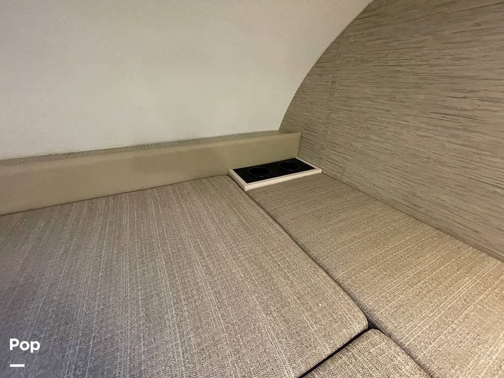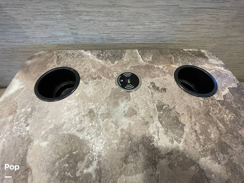 Behind the sofa are beverage holders, a window with blind and valance, overhead cabinet storage, lighting, and speakers. You'll also find convenient USB charging outlets.
