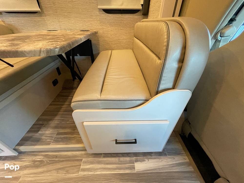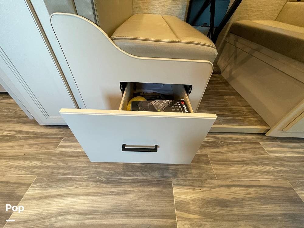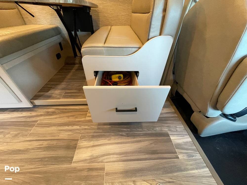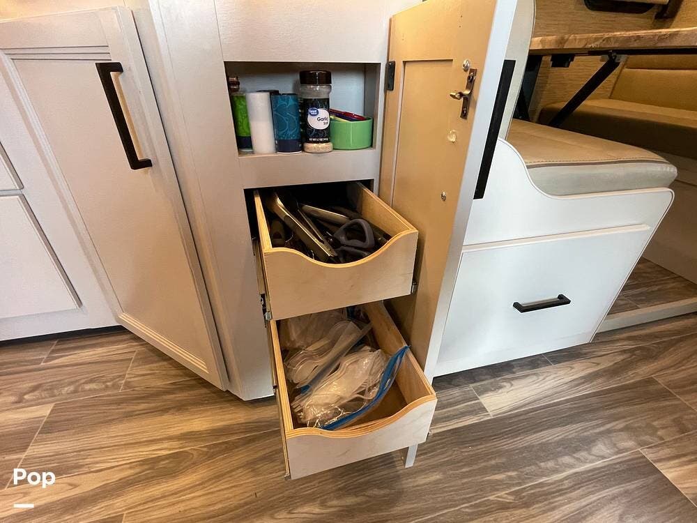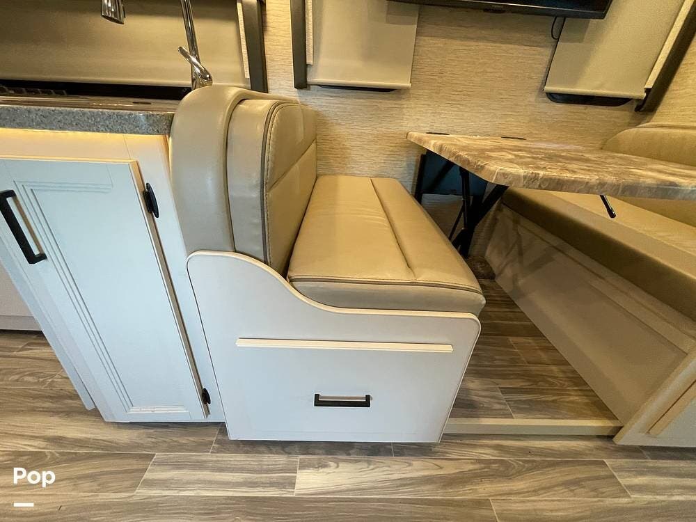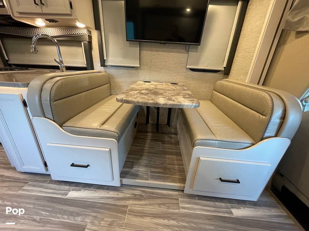 Behind the driver's seat is the leatherette Dream Dinette booth. The table can be lowered to form a bed. Storage drawers pull out at the end of each bench cap. You'll also find seatbelts for your passengers. Three overhead cabinets provide storage, and behind the dinette, there is a window with pull-down shades and valance.