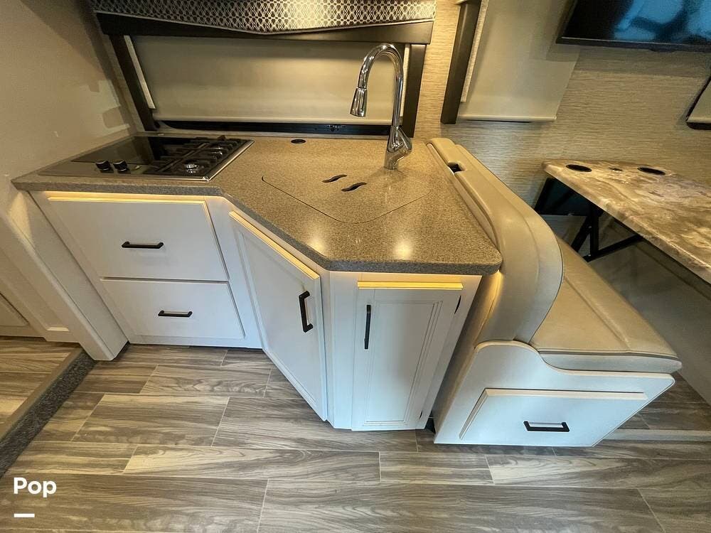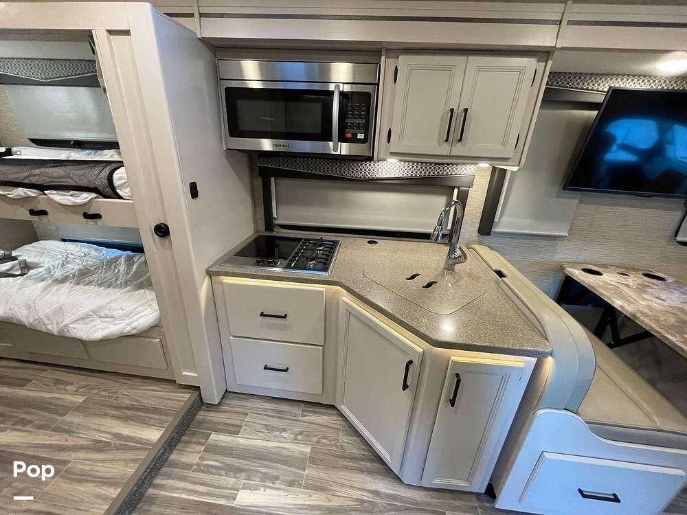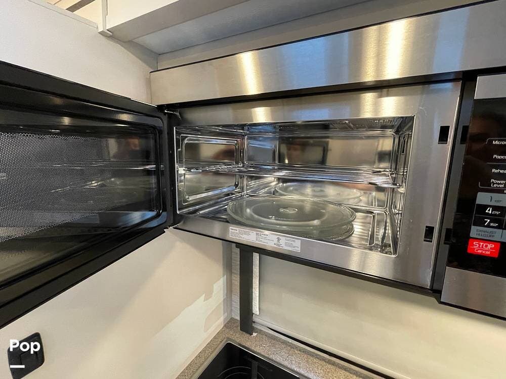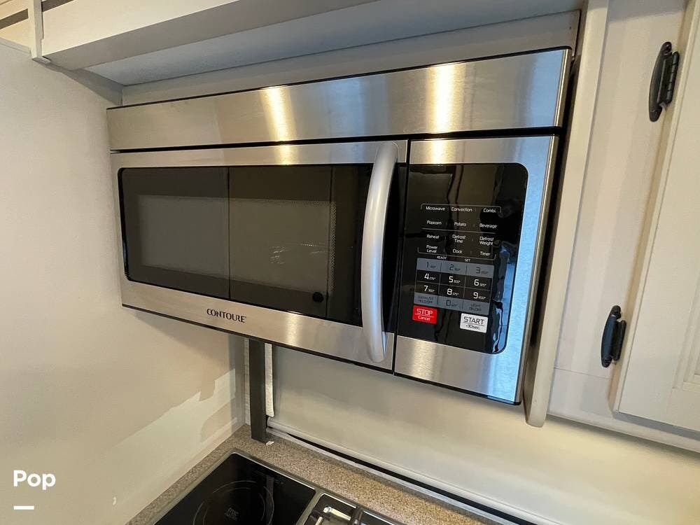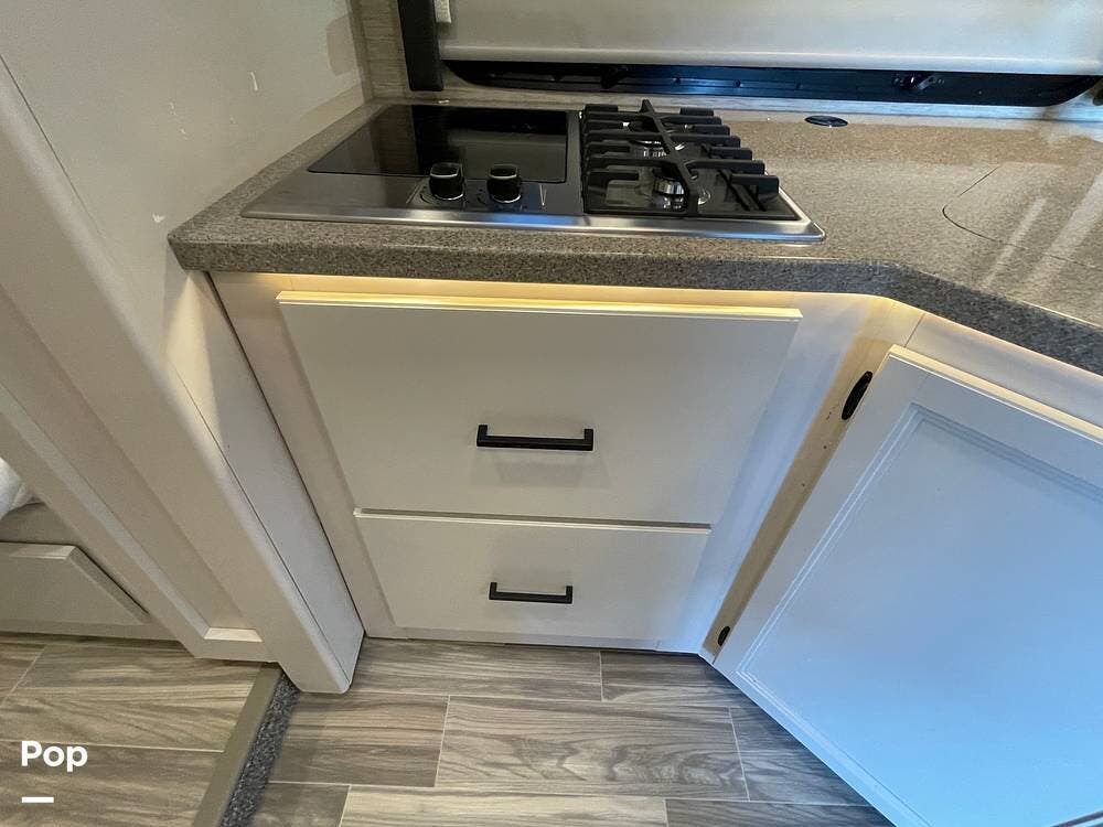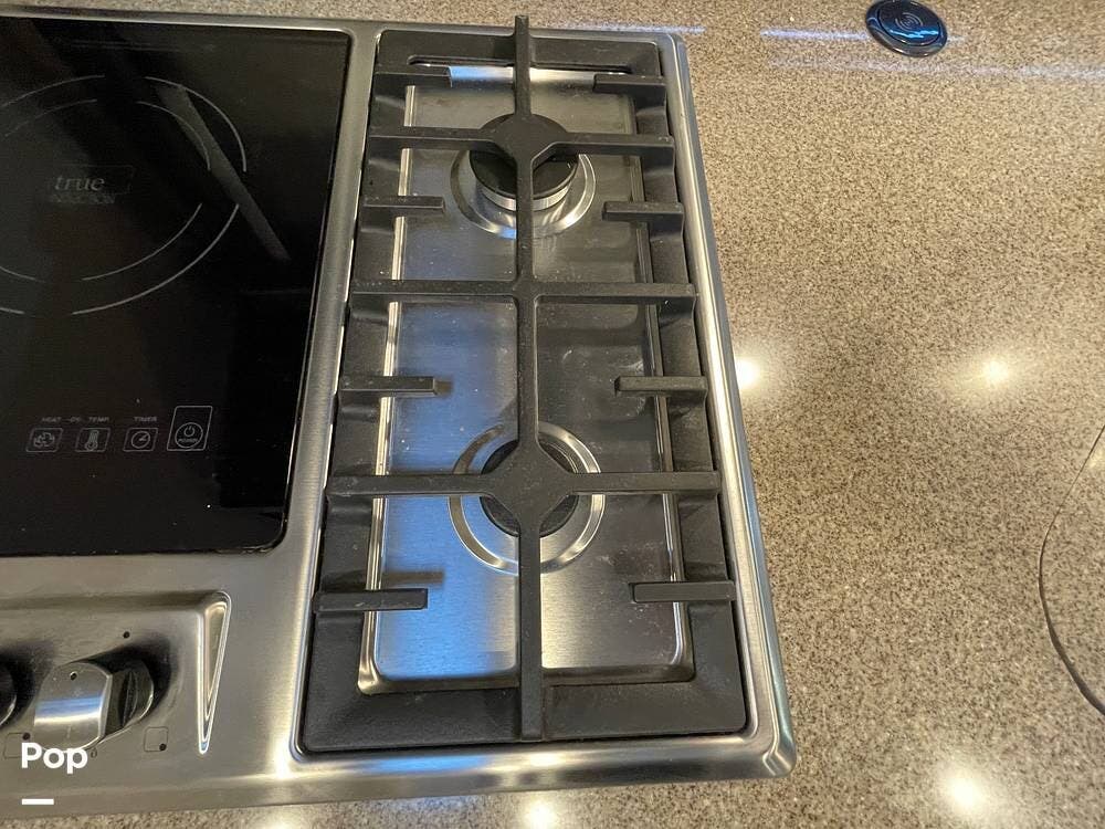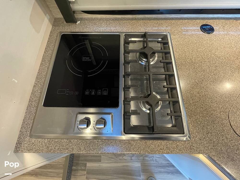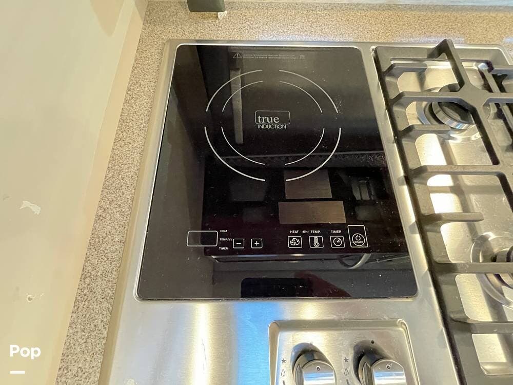 The well-appointed kitchen sits behind the dinette and features a large stainless steel sink with cover and pull-out faucet, a stove with one induction and two gas burners, a pull-up countertop 110-v outlet, a microwave/convection oven, and an electric/propane refrigerator/freezer.