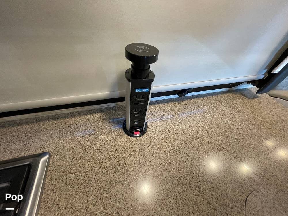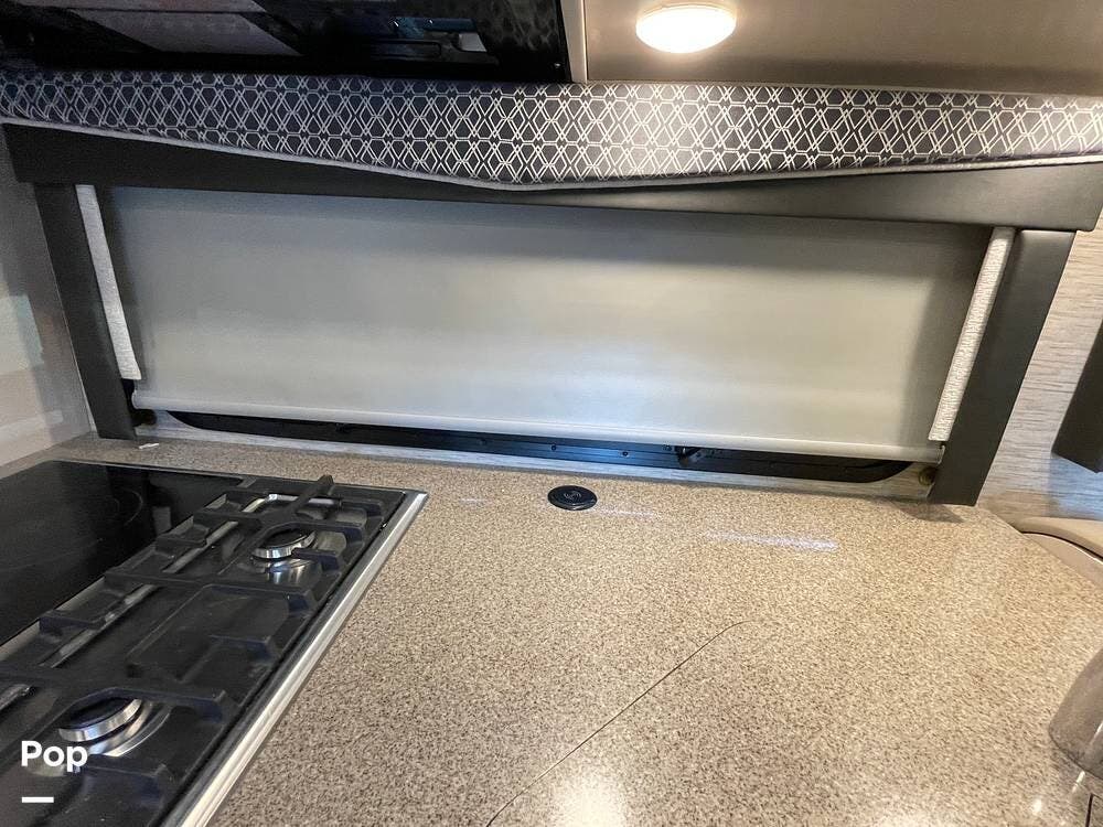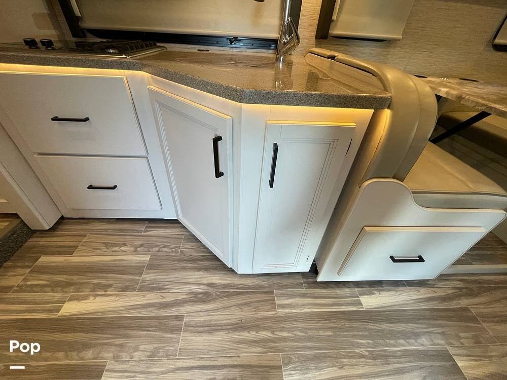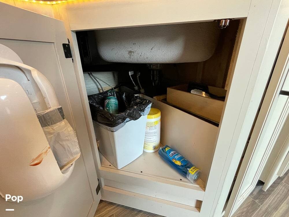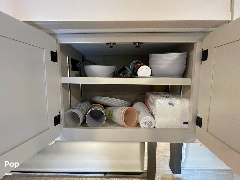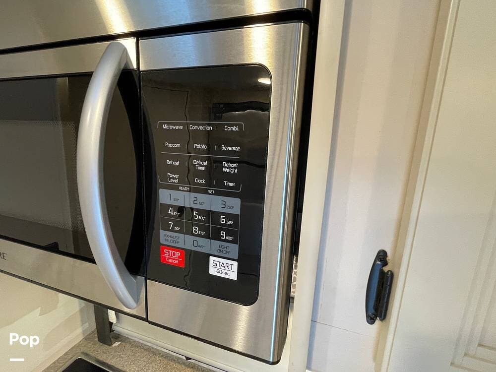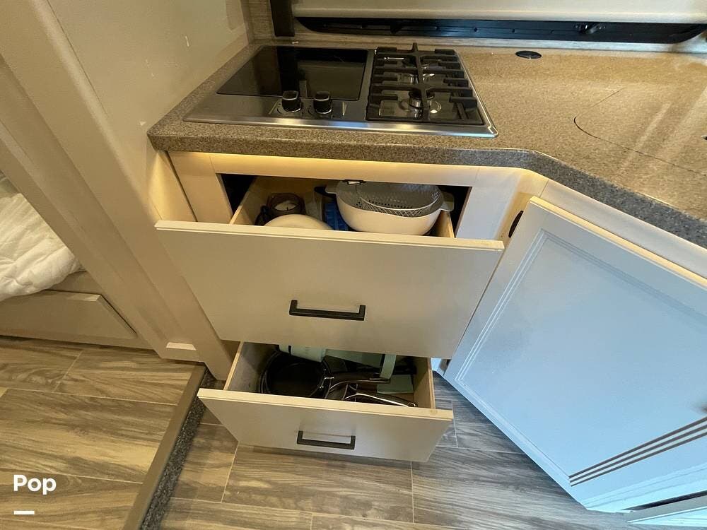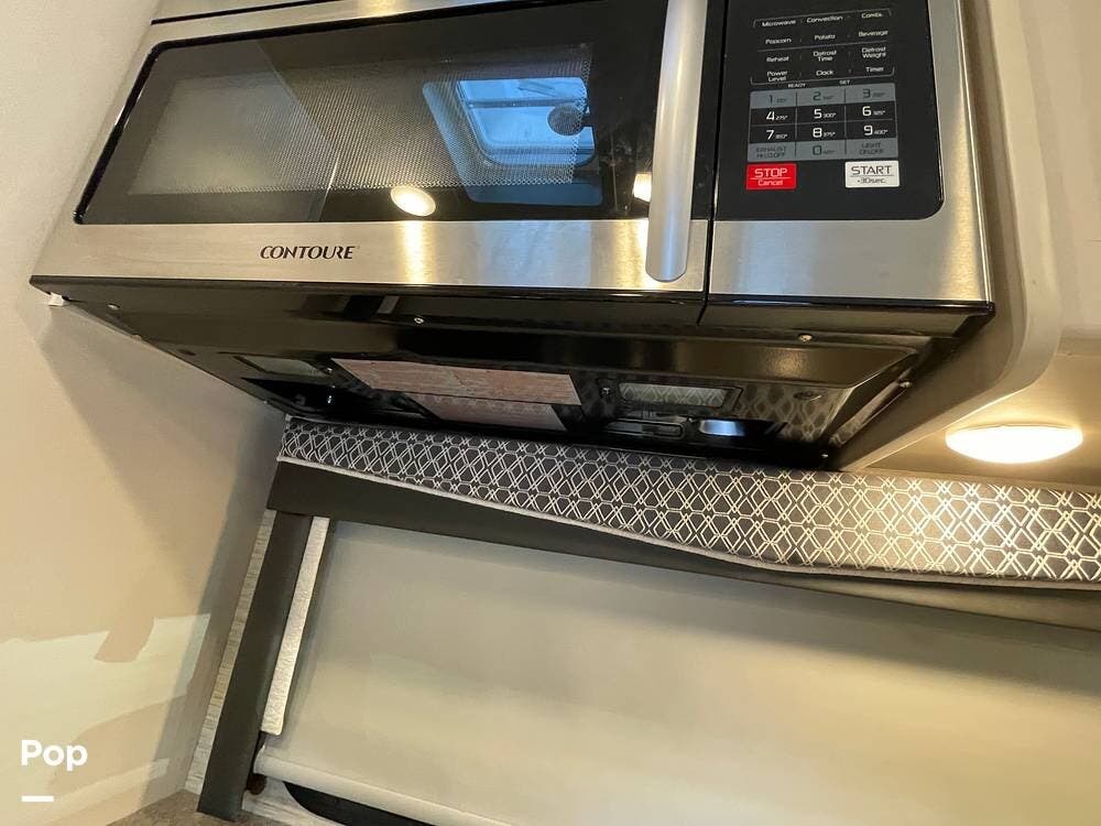 The well-appointed kitchen sits behind the dinette and features a large stainless steel sink with cover and pull-out faucet, a stove with one induction and two gas burners, a pull-up countertop 110-v outlet, a microwave/convection oven, and an electric/propane refrigerator/freezer.