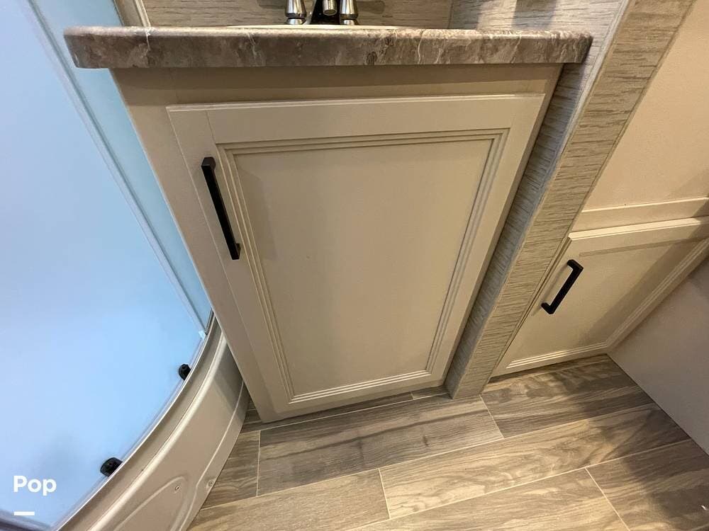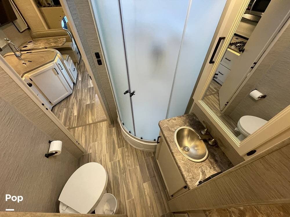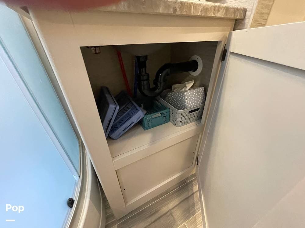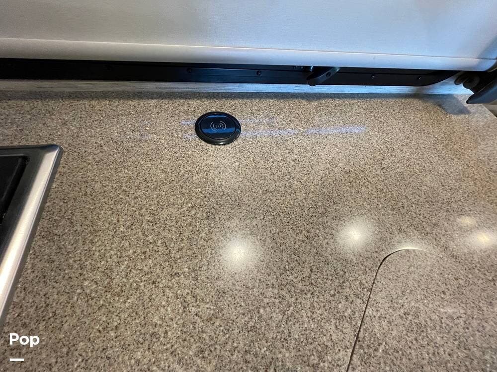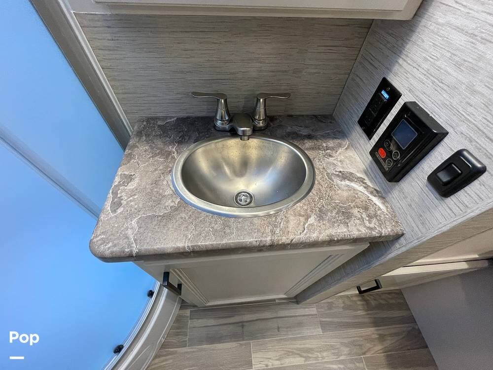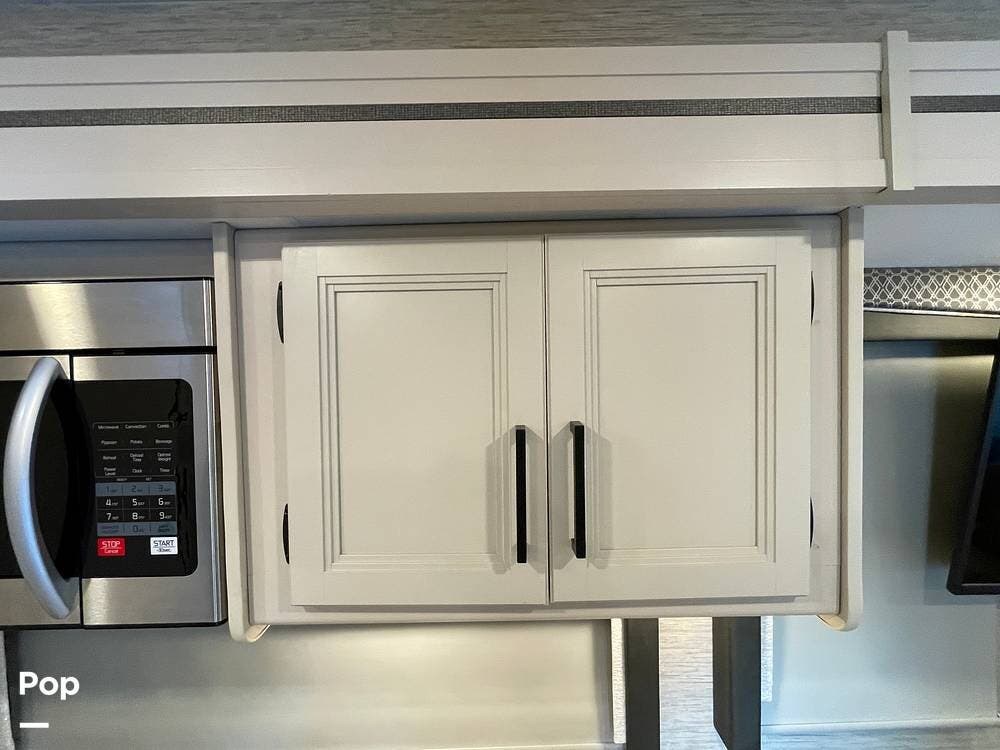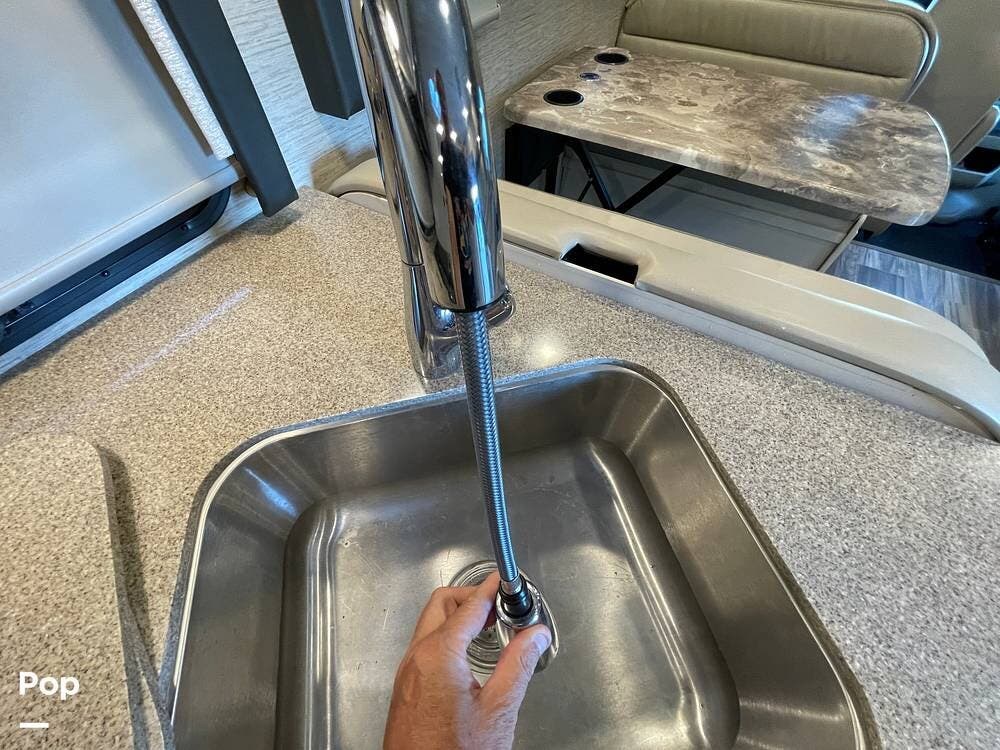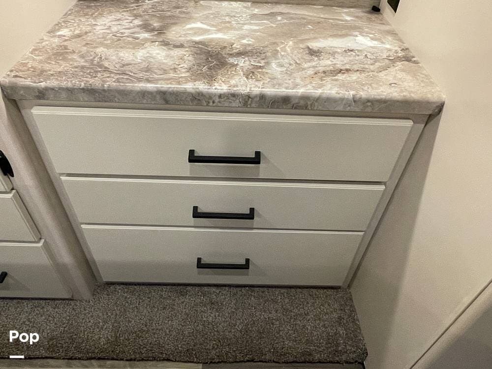 The well-appointed kitchen sits behind the dinette and features a large stainless steel sink with cover and pull-out faucet, a stove with one induction and two gas burners, a pull-up countertop 110-v outlet, a microwave/convection oven, and an electric/propane refrigerator/freezer.