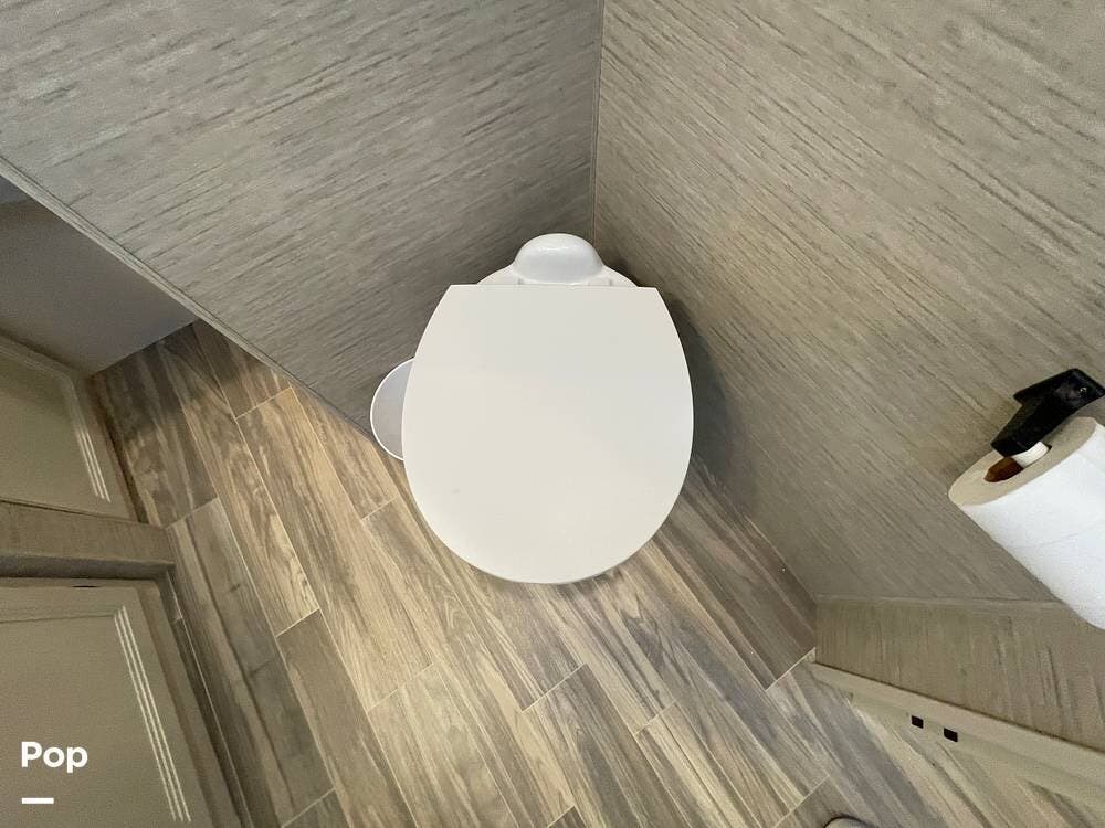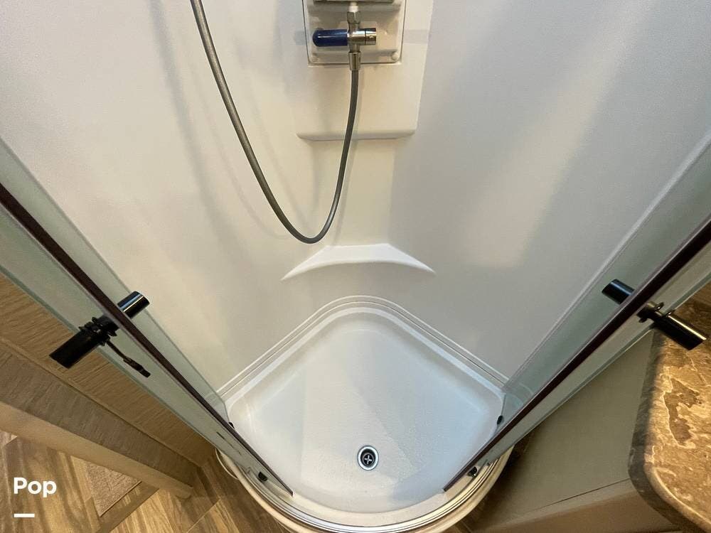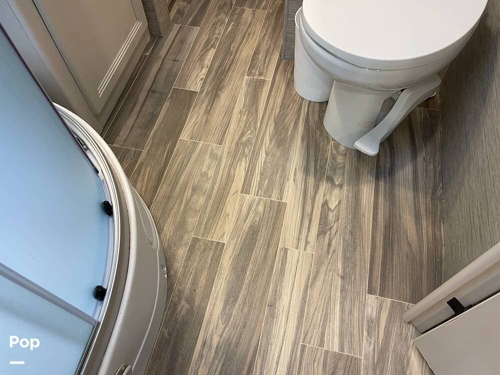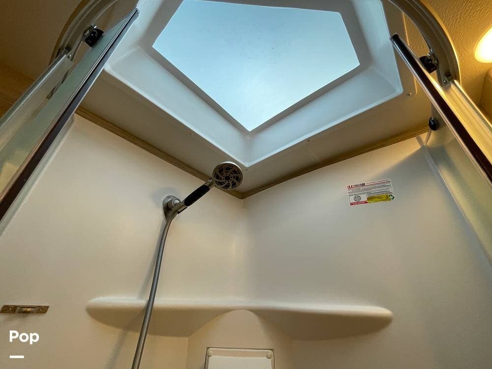 The bathroom features a sink with vanity, a medicine cabinet, a foot-flush toilet, and a shower with a skylight. A ceiling vent with an electric fan and a linen closet above the toilet are also included. The water heater is on-demand, so you don't have to worry about running out of hot water in the tank.