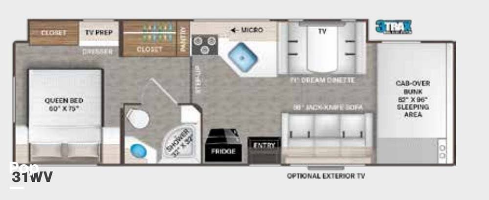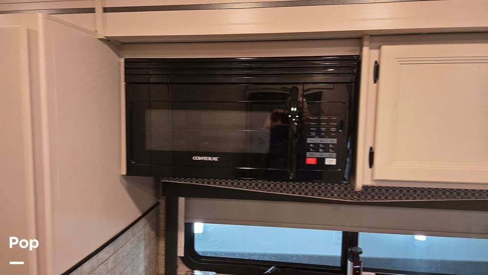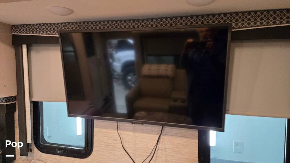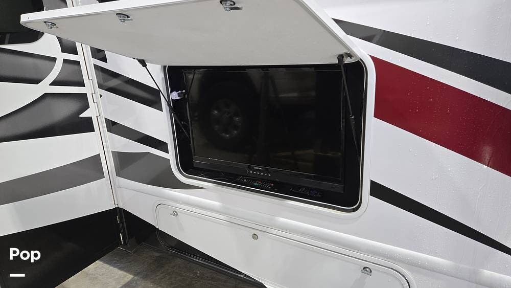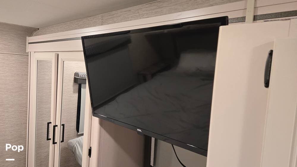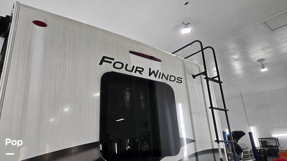 Inside, the Four Winds 31WV offers a well-appointed living space with residential touches throughout. An instant-on 12-volt refrigerator and an on-demand gas water heater ensure efficiency and convenience, while multiple sleeping areas make it ideal for families or guests. Entertainment is well covered with theater seating and three televisions, including an exterior TV that extends the living space outdoors for tailgating or relaxing evenings under the awning.