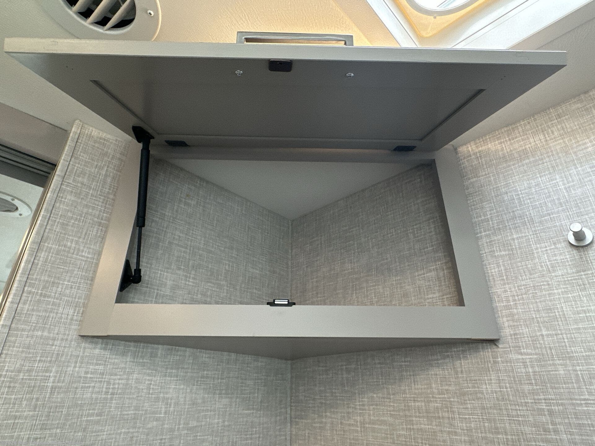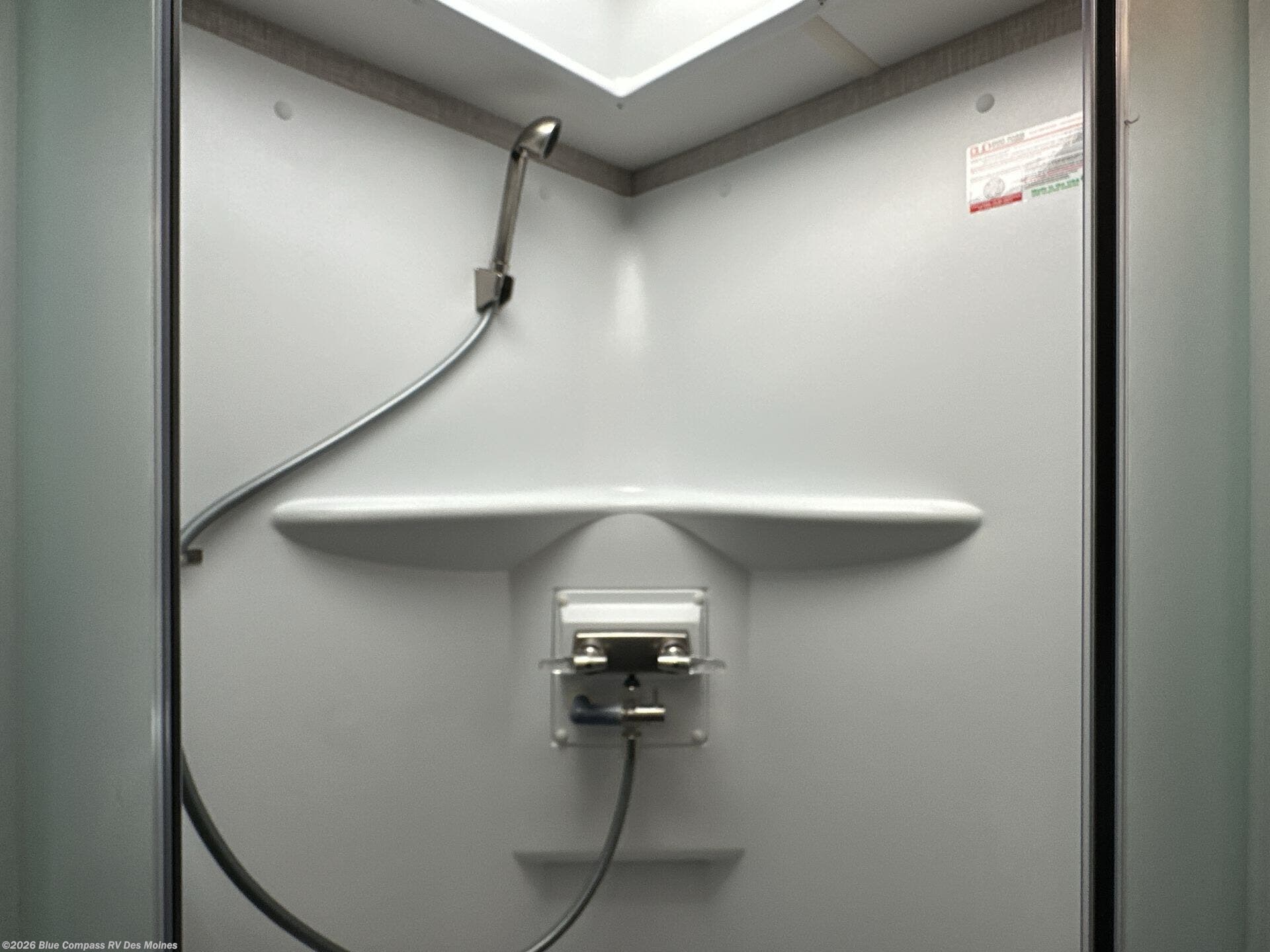With any Geneva Class C gas motorhome by Thor Motor Coach, the interior offers coastline gray flat panel cabinet doors with glacier decor and decorative glass inserts in the kitchen overhead cabinet doors for style, pressed laminated countertops for durability and easy care, and leatherette furniture for comfort, plus conveniences such as a waste basket in the kitchen, a wall cubby with net and USB charging port, and a Showermiser hot water recycling system. The fiberglass front cap with skylight and power shade is a popular feature since it provides natural lighting and beautiful views out of the front, the lighted rotocast storage compartments have a single on/off interior switch allowing you to store items safely during the day or night, the Pet-Link multi-purpose tie down is an added safety feature, plus there are many more standout features. And depending on the coach you choose, there is solar prep or a solar charging system.