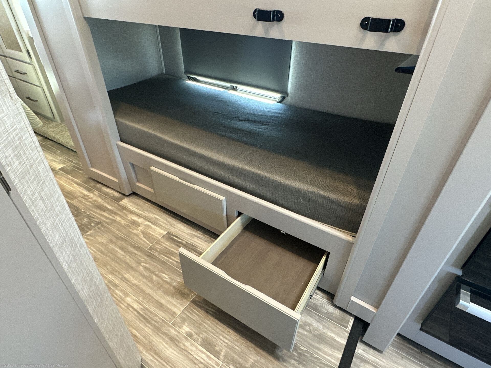 Looking for lots of interior space in your next coach? Do you need plenty of sleeping space when you travel? Well, load up and head out to make memories with your family in this Geneva that offers sleeping space for eight people when you utilize the 71" dream dinette and the 68" jack-knife as sleeping space. You can sleep like a queen in the private rear bedroom, two can sleep on the bunk beds near the full dual entry bathroom, and two will love claiming the cab-over bunk. Everyone can move around easily thanks to the full wall slide out that stretches from behind the driver's leatherette captain chair all the way back to the bedroom. The cook will have full amenities to keep the crew fed, and there are two TVs inside for entertainment and an exterior TV for outdoor time. This coach also includes the SmoothTech ride suspension system by Mor-Ryde, a 100-watt solar charging system with solar controller, a whole coach water filtration system, and holding tanks with heat pads.
