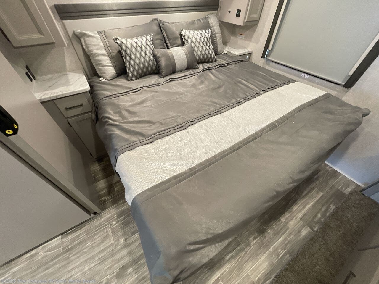 Family trips across the country are made complete in this spacious coach! The swivel captain's chairs can become a part of the living area once you park, and your guests can relax on the Dream Dinette or sofa bed. Lunch can be made on the three burner gas cooktop, or in the 30" over-the-range microwave oven, and clean up will be a breeze in the large double bowl stainless steel sink. This model also includes an outdoor kitchen with a refrigerator and a sink to store cold drinks and clean up before dinner. You will love having your own bedroom to retreat to each night, and here you'll find a king bed, a 32" TV, plus a closet to keep your clothes and shoes tidy!