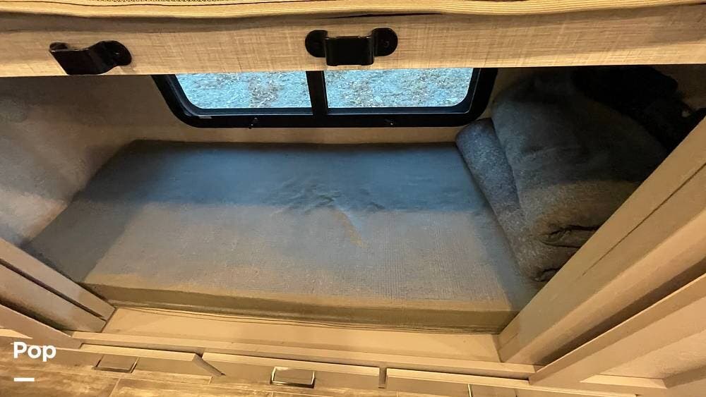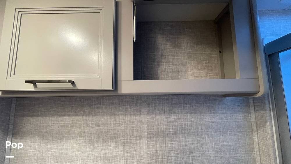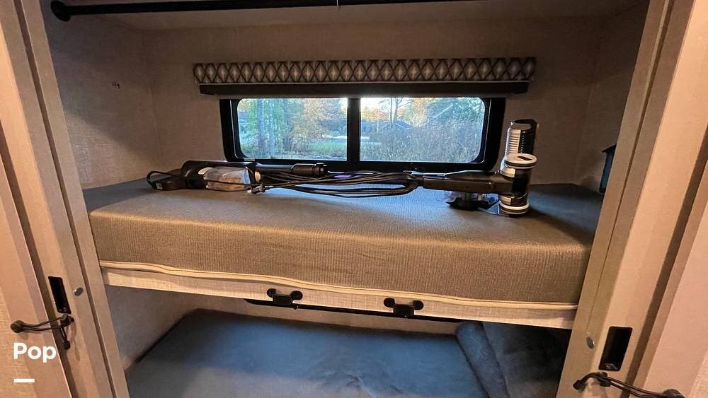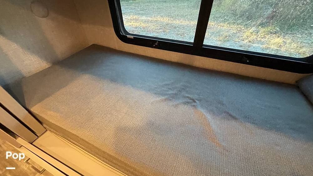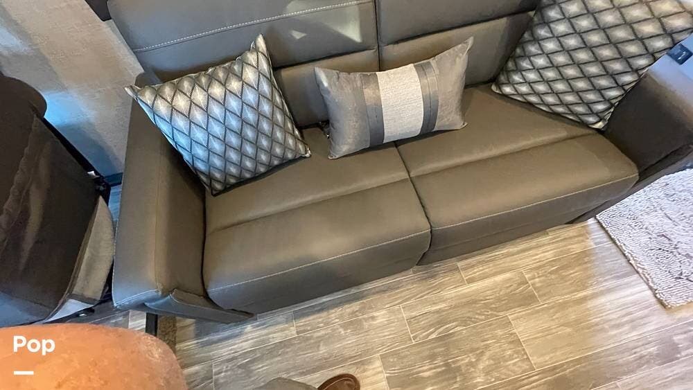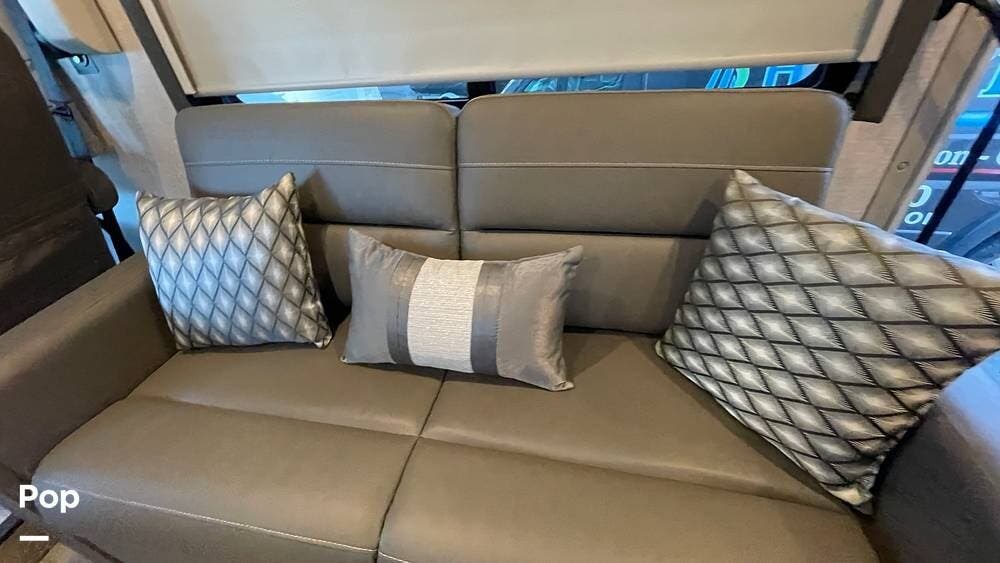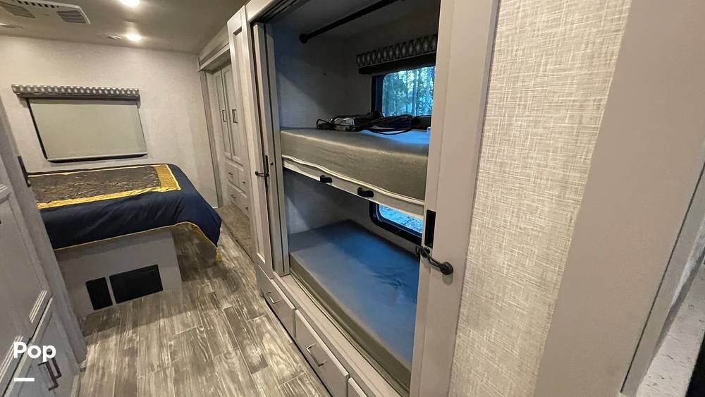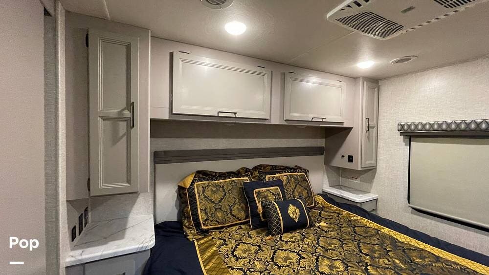 The foldable overhead bunk adds extra sleeping space while keeping the floor clear, providing flexibility for guests. The RV also includes a spacious king-sized bed and a sofa bed for additional sleeping options. A full-wall slide enhances the living area, creating a bright, open environment that feels like home.