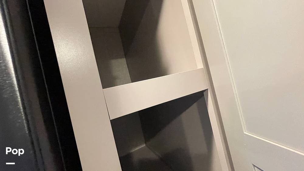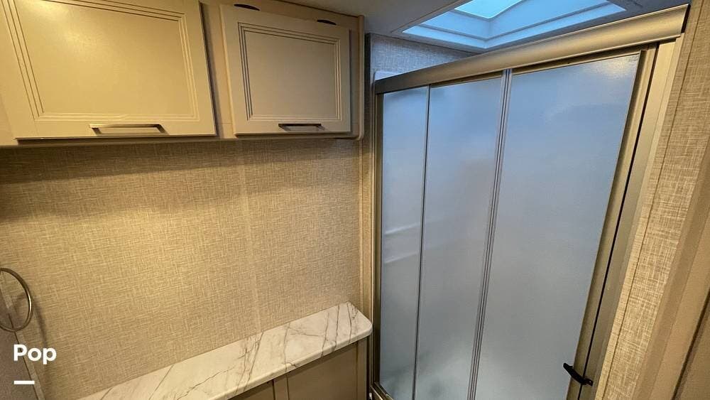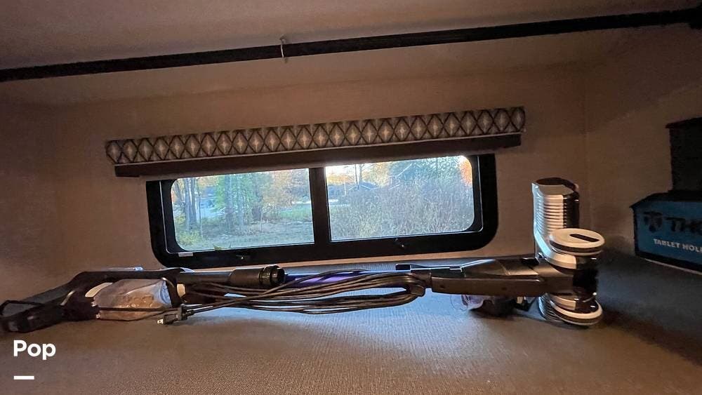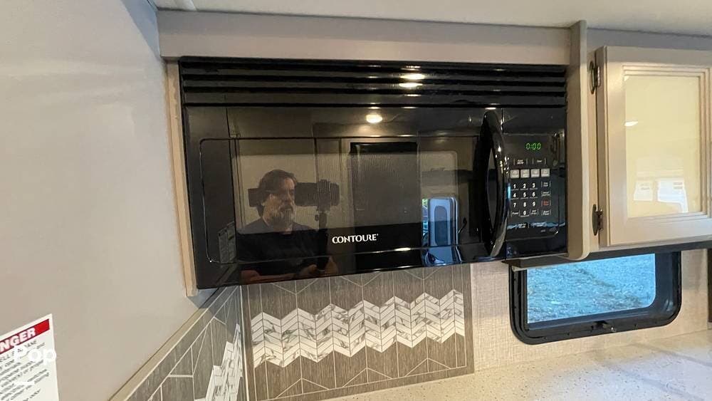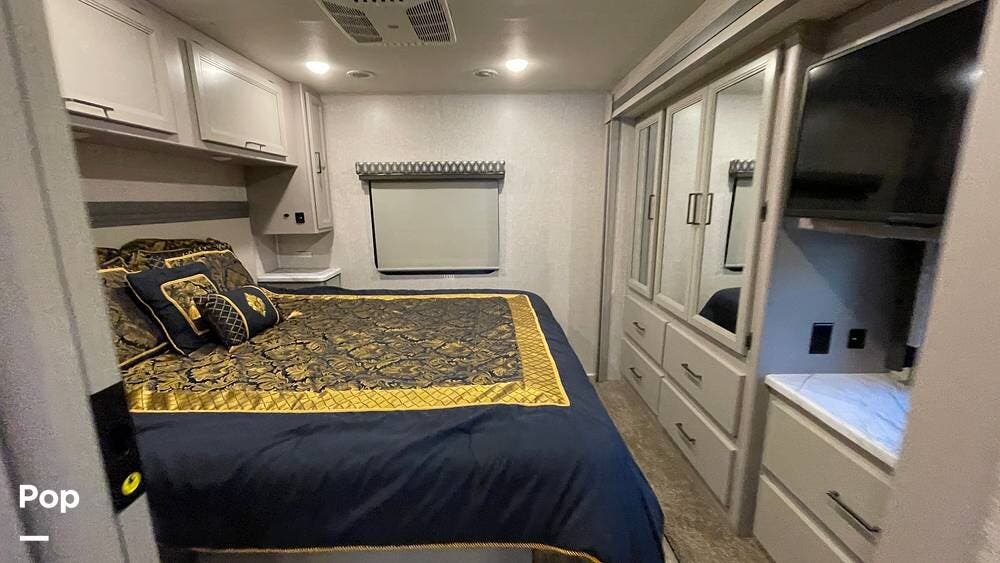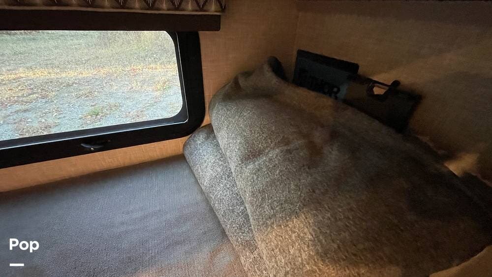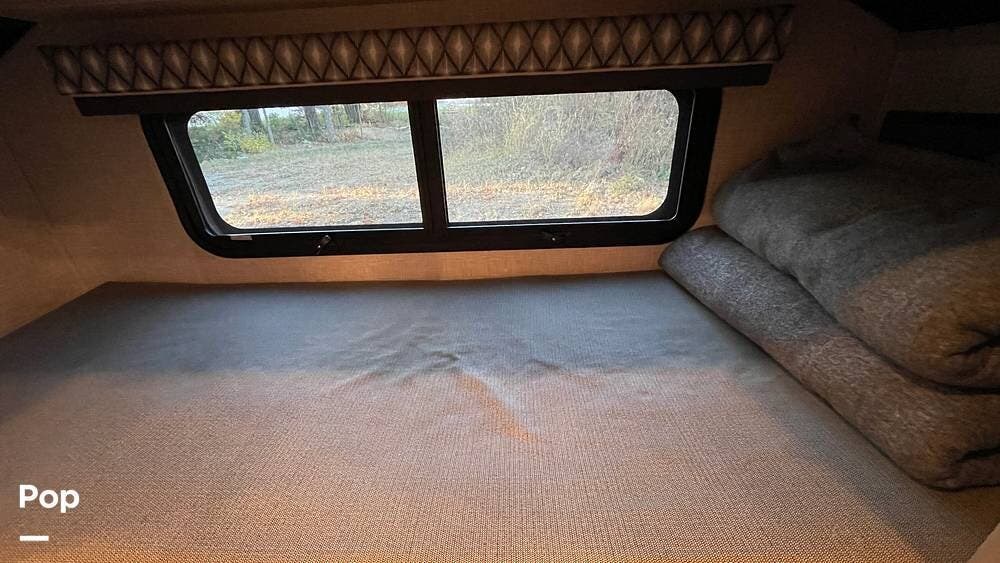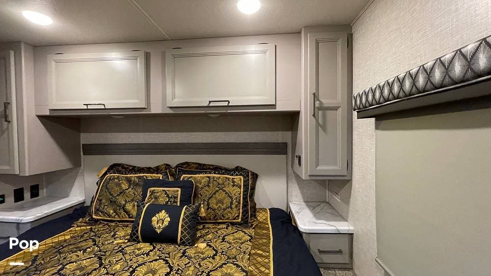 The foldable overhead bunk adds extra sleeping space while keeping the floor clear, providing flexibility for guests. The RV also includes a spacious king-sized bed and a sofa bed for additional sleeping options. A full-wall slide enhances the living area, creating a bright, open environment that feels like home.