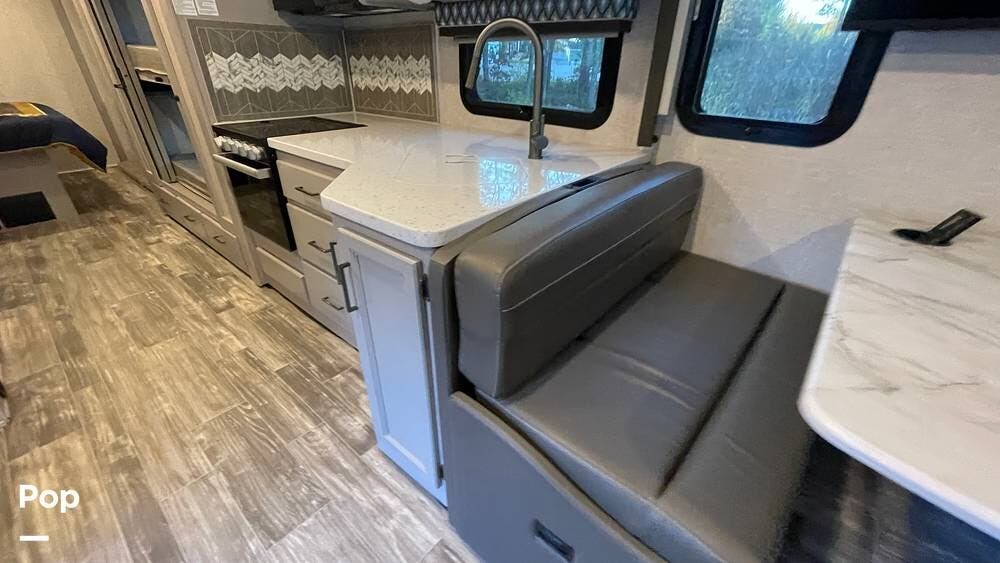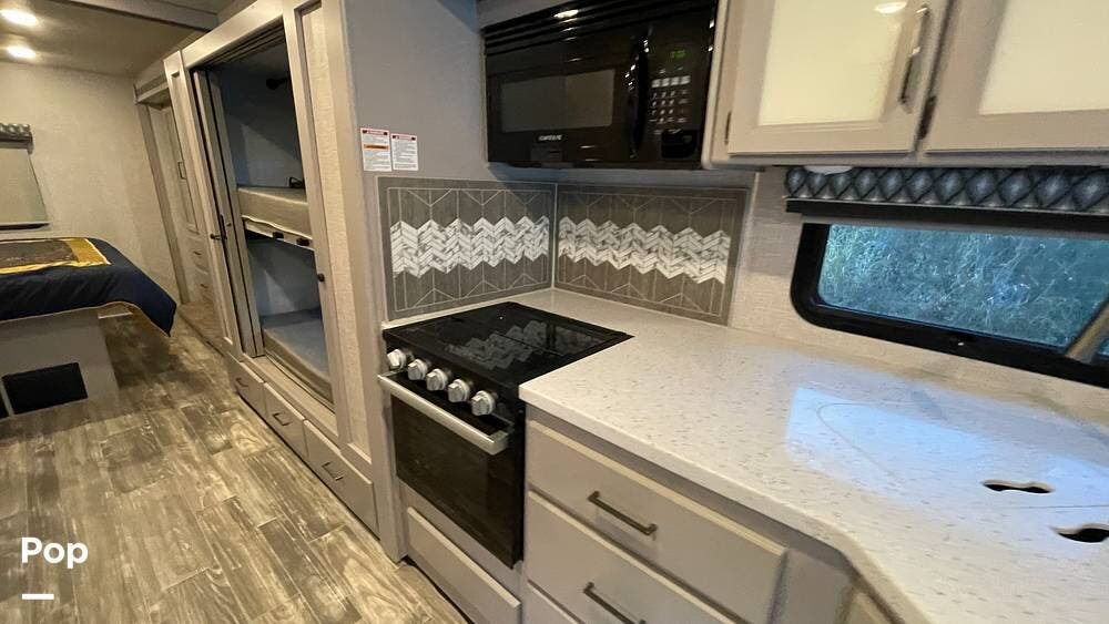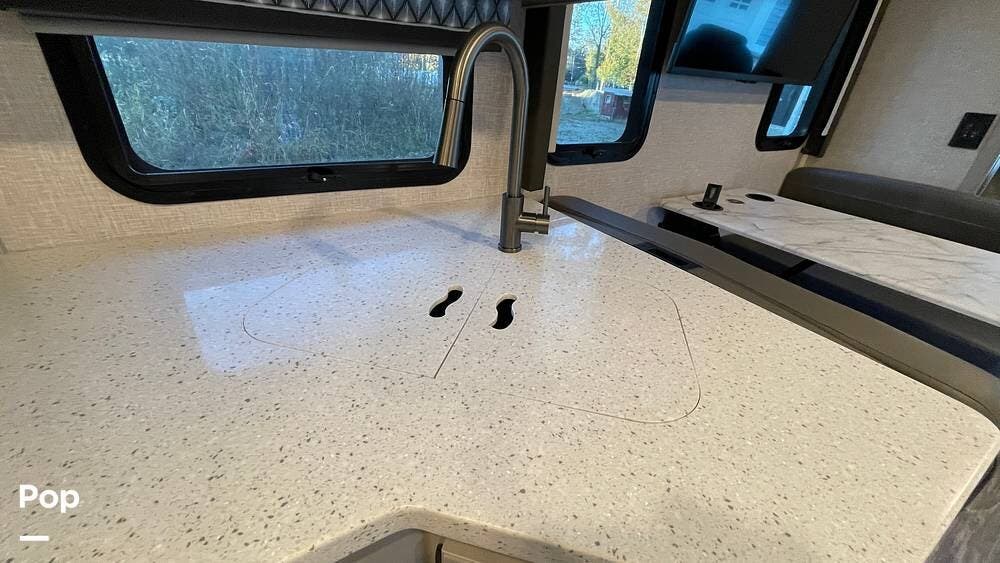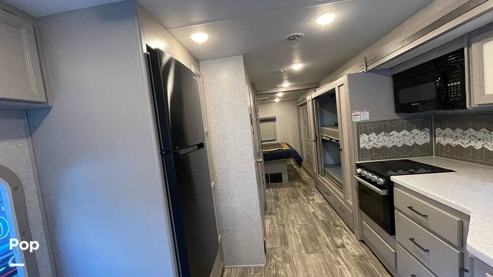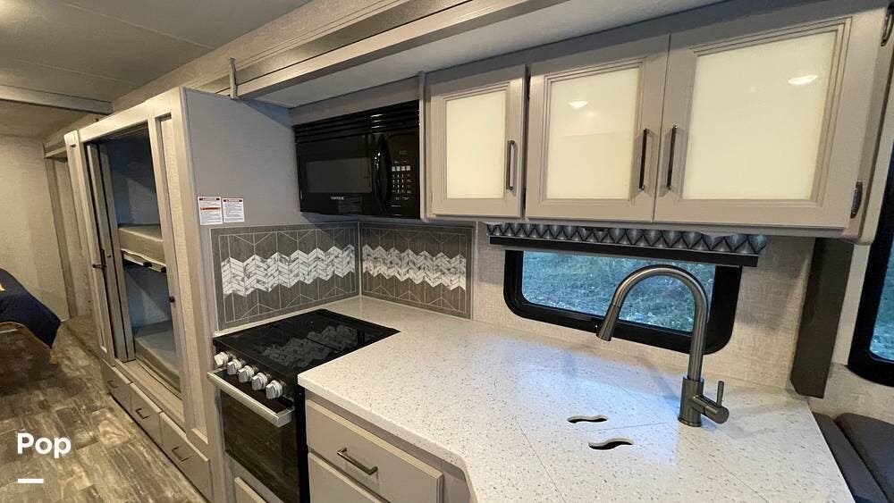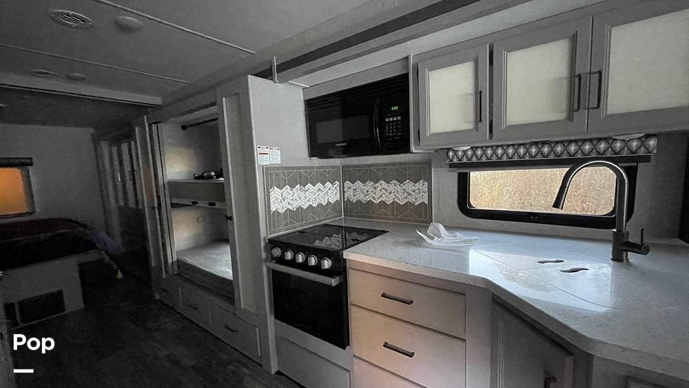 This RV is designed for a pleasant travel experience. It features a 32-inch TV in the bedroom and a 30-inch residential refrigerator for easy meal prep. The kitchen is convenient, with an over-the-range microwave and a three-burner stove for versatile cooking. The stylish dream dinette serves as both a dining area and extra sleeping space, perfect for families.