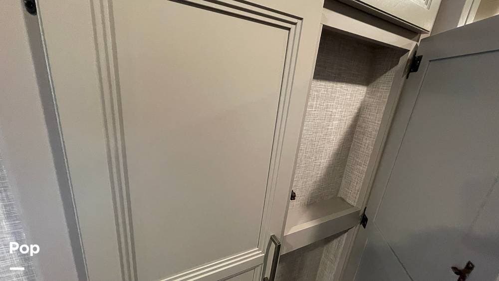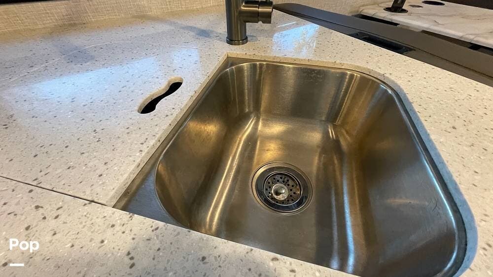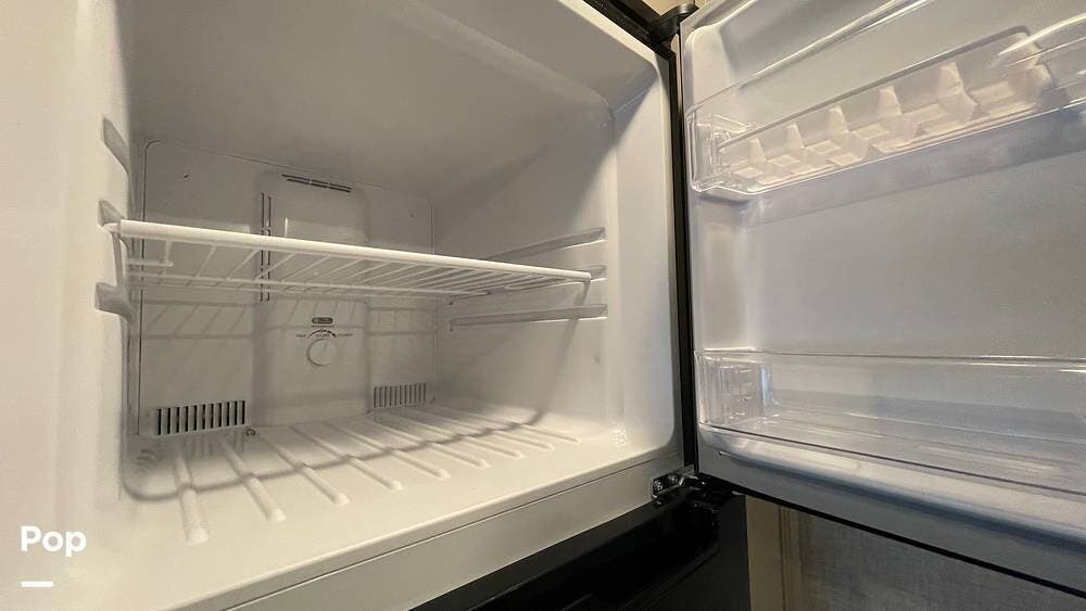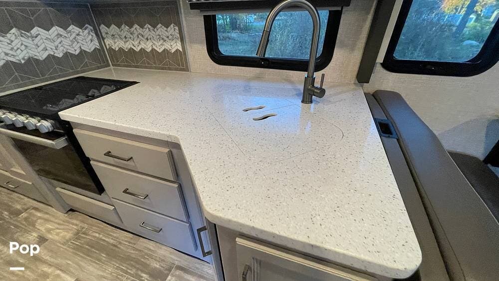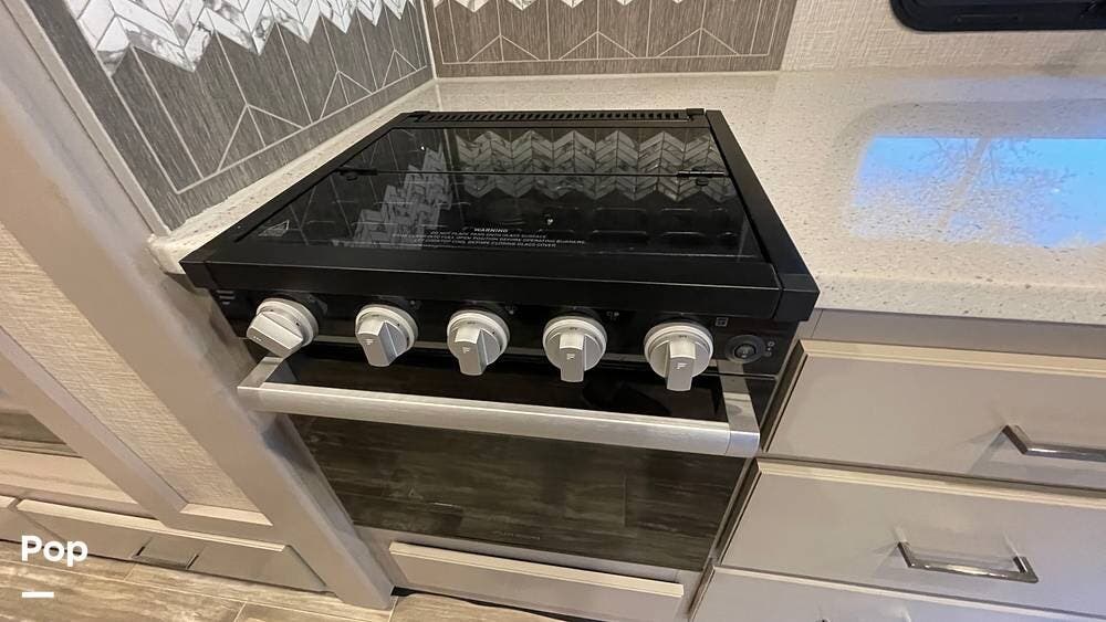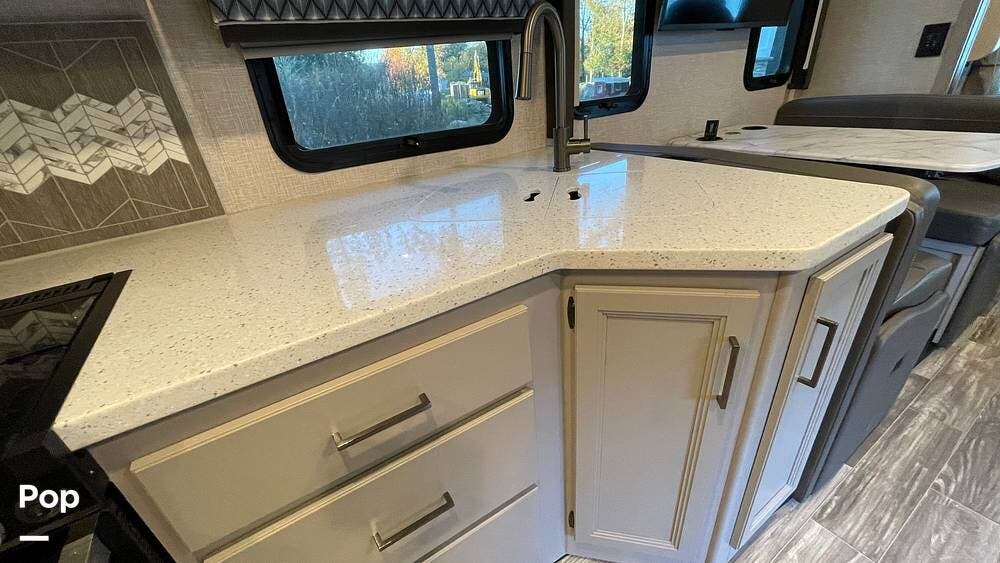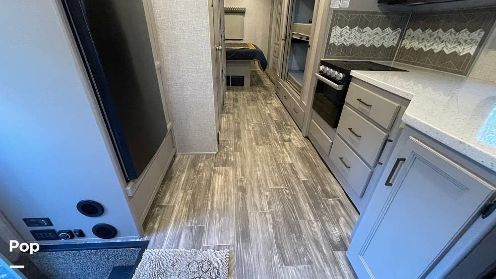 This RV is designed for a pleasant travel experience. It features a 32-inch TV in the bedroom and a 30-inch residential refrigerator for easy meal prep. The kitchen is convenient, with an over-the-range microwave and a three-burner stove for versatile cooking. The stylish dream dinette serves as both a dining area and extra sleeping space, perfect for families.