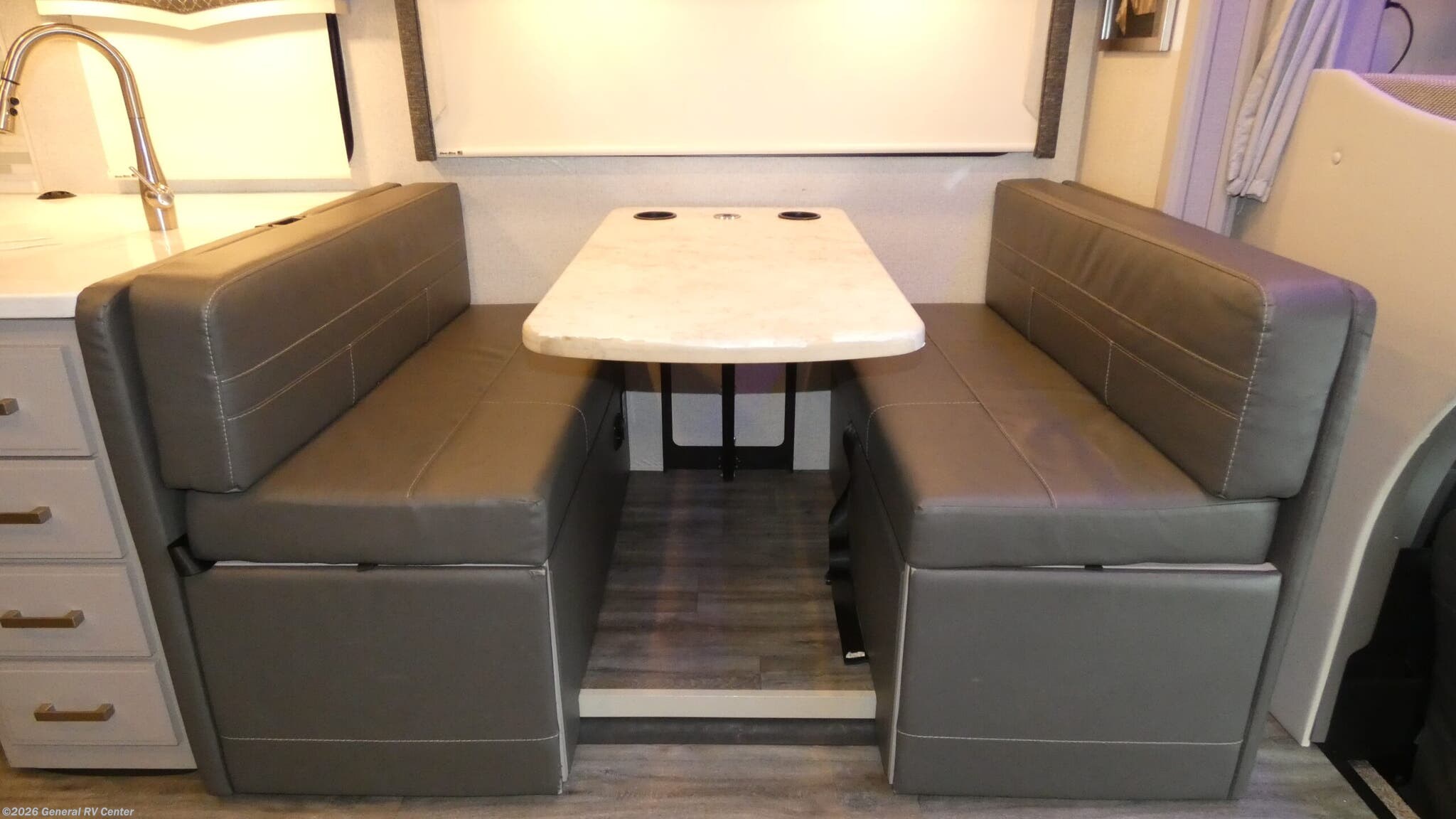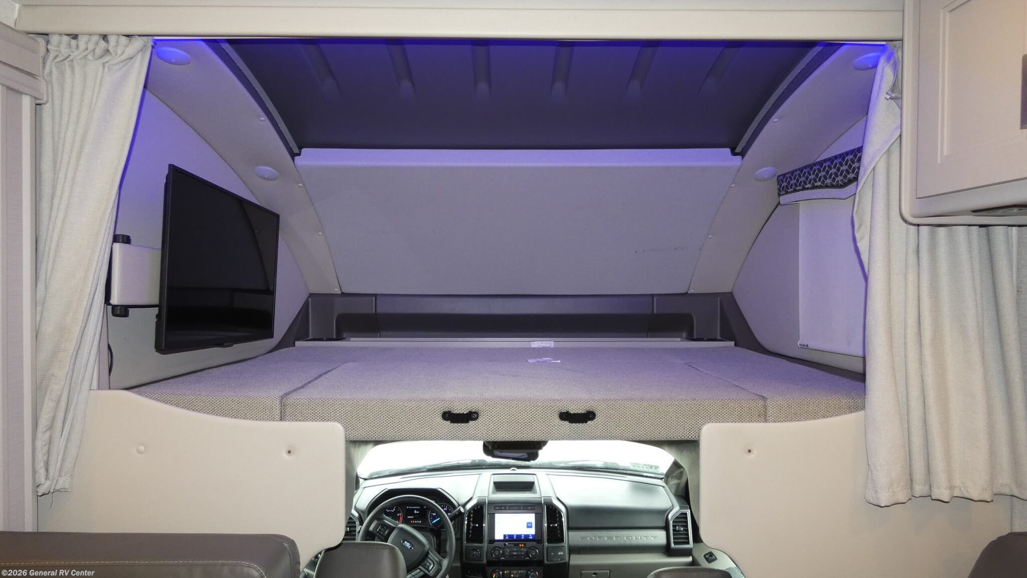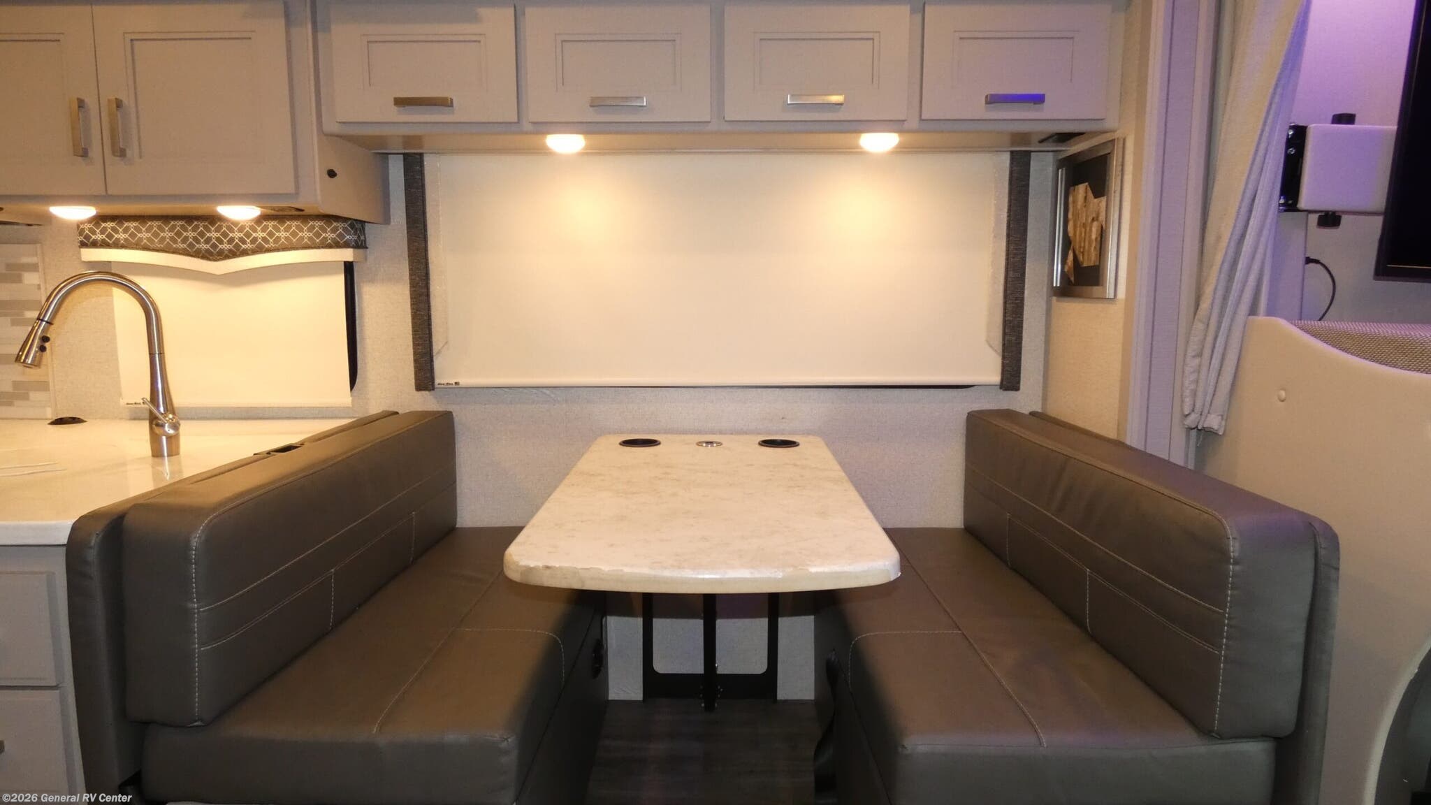 Thor Motor Coach Magnitude LV35 highlights: Large Single Slide 52" x 80" Cabover Bunk Exterior 32" TV 70" Dream Dinette Family travel has never been easier! With a large slide along the driver side you will have plenty of interior space once fully opened up. Step inside and enjoy the combined living and dining spaces with a 70" Dream Dinette within the slide. This is a great place to enjoy your meals at, and you can also play cards and games that can be stored beneath the seating. If needed, you can easily transform the dinette into additional sleeping space. The cabover bunk is 52" x 80" and likely a favorite that your children or teens will want to draw straws for. The kitchen is fully stocked with everything you need to easily cook while you travel. There is a large sink with covers for added counter space, a cook-top and microwave oven, plus ample storage as well. The large refrigerator with freezer will keep all of your perishables fresh and cold, plus there is also a pantry with shelving for dry goods and drawers for even more storage. The rear bedroom with queen bed will be a nice retreat for the end of the day to relax and watch TV before bed, and a full bath including shower, toilet, and linen storage makes it easy for everyone to keep fresh and clean. In the rear bedroom, you will find ample storage with bedside wardrobes and drawers, plus a closet next to the pantry can provide more storage space overall, or you might choose to add an optional washer/dryer here. An outdoor 32" TV can be enjoyed by all as you get some fresh air, and inside all can enjoy the 39" swivel TV above the cabover bunk from the dinette, theater seating, or optional sofa as well. There is also a full pass-through storage area with easy access to all of your outdoor gear. Make your journeys fantastic with the Thor Motor Coach Magnitude Super C diesel motorhome! The powered sky view shade above the cab area will let you feel the sun's rays while you travel down the road, and the cab has some additional features that will make traveling more enjoyable, like the FordPass Connect 4G Wi-Fi modem, rearview mirror with backup monitor, AM/FM and SiriusXM radio, and 8" color LCD touchscreen. The 7' interior ceiling will accommodate passengers of any height, and the pop-up outlet in the kitchen will give you a convenient location to charge devices. The dual roof air conditioners will keep you cool on the hottest days in summer, and the Onan RV QD diesel generator will power your coach and all of its electrical functions. You will also find a Winegard® ConnecT™ Wi-Fi extender + 4G and a Bluetooth coach radio system in the bedroom for some extra entertainment.