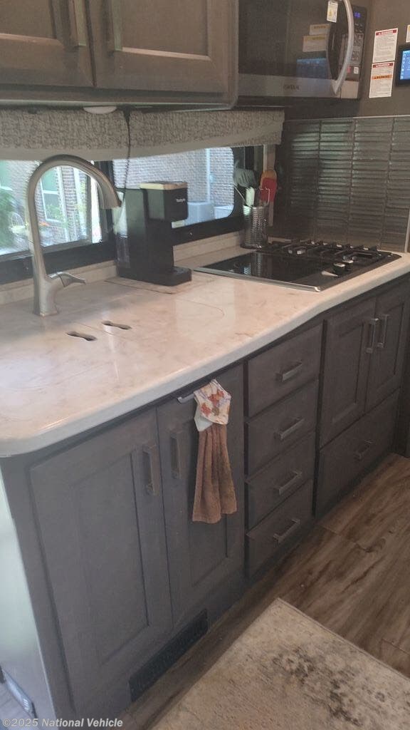 The spacious living area features multiple slide-outs, comfortable seating, and Smart TVs throughout, making it easy to relax or entertain on the road. The well-designed kitchen includes solid-surface countertops, ample cabinetry, residential-style appliances, and excellent pantry storage.