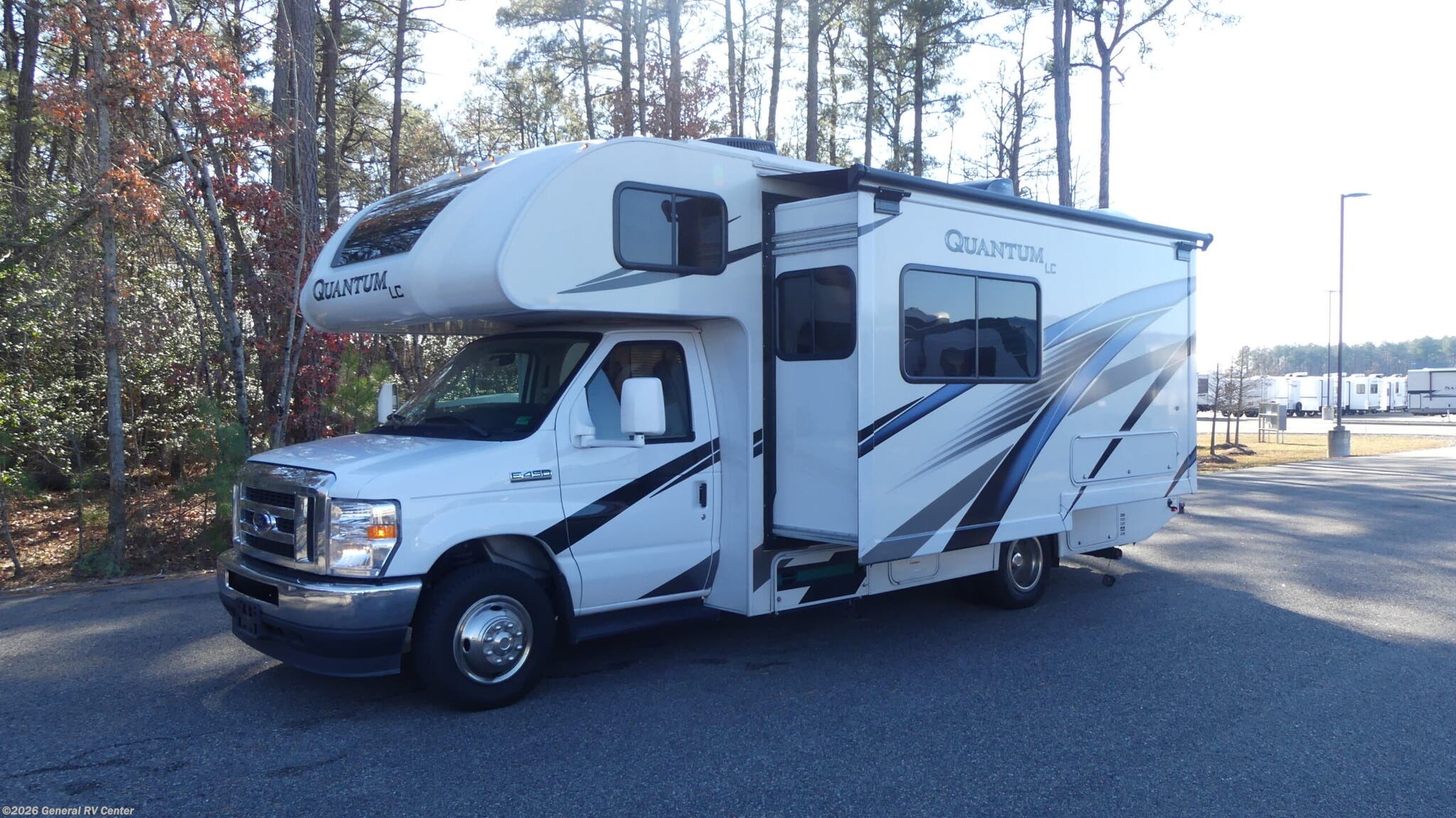 **Thor Motor Coach Quantum LC Class C gas motorhome LC25 highlights:** * Full Rear Bath * Flip-Up Countertop * Pantry * Large Slide Out * Cab-Over Bunk You're going to love the amount of space in this coach thanks to the large slide out. Here, you'll find the leatherette Dream Dinette and the sofa with a Murphy bed for versatility. There is even a privacy curtain around the bed so you can enjoy your own space at night. The full-equipped kitchen includes a 12V refrigerator, a microwave oven, plus a three burner cooktop with an oven and glass cover for more counter space. This model also includes a 39" TV with a swivel in the cab-over, plus a 32" TV across from the bed. Each Quantum LC Class C gas motorhome by Thor Motor Coach features welded tubular aluminum roof and sidewall cage construction for durability, plus a fiberglass front cap with a skylight and power shade to let natural light in. There are also black framed windows, lighted rotocast storage compartments, plus a sterling exterior with a graphics package you are sure love. The interior is designed to make you feel at home with residential vinyl flooring, pressed laminate countertops, and flat panel cabinet doors. All of your power needs will be met with a 4.0 kW gas generator on board, plus a second auxiliary house battery, and solar prep that includes a solar controller if you choose that option. Don't let another day go by, choose a Quantum LC and start adventuring today!