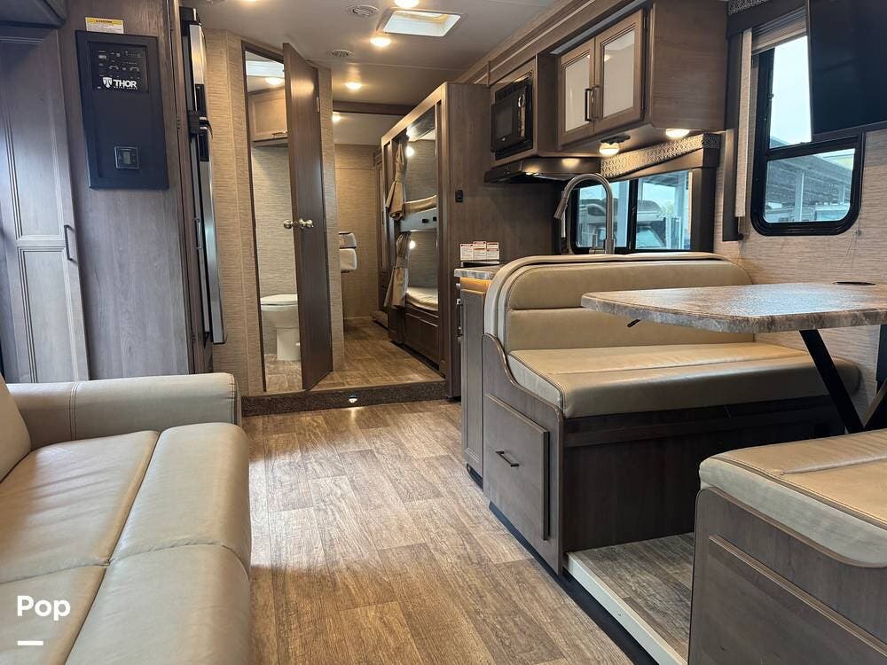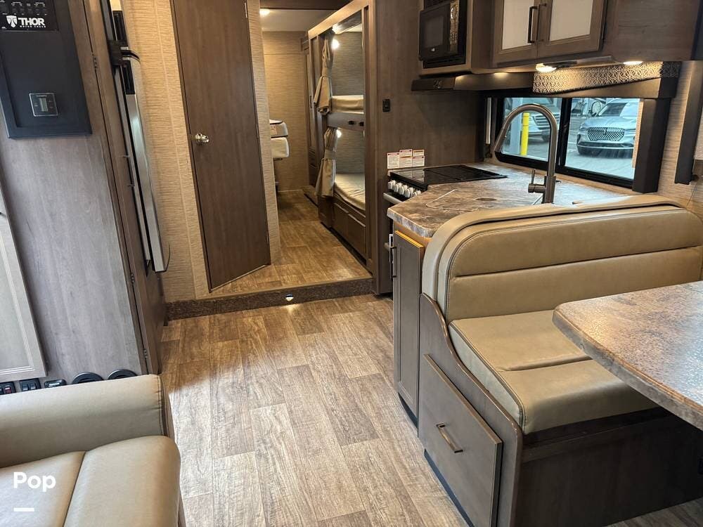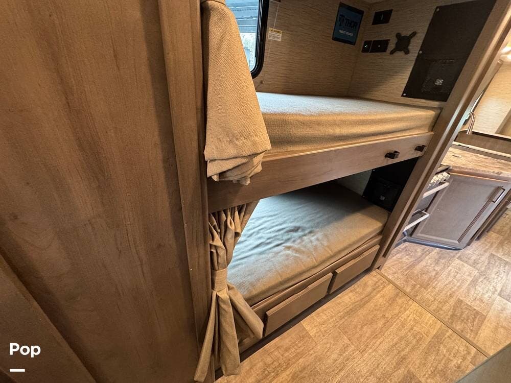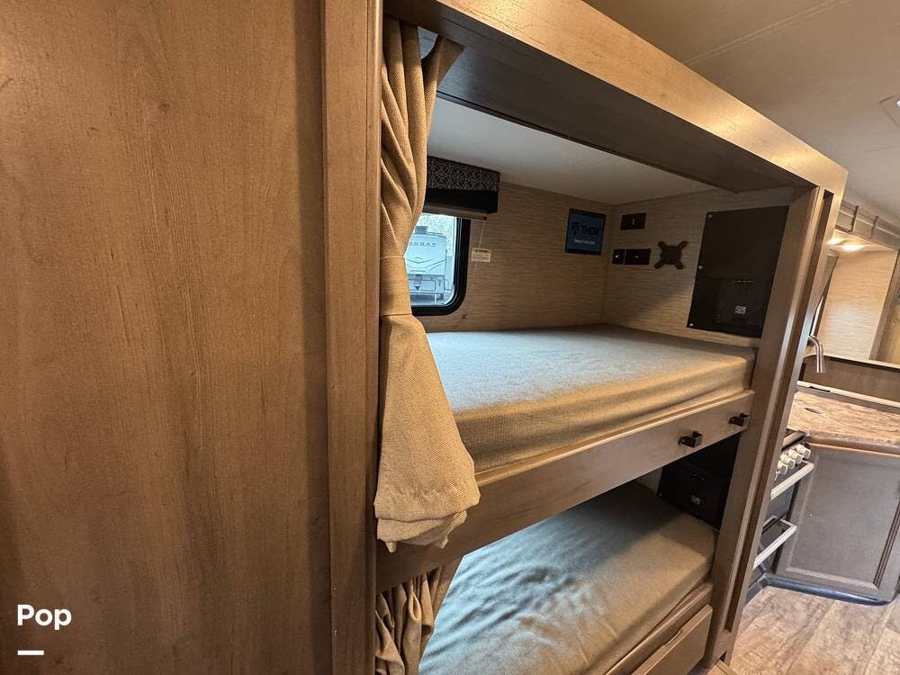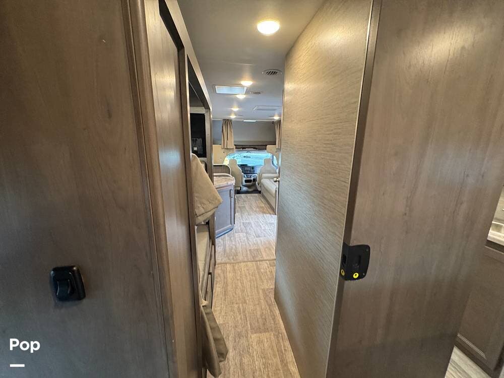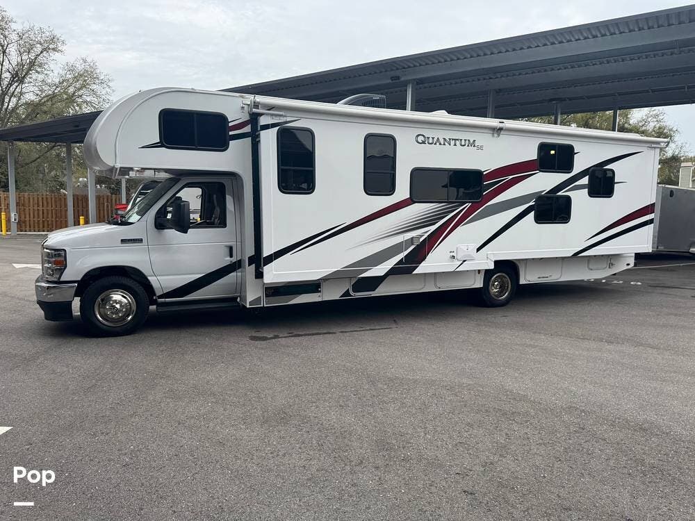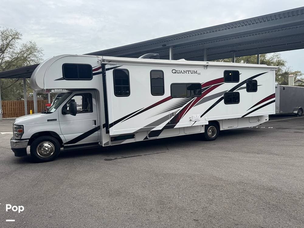 This beautifully maintained 2023 Quantum SL31 SE by Thor Motor Coach is the perfect family-friendly Class C with a highly sought-after bunk bed floorplan. It features a private rear queen bedroom, dedicated hallway bunk beds, a cab-over bunk, and convertible dinette and sofa--comfortably sleeping up to 8 without having to convert your entire living space each night. The large slide-out creates an open, spacious feel, while the fully equipped kitchen includes a 3-burner cooktop with oven, microwave, large refrigerator, solid surface countertops, and ample storage. Enjoy a full bathroom with spacious shower, onboard generator, and a power awning with LED lighting. Built on the reliable Ford E-Series chassis with a powerful V8 engine, this coach is clean, lightly used, and road-trip ready.