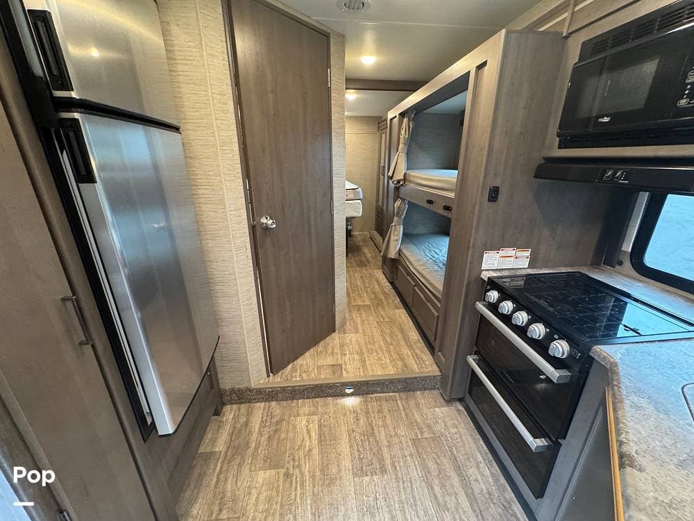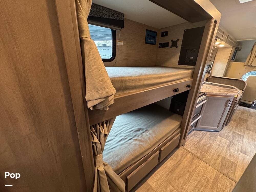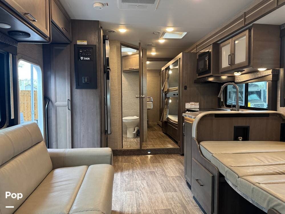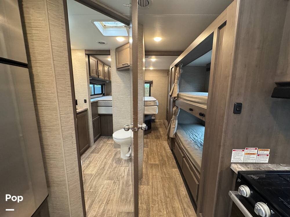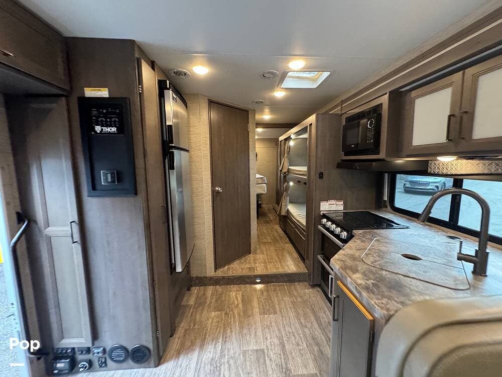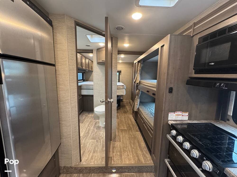 This beautifully maintained 2023 Quantum SL31 SE by Thor Motor Coach is the perfect family-friendly Class C with a highly sought-after bunk bed floorplan. It features a private rear queen bedroom, dedicated hallway bunk beds, a cab-over bunk, and convertible dinette and sofa--comfortably sleeping up to 8 without having to convert your entire living space each night. The large slide-out creates an open, spacious feel, while the fully equipped kitchen includes a 3-burner cooktop with oven, microwave, large refrigerator, solid surface countertops, and ample storage. Enjoy a full bathroom with spacious shower, onboard generator, and a power awning with LED lighting. Built on the reliable Ford E-Series chassis with a powerful V8 engine, this coach is clean, lightly used, and road-trip ready.