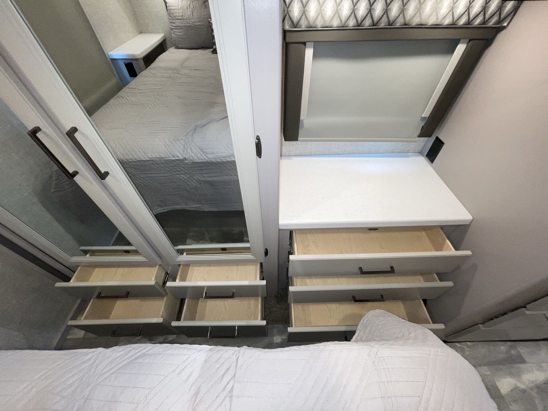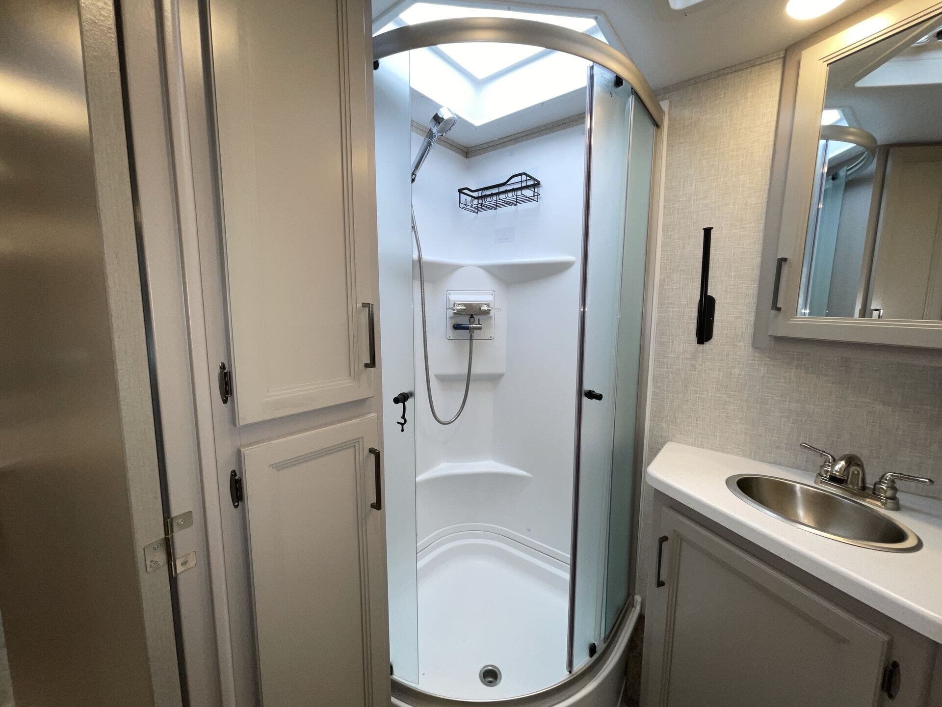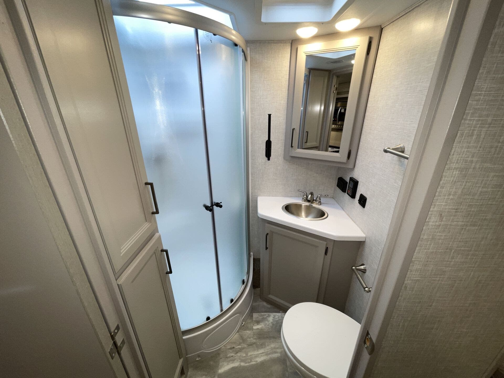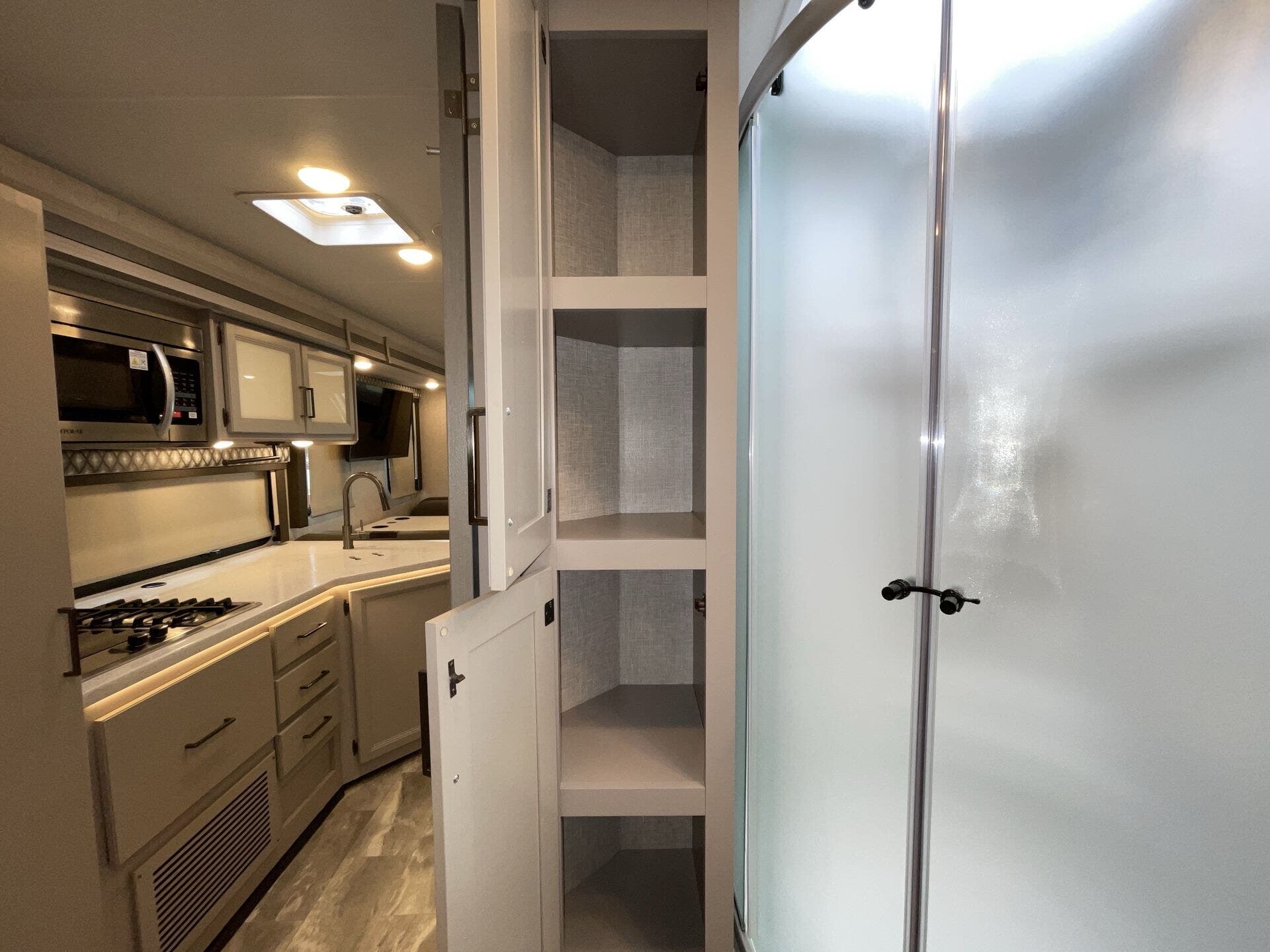 Booth Dinette, Day/Night Shades, Dinette, Dinette Bed, Glass Shower Door, Kitchen Sink, Medicine Cabinet, Overhead Cabinetry, Pantry, Queen Bed, Roof Vents, Shower, Sofa Bed, Solid Surface Countertops, Toilet, Wardrobe(s)