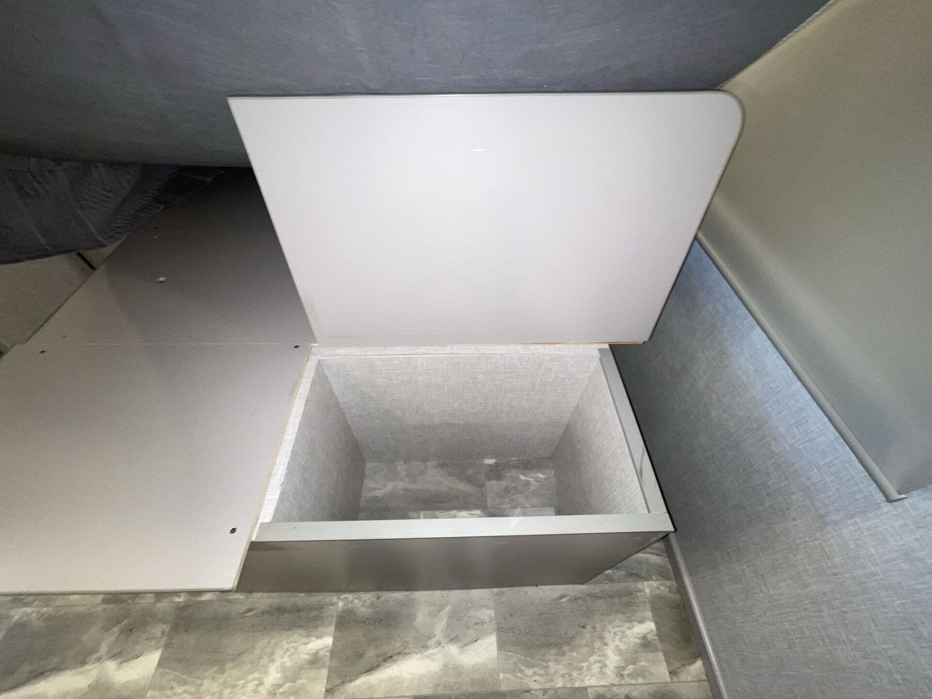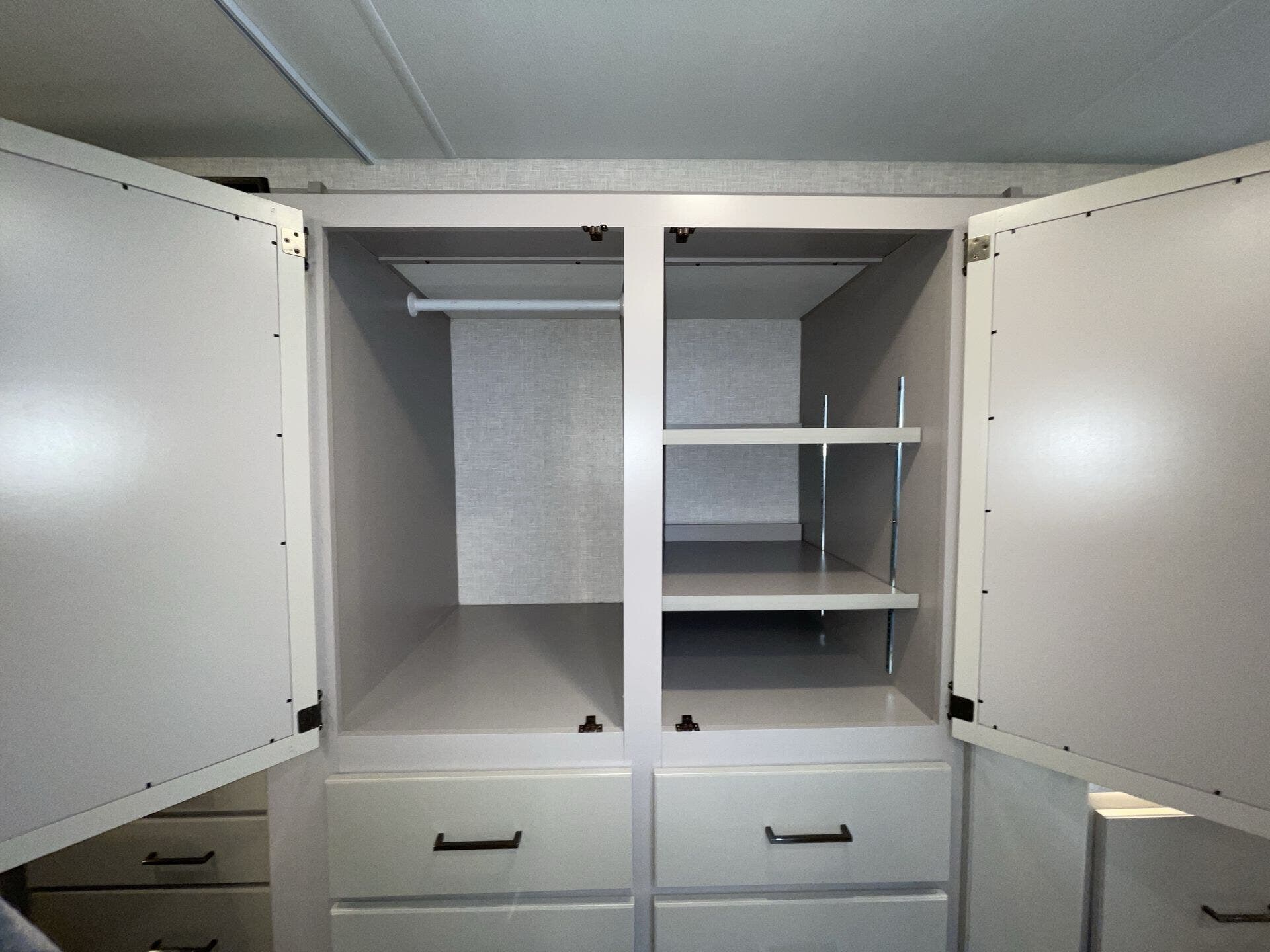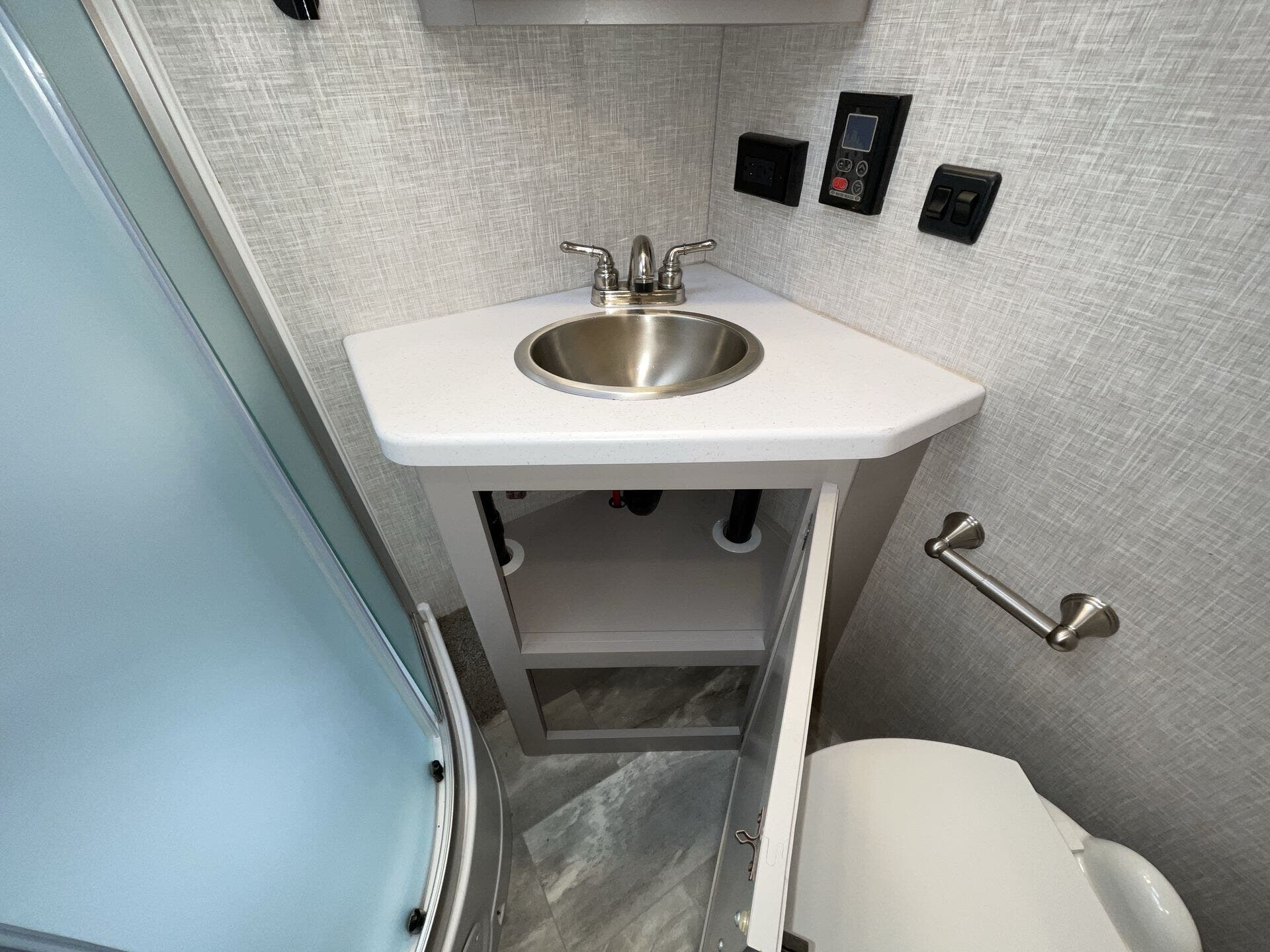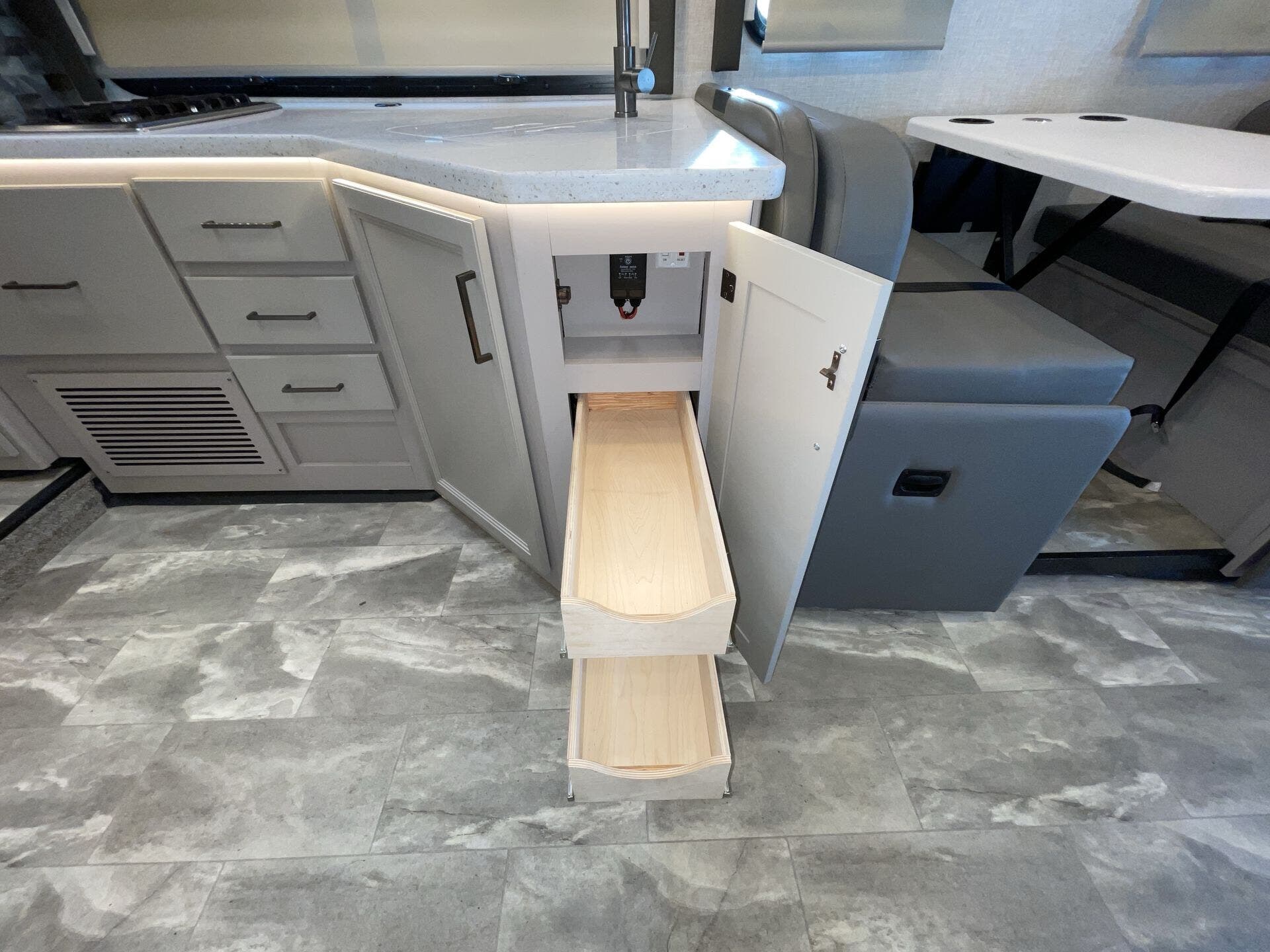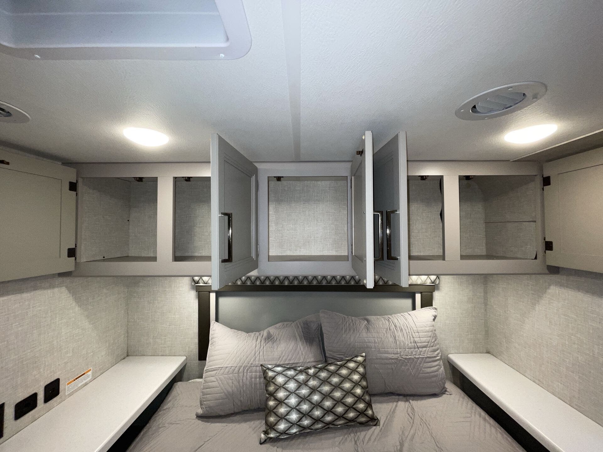 The bedroom is private and cozy, with good storage for clothes and gear. The bathroom has a nice shower and enough room to actually move around. The kitchen is practical — fridge, counter space, and storage that makes cooking on the road feel easy instead of cramped.