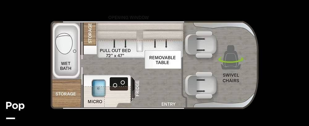 The main living space features a pull-out bed measuring 72 inches by 47 inches, giving two adults a genuinely comfortable night's sleep. A removable table creates a flexible dining or work area, and premium window privacy roller shades let you control the light and maintain your privacy wherever you choose to park for the night.