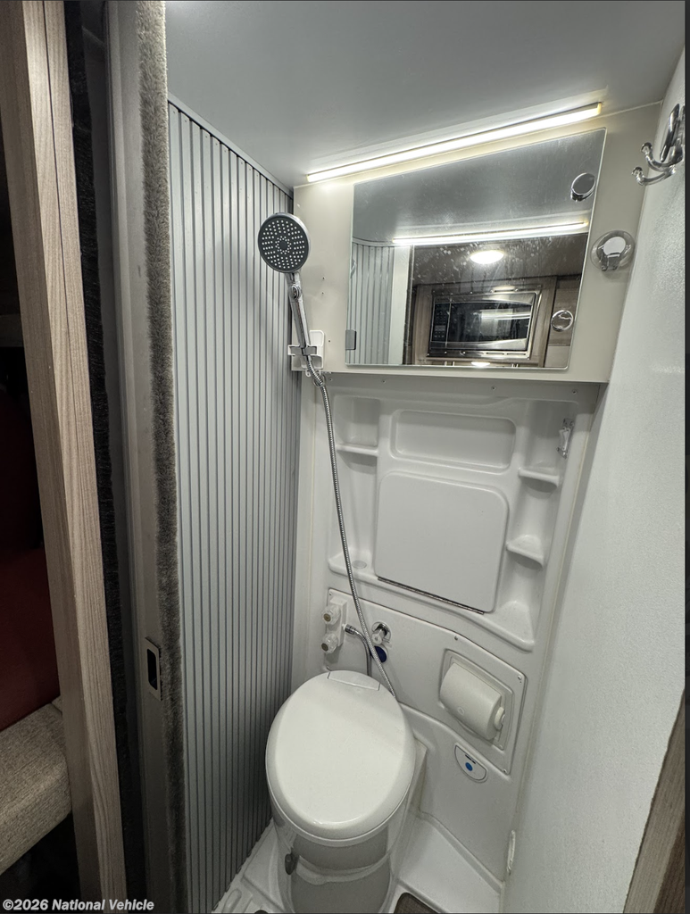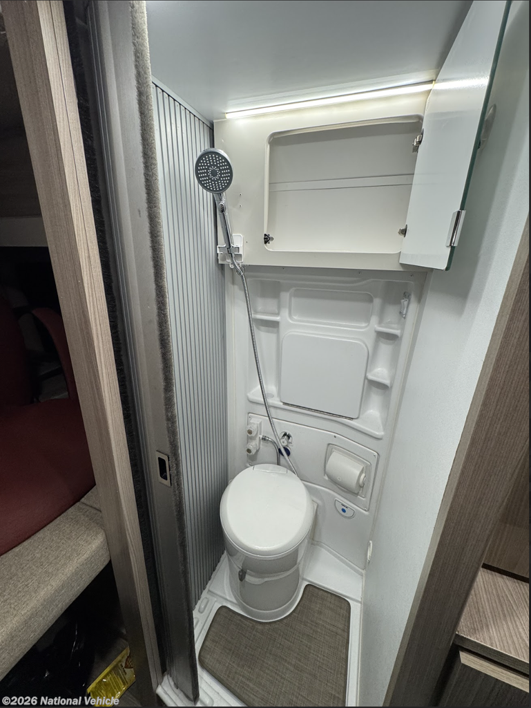 The fully equipped galley is designed for efficiency and convenience, featuring a two-burner gas cooktop, microwave, refrigerator, and ample storage?everything needed to prepare meals on the road. Adjacent, the all-in-one wet bath includes a shower and cassette toilet, offering true self-contained capability wherever your travels take you.