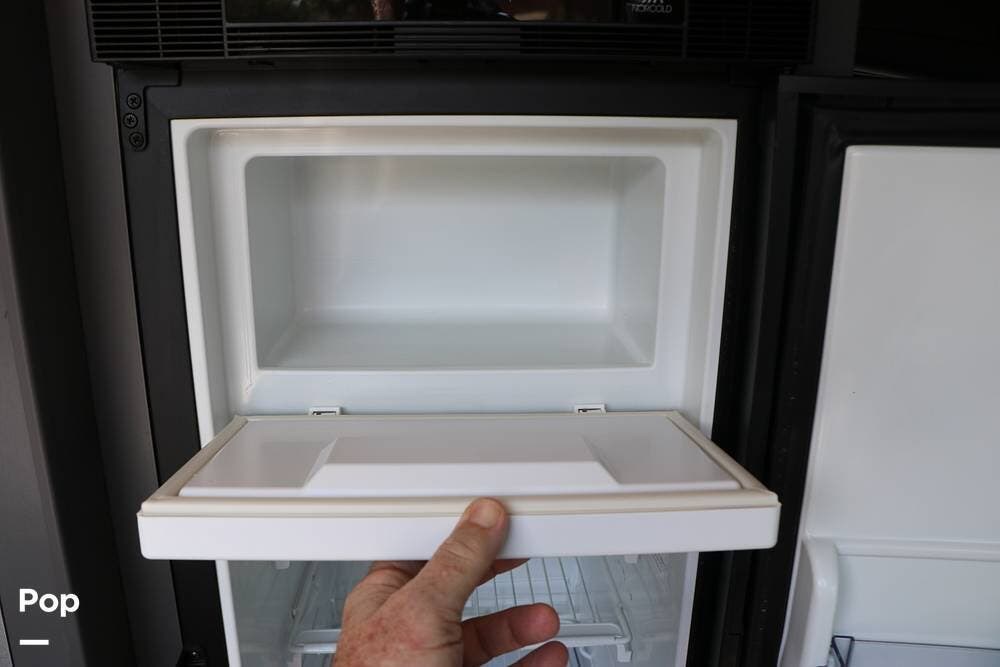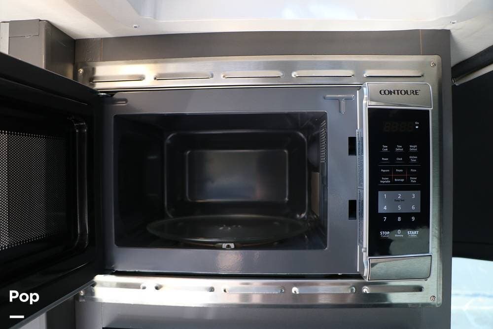The layout is comfortable - the unit features a galley with a microwave oven, a refrigerator with an interior freezer compartment, a kitchen sink with a matching cover and a gooseneck faucet, and ample storage space above and below the solid surface countertops.