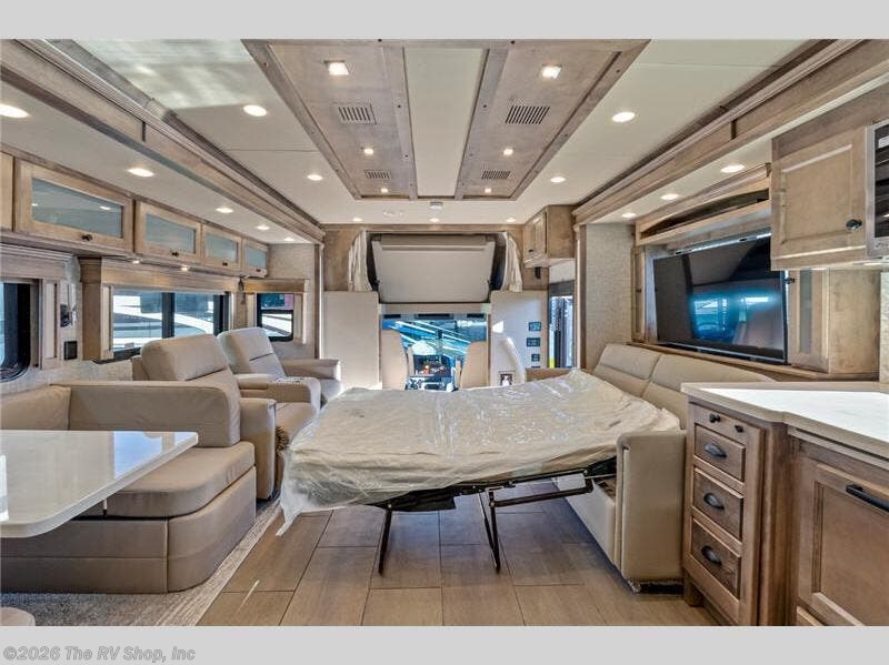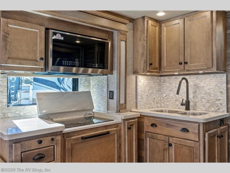 Head across the country in this luxury coach for nine! The dual opposing slides in the main living area will provide you with tons of space to stretch out once you park, and you'll find seating space on the two sofa beds and the booth dinette. The chef can whip up a hearty meal on the three burner cooktop with a convection microwave, and the Expand-An-Island will come in handy when they need extra counter space. The private toilet and sink are right across from the shower so two people can freshen up at once, and you'll love having the rear bedroom all to yourselves. Here, you'll find a king bed slide out that can be optioned out for a queen, a large wardrobe with a bank of drawers, plus an optional washer and dryer if you choose to add. The interior is inviting, but you will also love spending time outdoors under the power awning with LED lights as well.