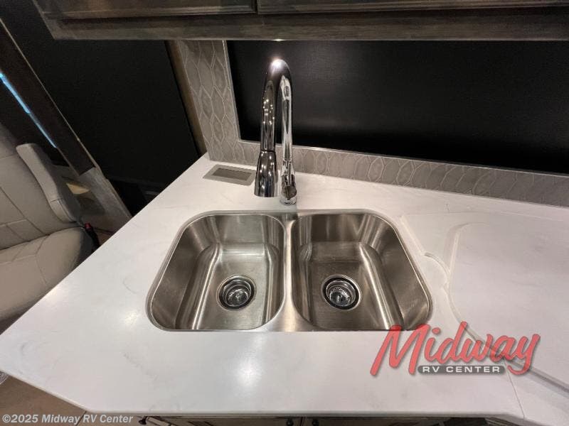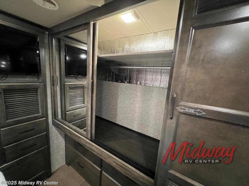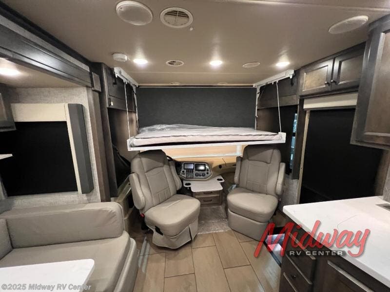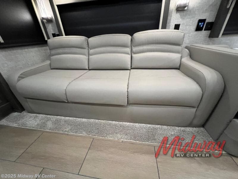 You will feel right at home in this motorhome! It features a rear private bedroom with a king bed slide that has an egress window behind it, a single cabinet with a flat panel TV, bank of drawers below it, and a wardrobe with drawers below, plus an area prepped to add an optional washer and dryer. Just outside the bedroom is the separated bathroom where one person can freshen up in the shower while another uses the private toilet and lav sink. After you have prepared a delicious meal with the three burner cooktop, you can enjoy it at the booth dinette and play a card game or relax on the ultraleather flip and fold sofa bed. The sofa bed can be switched out for an optional ultraleather air coil sofa bed, and the booth dinette can be switched out for an optional dinette with computer work station. You can also choose to add an optional drop-down front bunk for more guests to tag along!