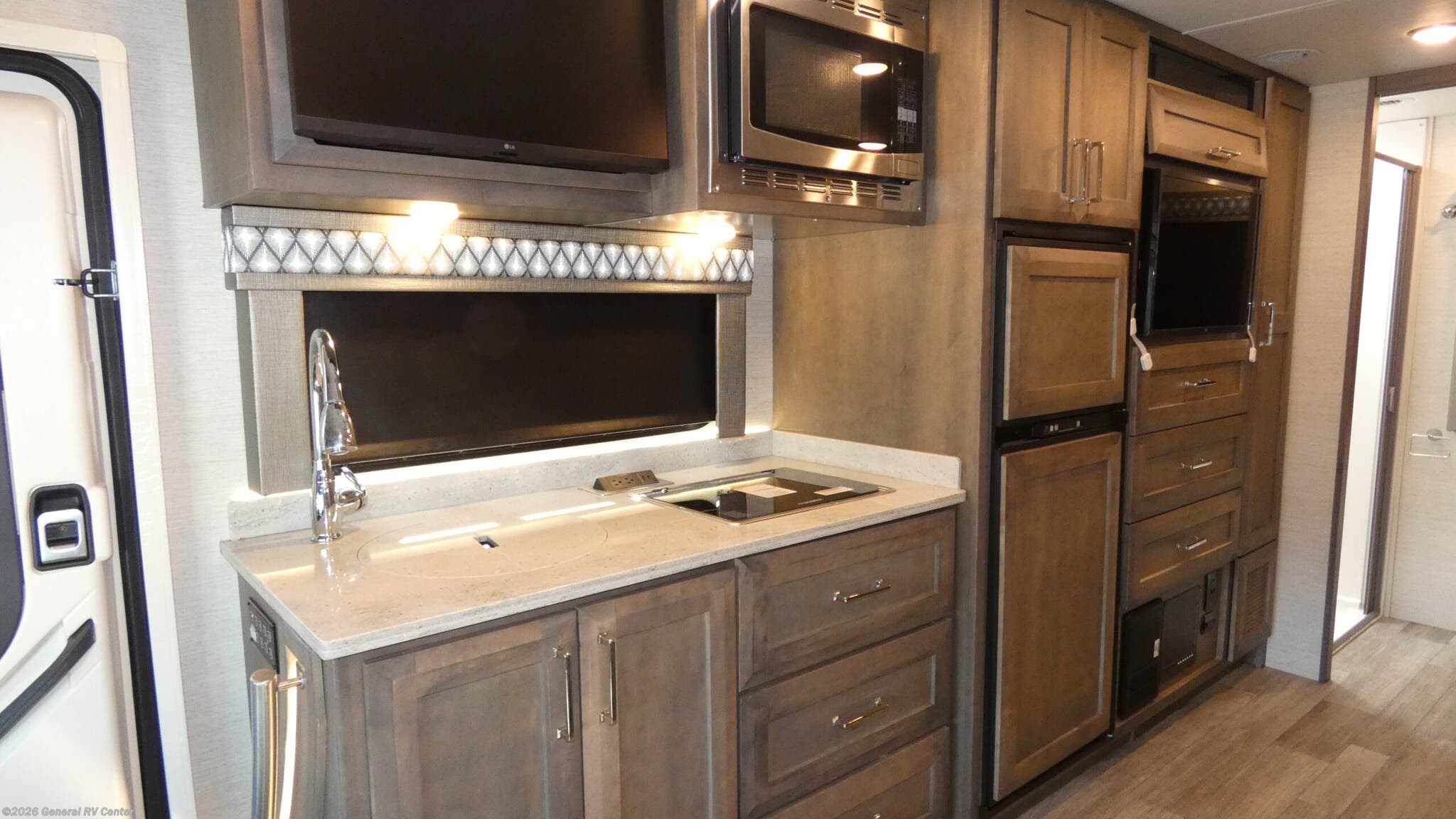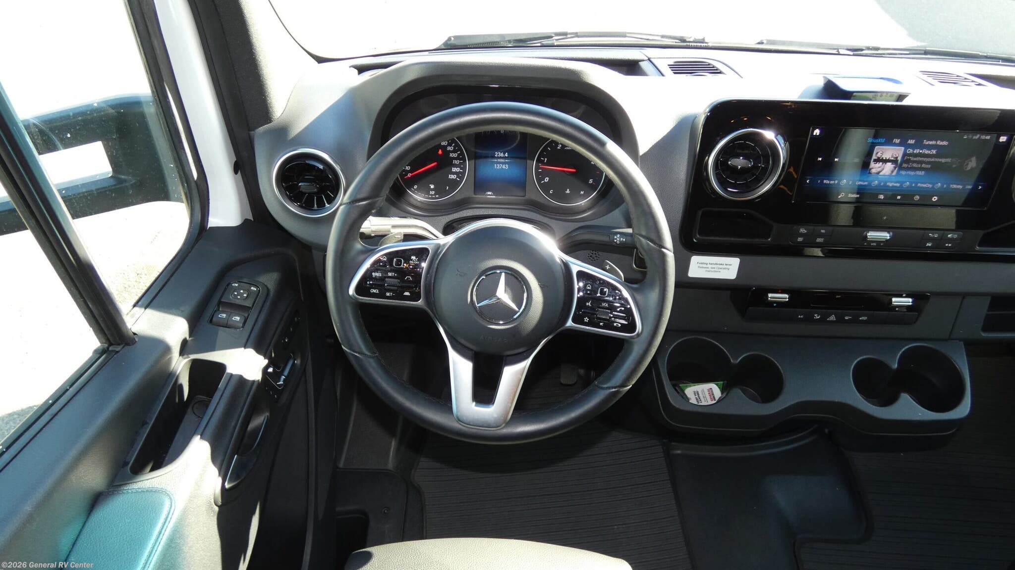 Travel with your favorite person, your family, or a some friends to see nature along the highways, up close and where ever the road takes you! You will find sleeping space for five with the bunk over the cab, the booth dinette, and the versatile queen Murphy bed and sofa combo! You can watch the 32" TV while the cook makes dinner using the convection microwave or cooktop, and the 12V 6.5 cu. ft. refrigerator can hold the cold items. The rear full bathroom gives you privacy and the sliding door saves space. You might like to add a few options to customize your coach such as optional reclining theater seating, or a tri-fold sofa in place of the dinette, a central vacuum system, an overhead entertainment center in place of the bunk, and/or an exterior TV to enjoy under the awning. With each Wayfarer Class C diesel motorhome by Tiffin Motorhomes the Mercedes-Benz chassis delivers smooth, powerful handling with the 7G-Tronic plus 7-speed automatic transmission that helps you accelerate from a stop and conserves fuel on the highway, plus the advanced safety features. The full-body paint system features premium grade paints sealed with three layers of clear coat. The driver's compartment includes the MBUX multimedia system with 10.25" touchscreen, smartphone integration for Apple Carplay and Android Auto, plus black leather, heated, adjustable driver and passenger seats, and luxurious styling and amenities, plus ample storage are found throughout. Choose the extraordinary, take a Wayfarer on the road today!