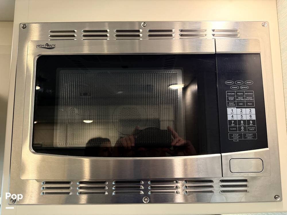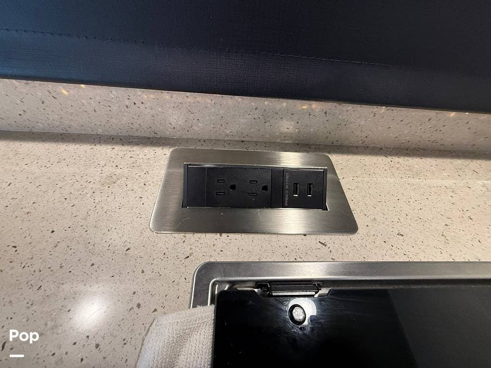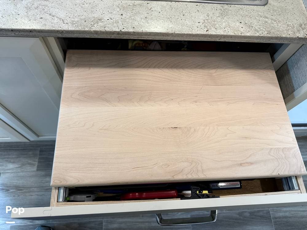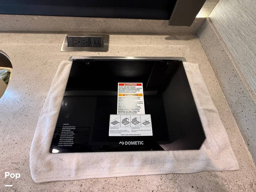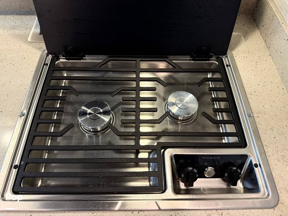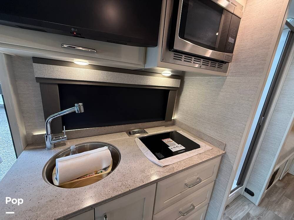 The galley kitchen is equipped with solid-surface countertops, a convection microwave, a refrigerator, a two-burner cooktop, and a stainless steel sink -- everything you need to enjoy meals on the road.
