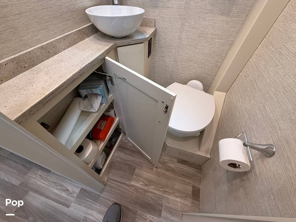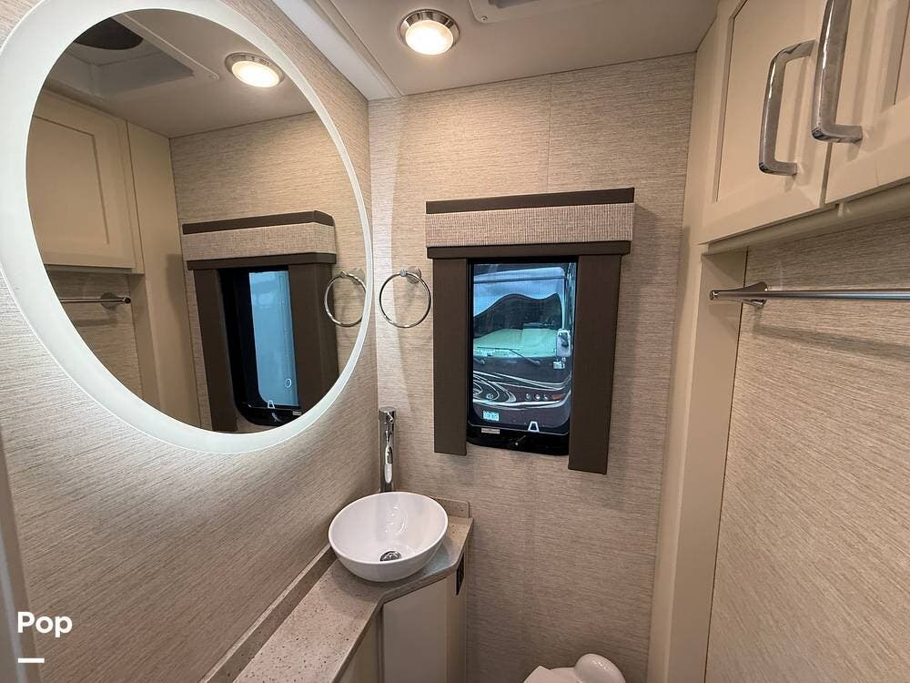 The bathroom features a full shower, vanity, and toilet, maximizing convenience while traveling.