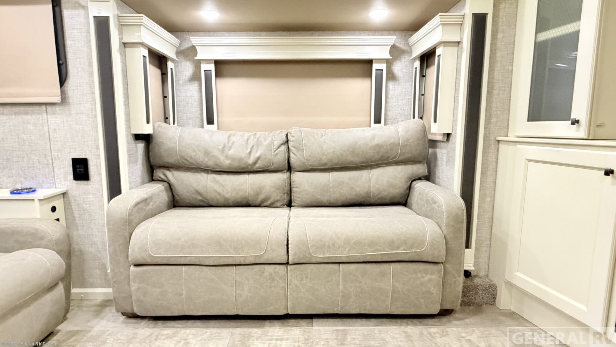 VanLeigh RV Beacon fifth wheel 41FLB highlights: Dual Bath Sinks Five Slides Kitchen Island with Farm Sink Bath and a Half Front Living Area Slide Out King Bed Windshield in Front Cap Invite the grandkids along for your next trip to the Grand Canyon in this fifth wheel. The front living area will be a favorite spot to visit with its dual tri-fold sofas, theater sofa, and 55" Smart TV with a 40" fireplace. The kids can convert this area into their bedroom at night, while you and your spouse enjoy the master bedroom. You'll find plenty of storage space, including two bedroom closets and shelving, a dresser, plus a window seat cabinet for books or throw blankets. The dual bath sinks in the rear bath allow you and your spouse to get ready at the same time, and the kids can use the convenient half bath. In the morning, prepare eggs and bacon on the Insignia oven and cooktop, then dine together at the dinette with chairs. If the weather is nice, you may want to sit under the two patio awnings before hiking the day away! Each Beacon fifth wheel by VanLeigh RV is made with your comfort in mind. From the high-quality Franklin furniture, made in the U.S.A, to the Memory Foam mattress, it's easy to find luxury features at every turn. There are solid surface countertops in each model, along with a stainless steel farm sink, updated cabinetry design, plus new flooring you are sure to love. You will love the sleek look of the full overlay hardwood cabinetry and faceferames, the hand laid vinyl tile flooring, and the updated ceiling treatment. Plan to travel year around with the Whisper Quiet A/C system, the BTU furnace, and the 7,200 BTU electric fireplace, plus each model is constructed with a fully enclosed and heated underbelly with heat return. The outside of the Beacon features two patio awnings, a 2" receiver hitch, new Lippert On-The-Go ladder prep, and the list goes on!