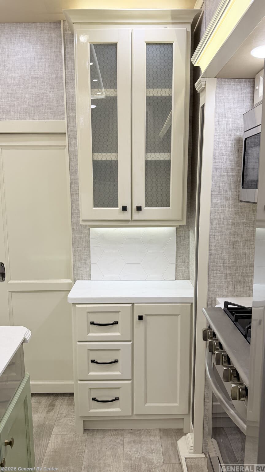 VanLeigh RV Beacon fifth wheel 41FLB highlights: Dual Bath Sinks Five Slides Kitchen Island with Farm Sink Bath and a Half Front Living Area Slide Out King Bed Windshield in Front Cap Invite the grandkids along for your next trip to the Grand Canyon in this fifth wheel. The front living area will be a favorite spot to visit with its dual tri-fold sofas, theater sofa, and 55" Smart TV with a 40" fireplace. The kids can convert this area into their bedroom at night, while you and your spouse enjoy the master bedroom. You'll find plenty of storage space, including two bedroom closets and shelving, a dresser, plus a window seat cabinet for books or throw blankets. The dual bath sinks in the rear bath allow you and your spouse to get ready at the same time, and the kids can use the convenient half bath. In the morning, prepare eggs and bacon on the Insignia oven and cooktop, then dine together at the dinette with chairs. If the weather is nice, you may want to sit under the two patio awnings before hiking the day away! Each Beacon fifth wheel by VanLeigh RV is made with your comfort in mind. From the high-quality Franklin furniture, made in the U.S.A, to the Memory Foam mattress, it's easy to find luxury features at every turn. There are solid surface countertops in each model, along with a stainless steel farm sink, updated cabinetry design, plus new flooring you are sure to love. You will love the sleek look of the full overlay hardwood cabinetry and faceferames, the hand laid vinyl tile flooring, and the updated ceiling treatment. Plan to travel year around with the Whisper Quiet A/C system, the BTU furnace, and the 7,200 BTU electric fireplace, plus each model is constructed with a fully enclosed and heated underbelly with heat return. The outside of the Beacon features two patio awnings, a 2" receiver hitch, new Lippert On-The-Go ladder prep, and the list goes on!
