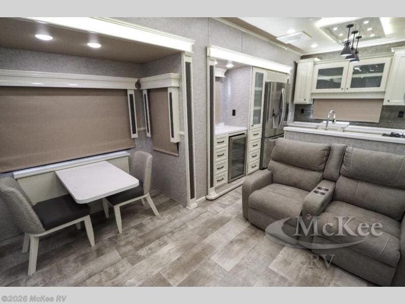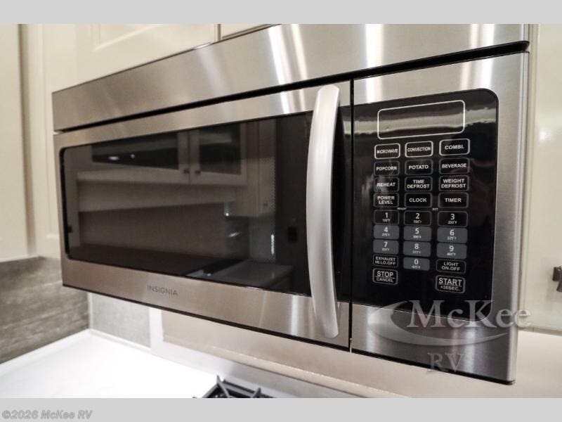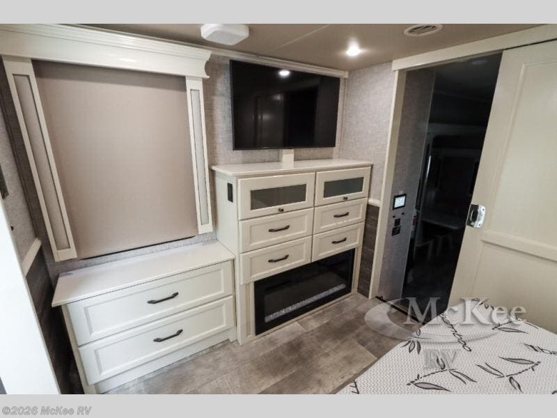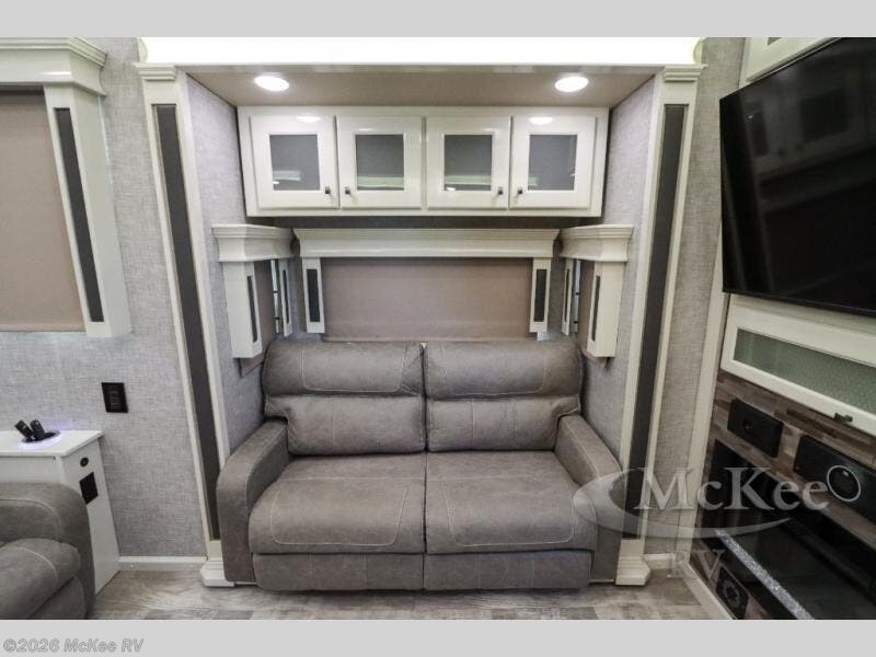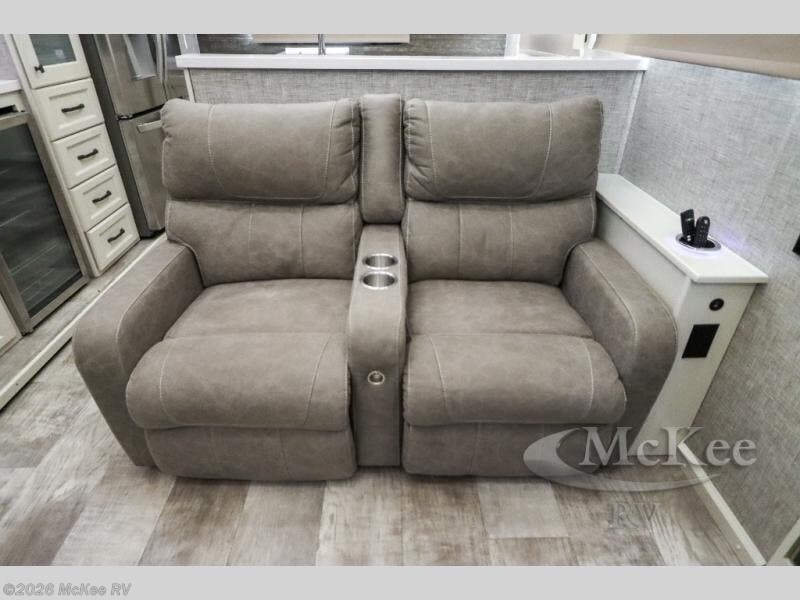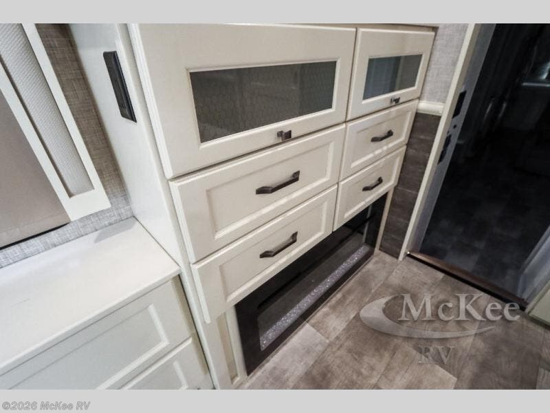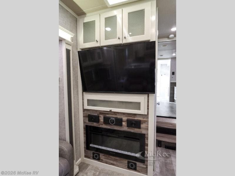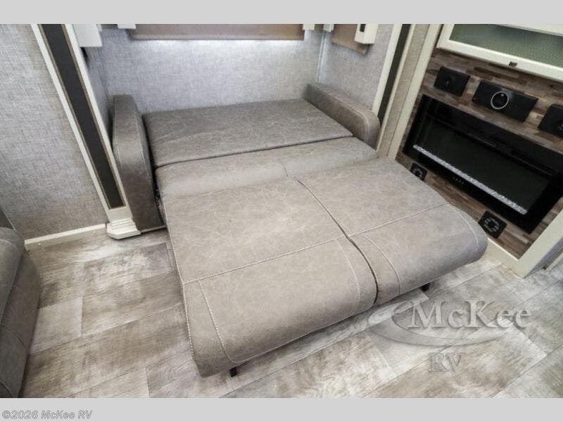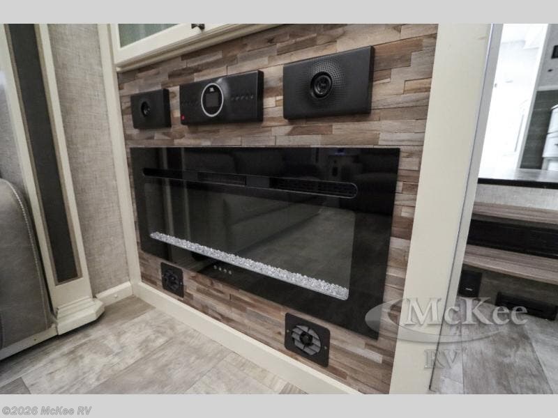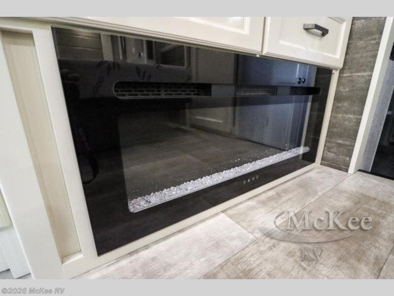 Your family vacations just got a whole lot sweeter in this fifth wheel that can sleep four people each night. Once you arrive at the campground, put out the four slides, then enjoy lunch on the dinette with chairs. The dual opposing slides here will let the kids play a board game on the floor if they want, and you and your spouse can relax on the theater sofa. Prep and cook all your meals in the rear kitchen that includes ample counter space, an Insignia oven and cooktop, plus an optional dishwasher to make cleaning up easier than ever. The master bedroom includes sliding doors to save on space, a king bed, plus a bedroom fireplace for a cozy evening indoors. You will love the front bath with its dual bath sinks, spacious shower, plus a large front closet with tons of storage space. This model also includes a convenient half bath for your guests, now that's what I call luxury!