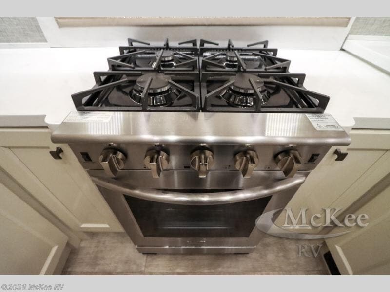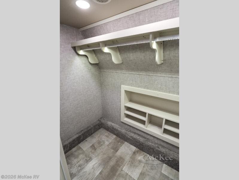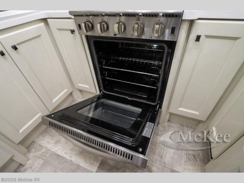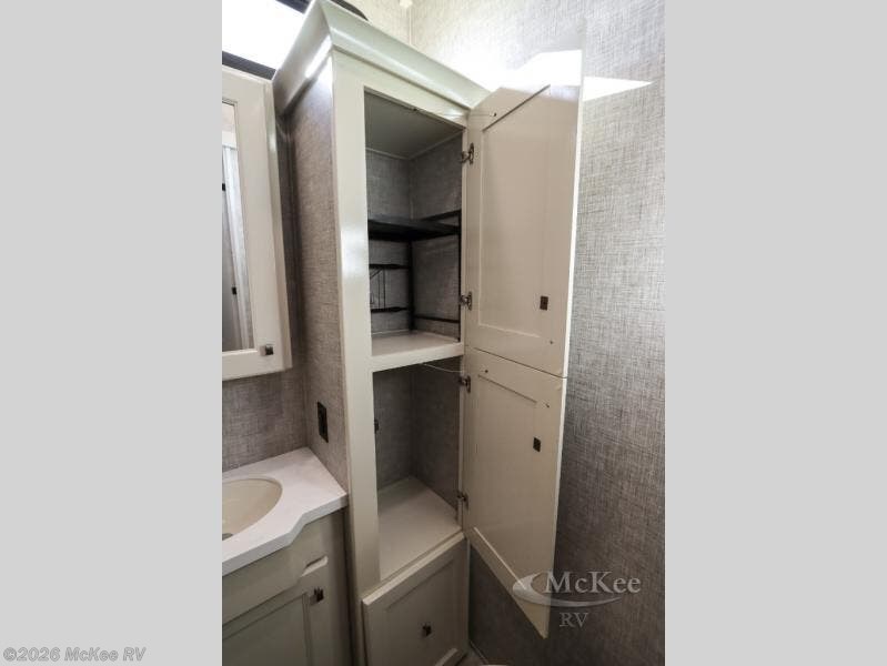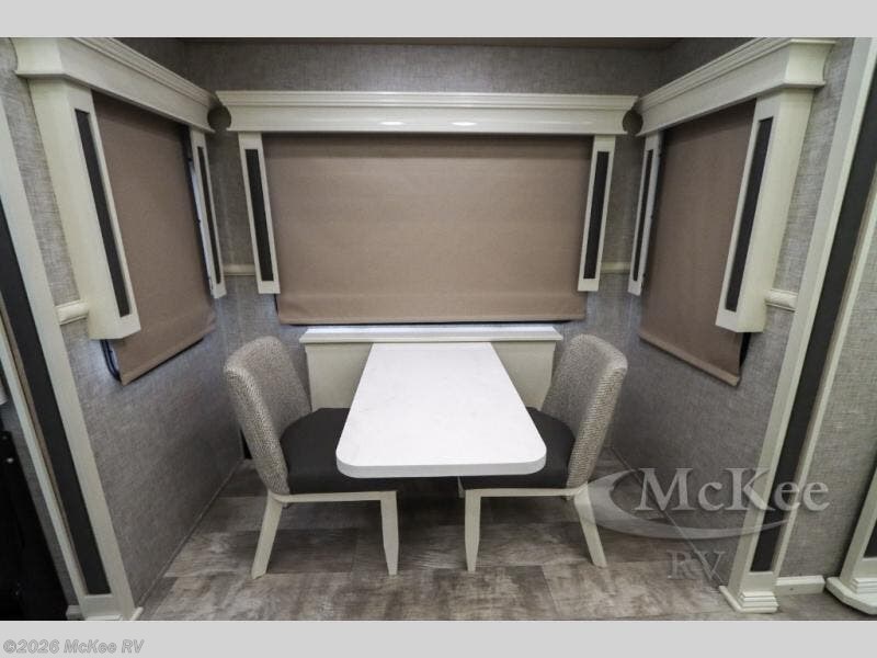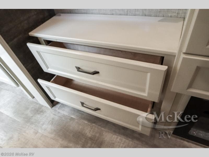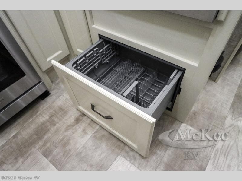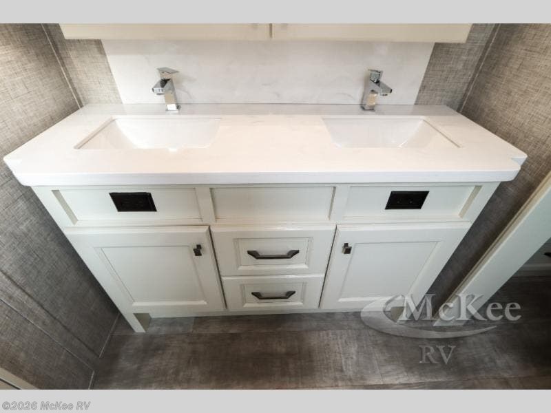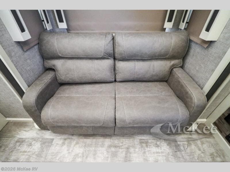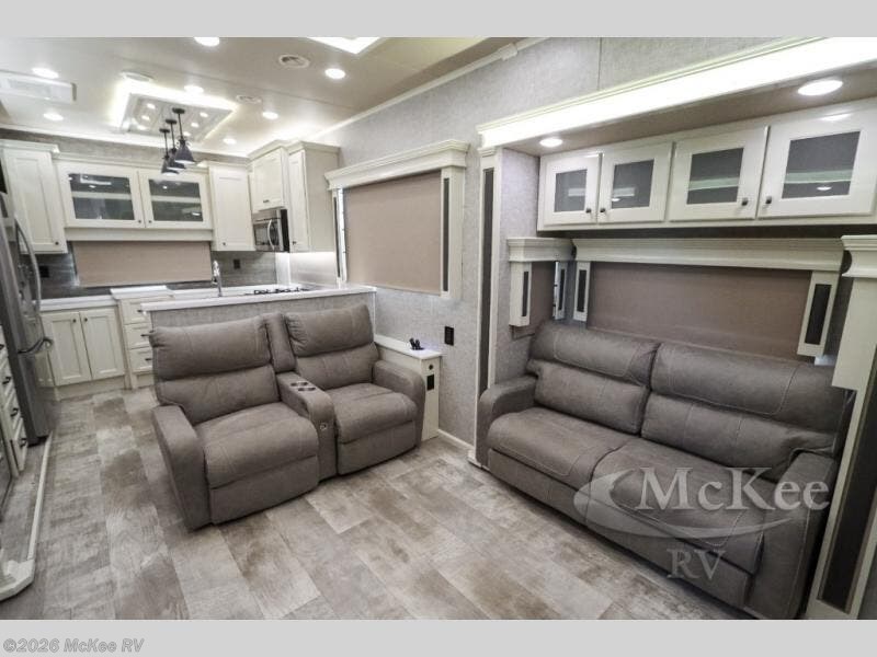 Your family vacations just got a whole lot sweeter in this fifth wheel that can sleep four people each night. Once you arrive at the campground, put out the four slides, then enjoy lunch on the dinette with chairs. The dual opposing slides here will let the kids play a board game on the floor if they want, and you and your spouse can relax on the theater sofa. Prep and cook all your meals in the rear kitchen that includes ample counter space, an Insignia oven and cooktop, plus an optional dishwasher to make cleaning up easier than ever. The master bedroom includes sliding doors to save on space, a king bed, plus a bedroom fireplace for a cozy evening indoors. You will love the front bath with its dual bath sinks, spacious shower, plus a large front closet with tons of storage space. This model also includes a convenient half bath for your guests, now that's what I call luxury!