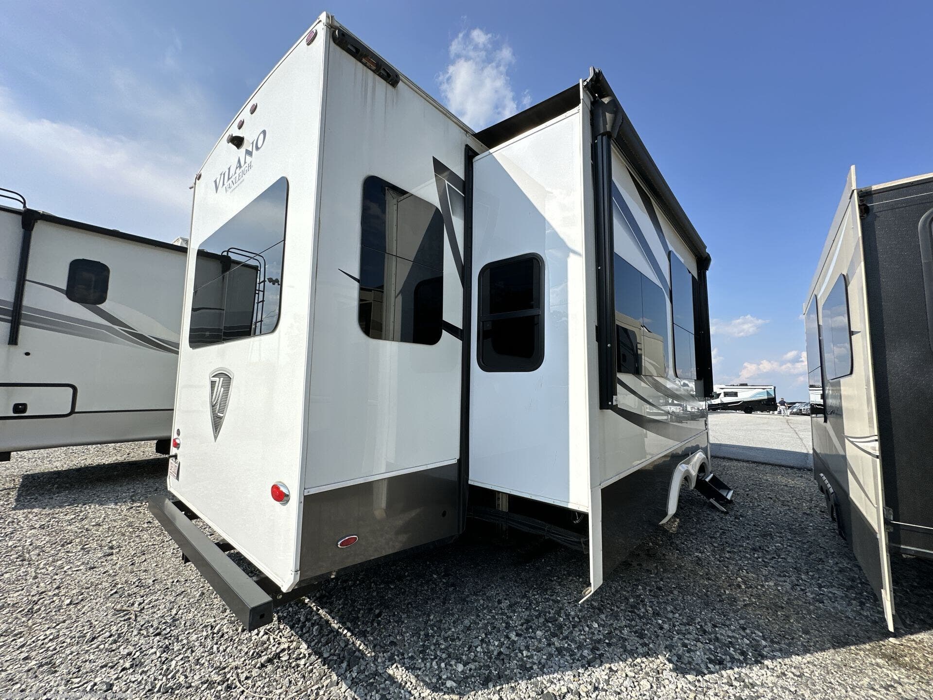 With any Vilano fifth wheel by VanLeigh will you enjoy all the comforts from home with you wherever you go. You can rely on the quality construction materials, such as one-piece sidewalls, laminated slide box end walls, and tubular aluminum upper support walls. Some of the convenient features you are sure to love are the multiplex wiring system with a digital homescreen, the Whisper Quiet A/C system, and the wet bay to manage all things "water" in your fifth wheel. These models include recessed LED ceiling lighting throughout, stainless steel appliances, and solid hardwood cabinetry that will make it feel more like a custom-built home. Each model is prewired for solar panels and back-up camera to make parking easier than ever.