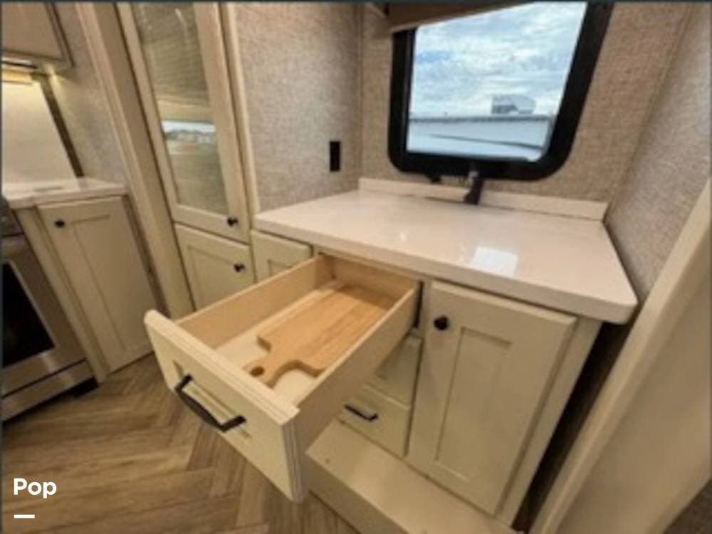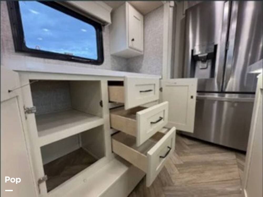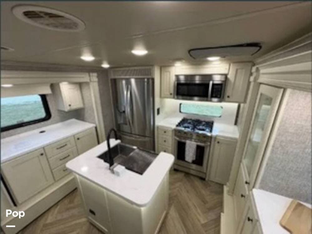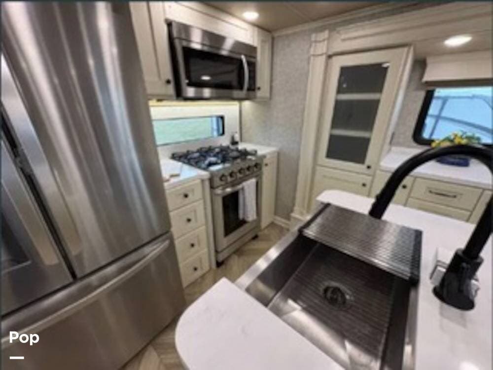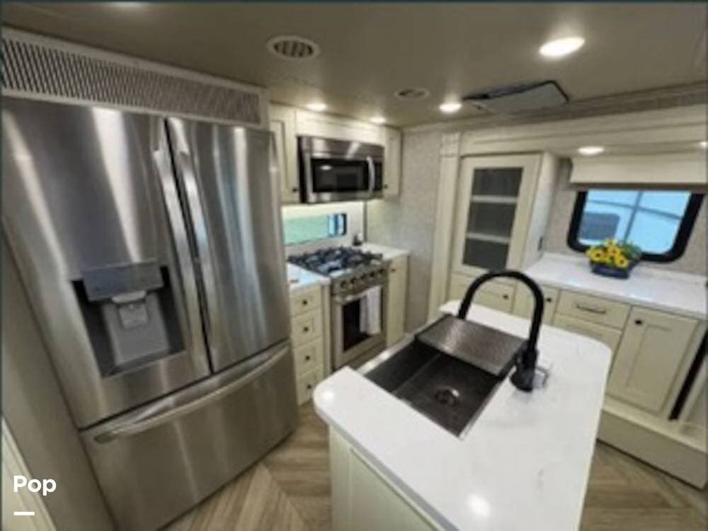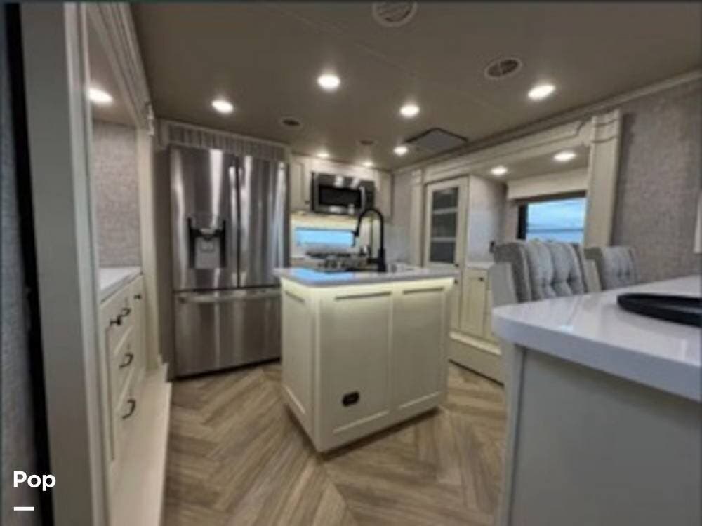 Inside, the rear kitchen layout creates an open and inviting living space that feels more like a high-end condo than an RV. The solid-surface countertops, residential-style appliances, and generous cabinet storage make cooking and entertaining a pleasure.