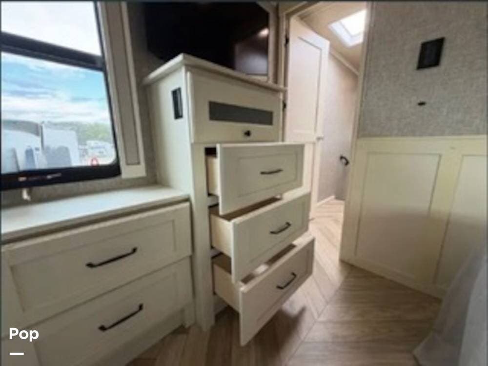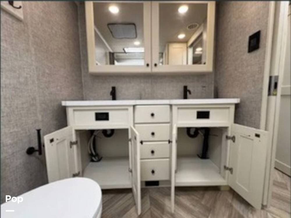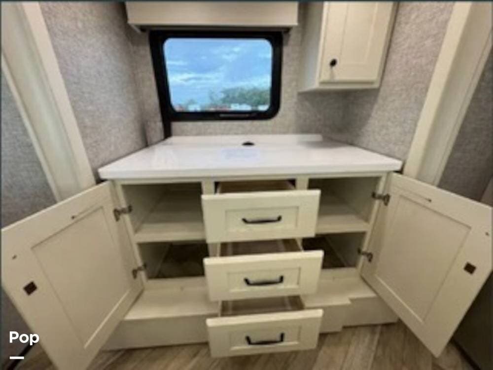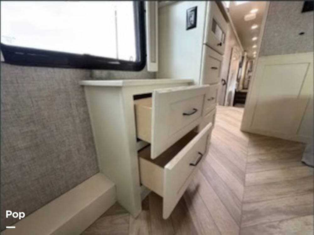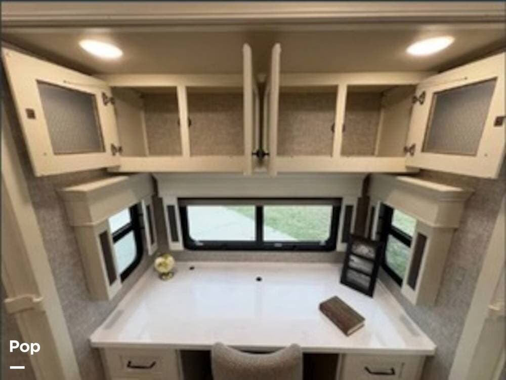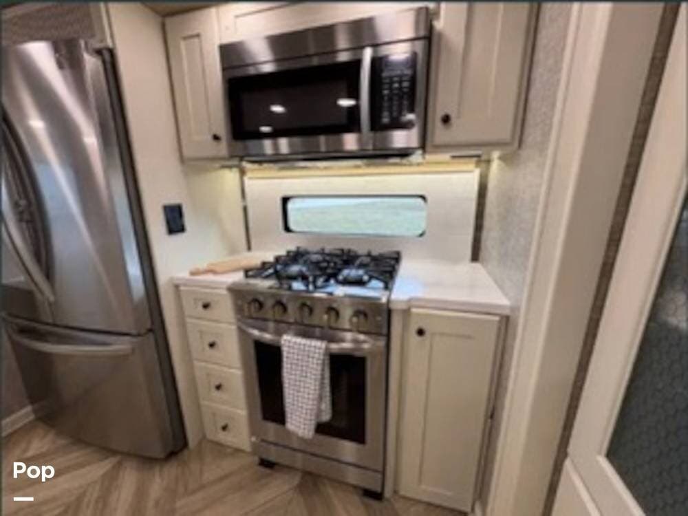 Inside, the rear kitchen layout creates an open and inviting living space that feels more like a high-end condo than an RV. The solid-surface countertops, residential-style appliances, and generous cabinet storage make cooking and entertaining a pleasure.