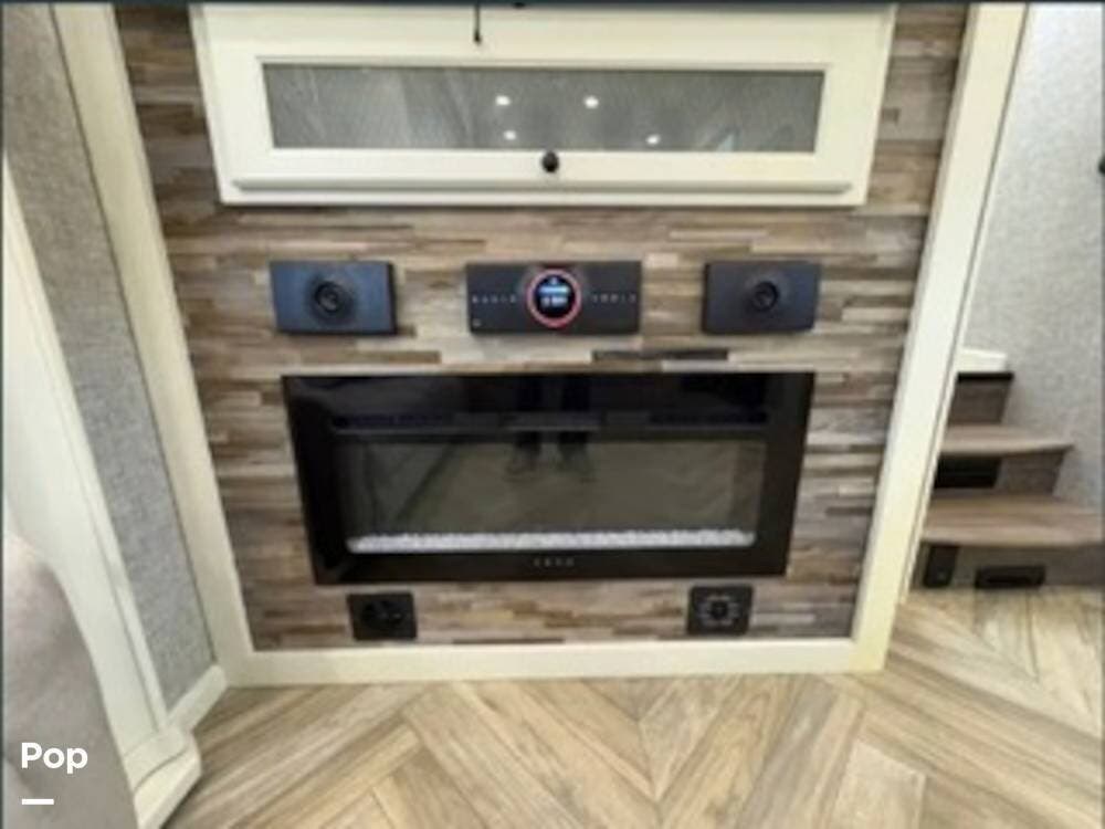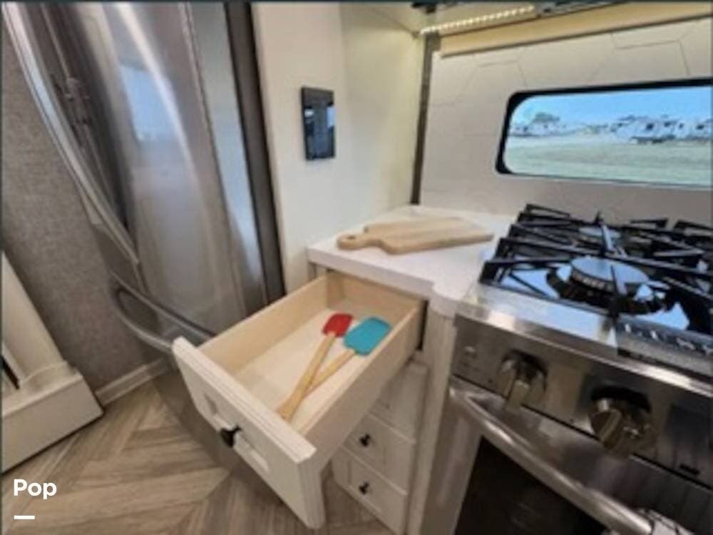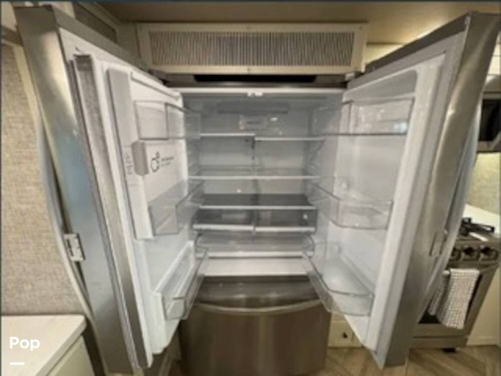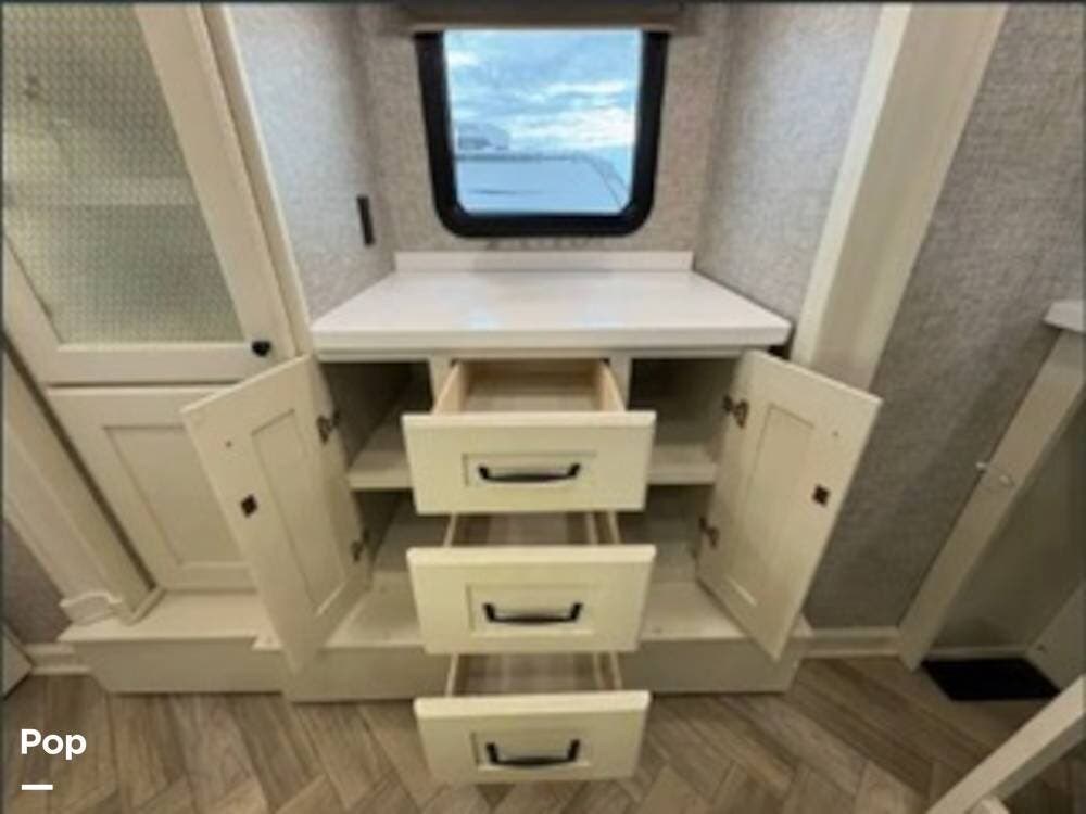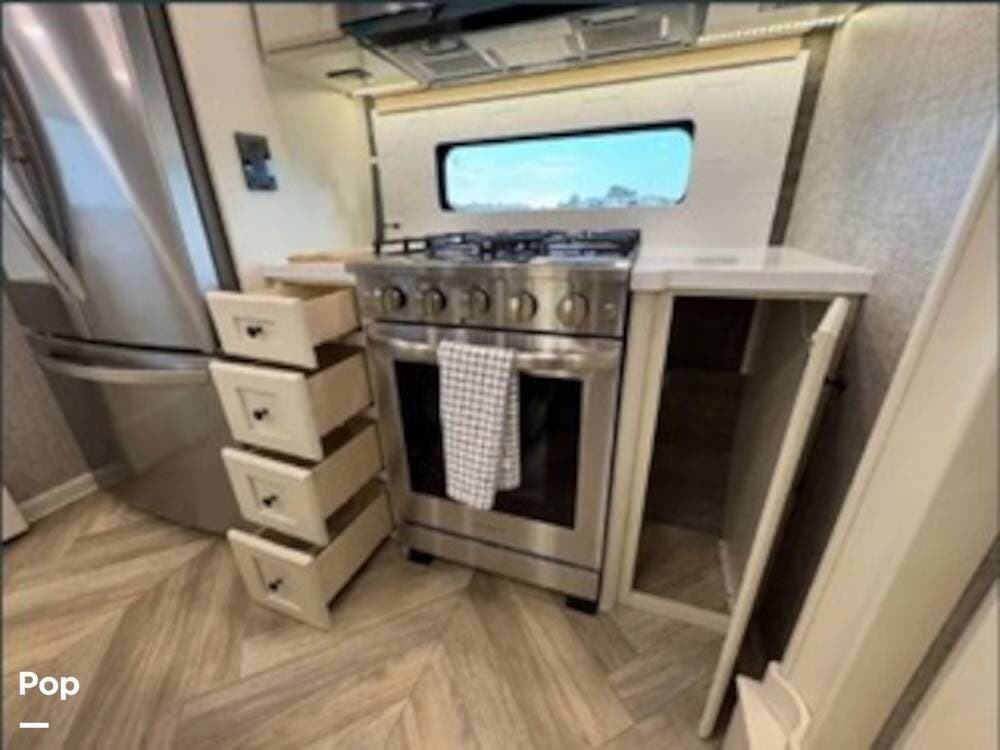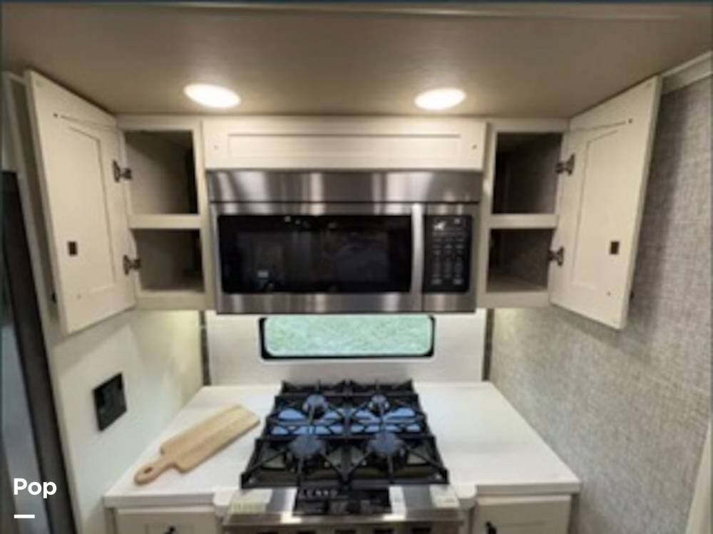 Inside, the rear kitchen layout creates an open and inviting living space that feels more like a high-end condo than an RV. The solid-surface countertops, residential-style appliances, and generous cabinet storage make cooking and entertaining a pleasure.