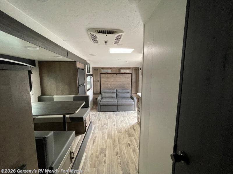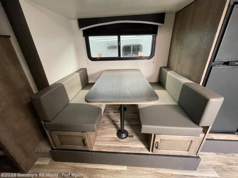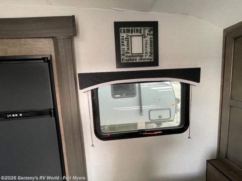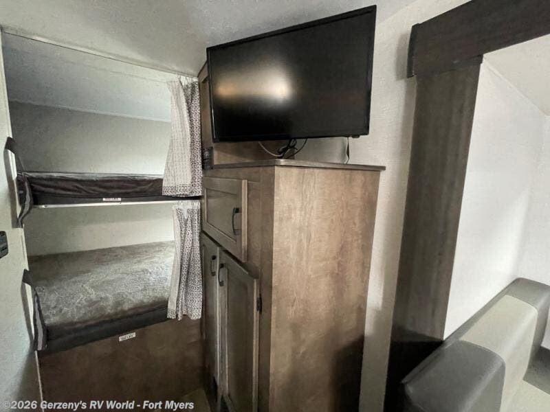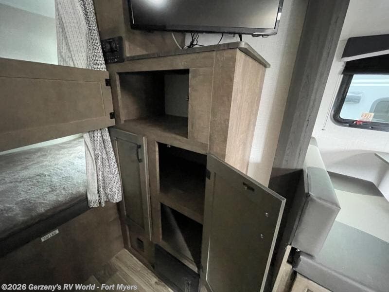 You and your larger group of eight can sleep comfortably in this travel trailer thanks to the Murphy bed up front, the double-size bunks in the rear and the 65" x 48" booth dinette! As the owner you will have the Murphy bed with StorMore bedside nightstands with a 110V outlet and USB charging to keep your phone ready for whatever is next, and the sofa provides a living area up front once the bed is put up into the wall. Your kids or guests will have 48" x 88" bunks and a wardrobe to place their things on the opposite side of the trailer. The cook can make warm meals in the kitchen or outside on the campfire café, and then choose to dine inside at the booth dinette or outside under the 14' power awning after grabbing your camping chairs from the exterior pass-through storage with motion-activated light.