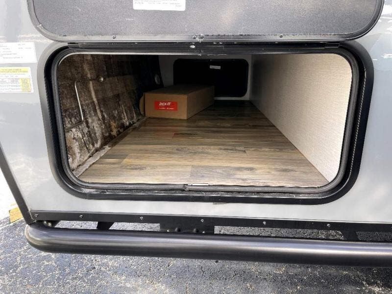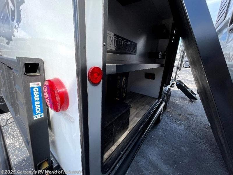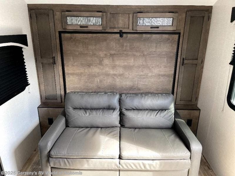 A cook will love this trailer with the choice to make meals inside with full amenities including an 8 cu. ft. refrigerator and a pantry, or outside while using the campfire cafe which offers a griddle and refrigerator, plus counter space to prepare and serve meals. There is sleeping space for four when you utilize the U-shaped dinette slide out that also provides more interior floor space along with the versatile Murphy bed and sofa up front. You will also find a privacy curtain that will section off this area that also features StorMore bedside nightstands with a 110V outlet and USB charging, and two wardrobes.